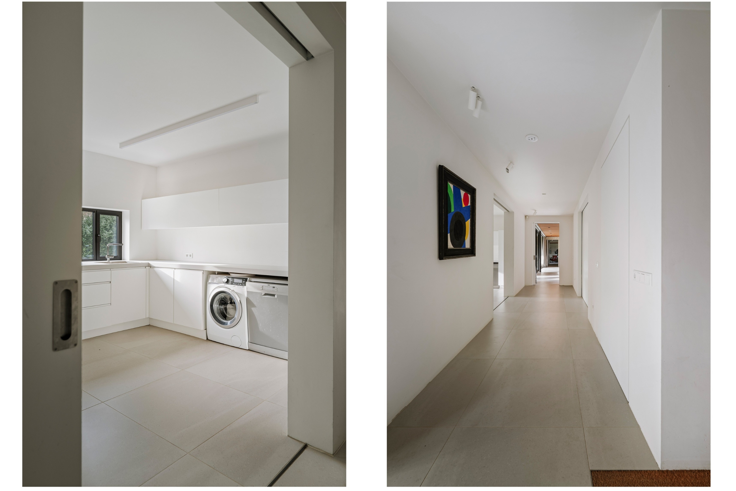 The house is optimally oriented towards the sun. Upon entering, you will find a cloakroom with built-in cupboards, a WC, access to the study and the utility room with the back door. The study near the front door is ideal for a home office. The utility room has a pantry, ceiling-high cupboards and connections for a washing machine and extra dishwasher.