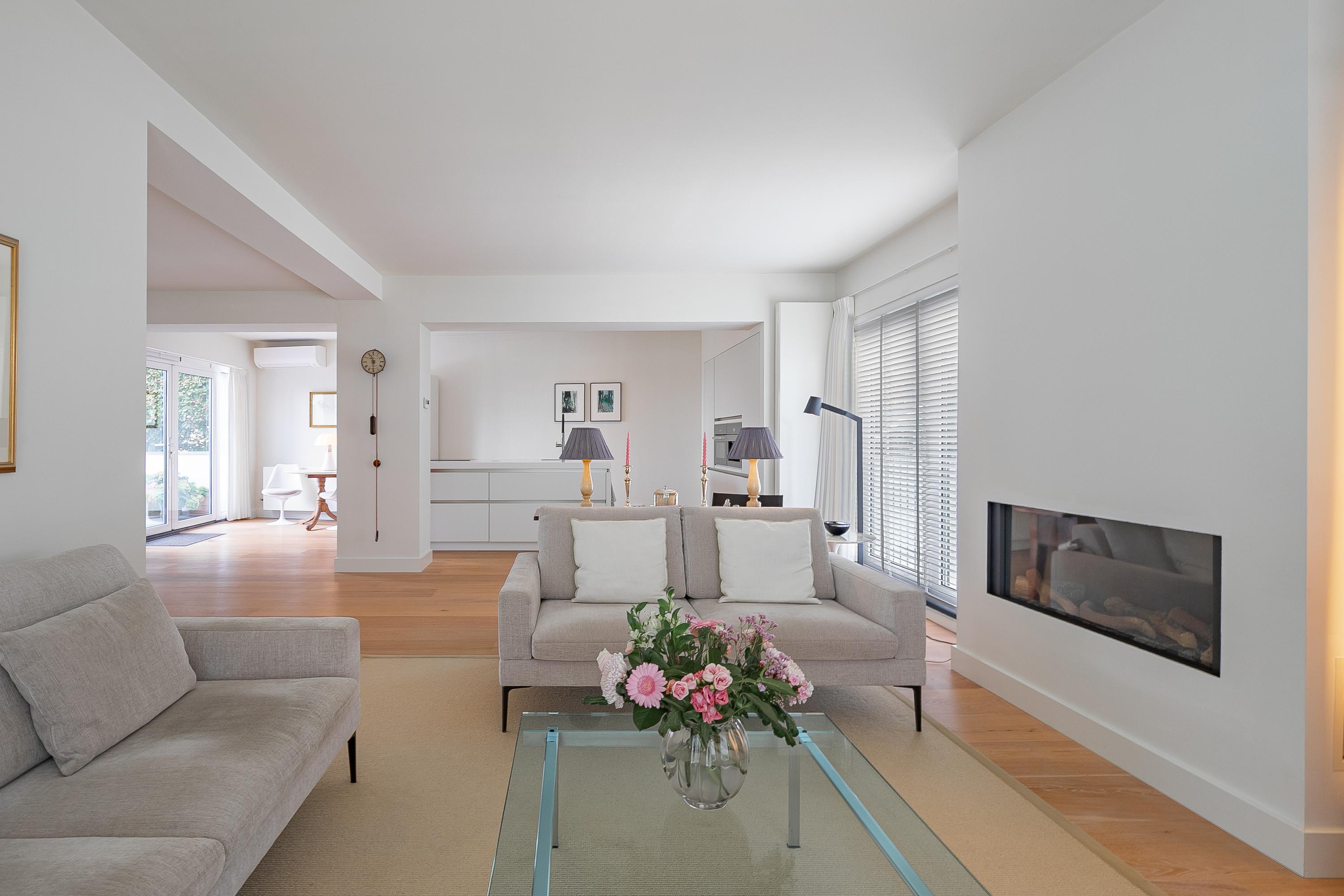 The open-plan ground floor centres on a spacious living space of approximately 68m², distinguished by oak parquet flooring, a custom Faber gas fireplace, and designer radiators. A handle-free kitchen with a five-zone induction hob, convection oven, built-in coffee machine, and sliding doors to the garden invites effortless daily rhythm and entertaining. The living area transitions to a sheltered northeast-facing city garden and a leafy front courtyard catching the evening sun.