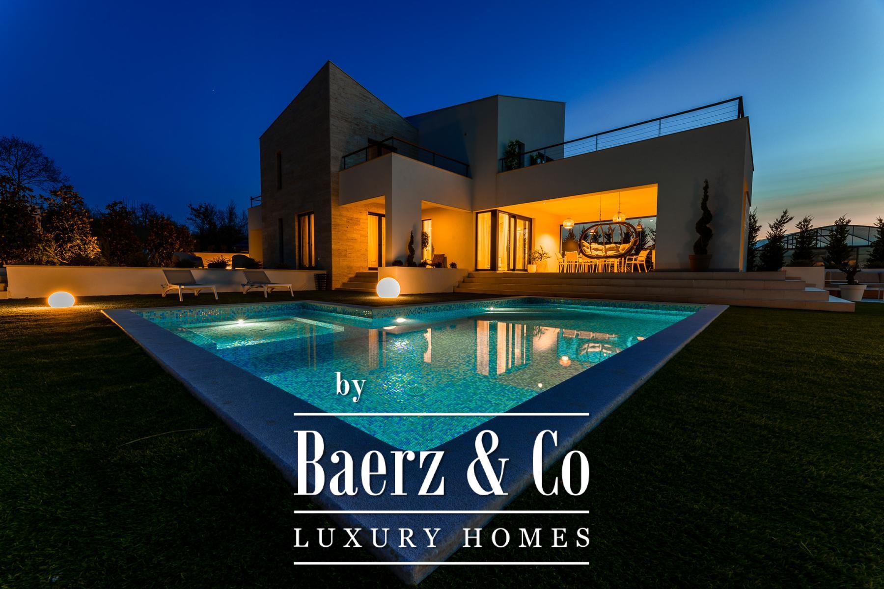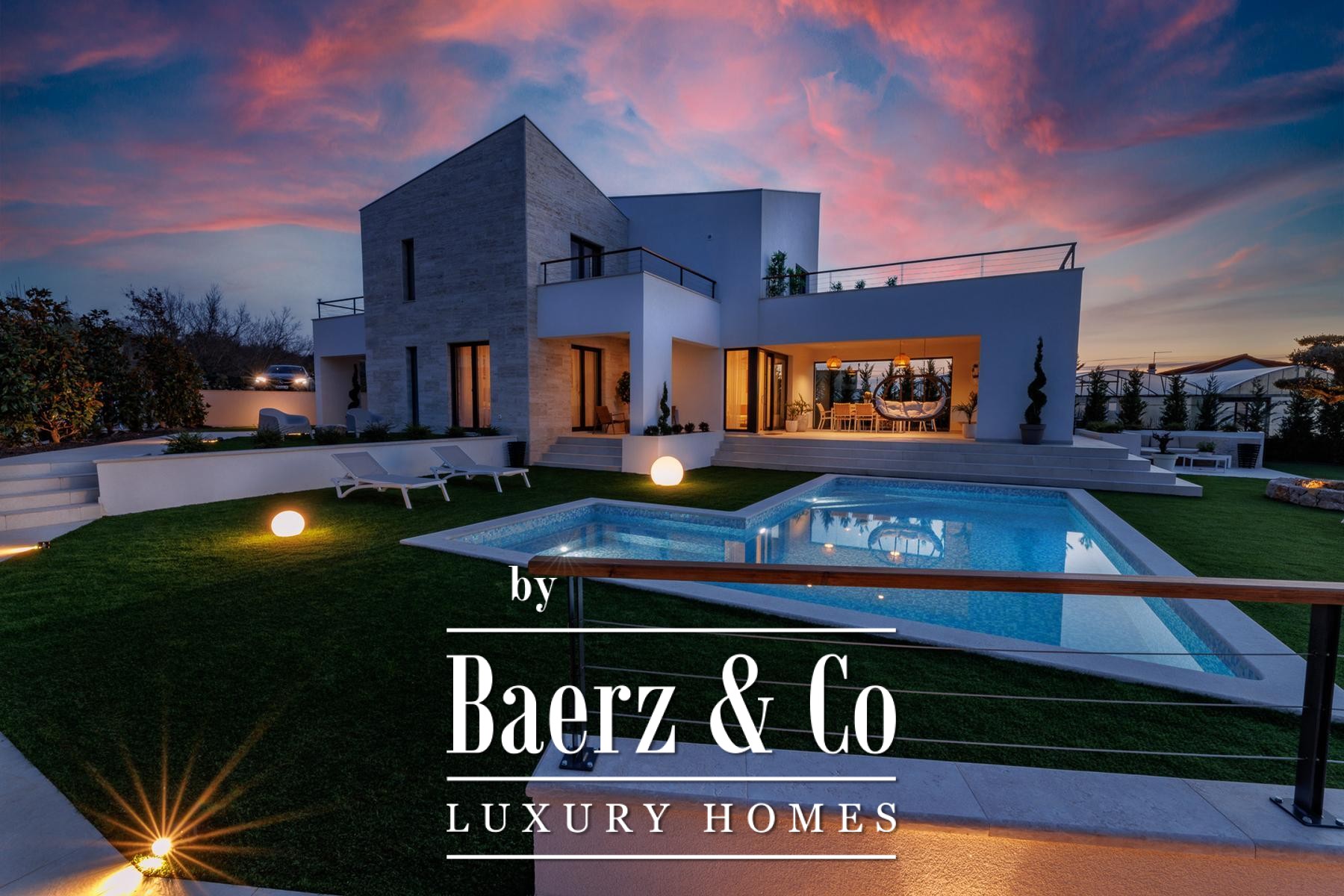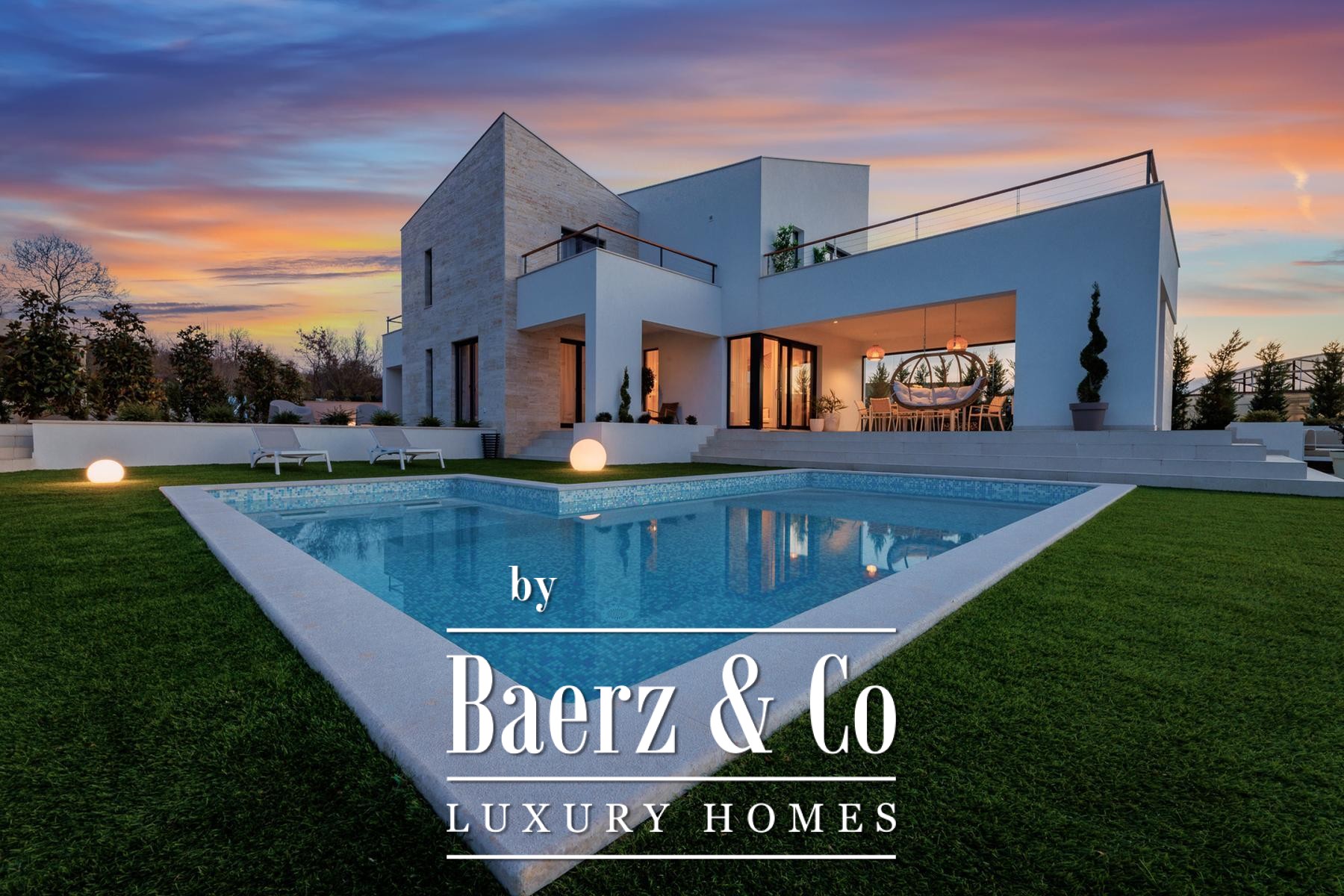 Island of Krk, Malinska, exceptional, modernly designed villa, located in the idyllic and peaceful surroundings of the island of Krk, only 2 km from the lively center of Malinska and crystal clear beaches. With a total net area of 390m2, it is spacious and perfectly arranged for a luxurious life.The villa is developed over three floors, including a functional basement, a spacious ground floor and an upper floor, all built on a plot of 826m2. In the basement there is an impressive space for socializing, which includes a wine shop, a gym, a children's playroom and a spa area with a Finnish sauna and a relaxing corner ideal for relaxation.The ground floor is characterized by an open concept kitchen and dining room, and a large living room surrounded by glass walls that provide an unobstructed view of the outdoor terrace and pool. There is also a luxuriously