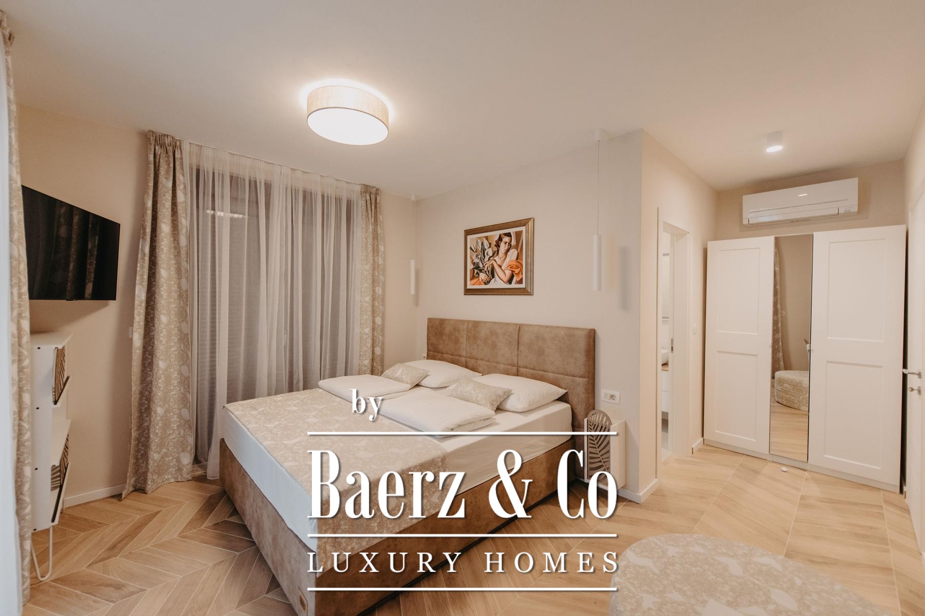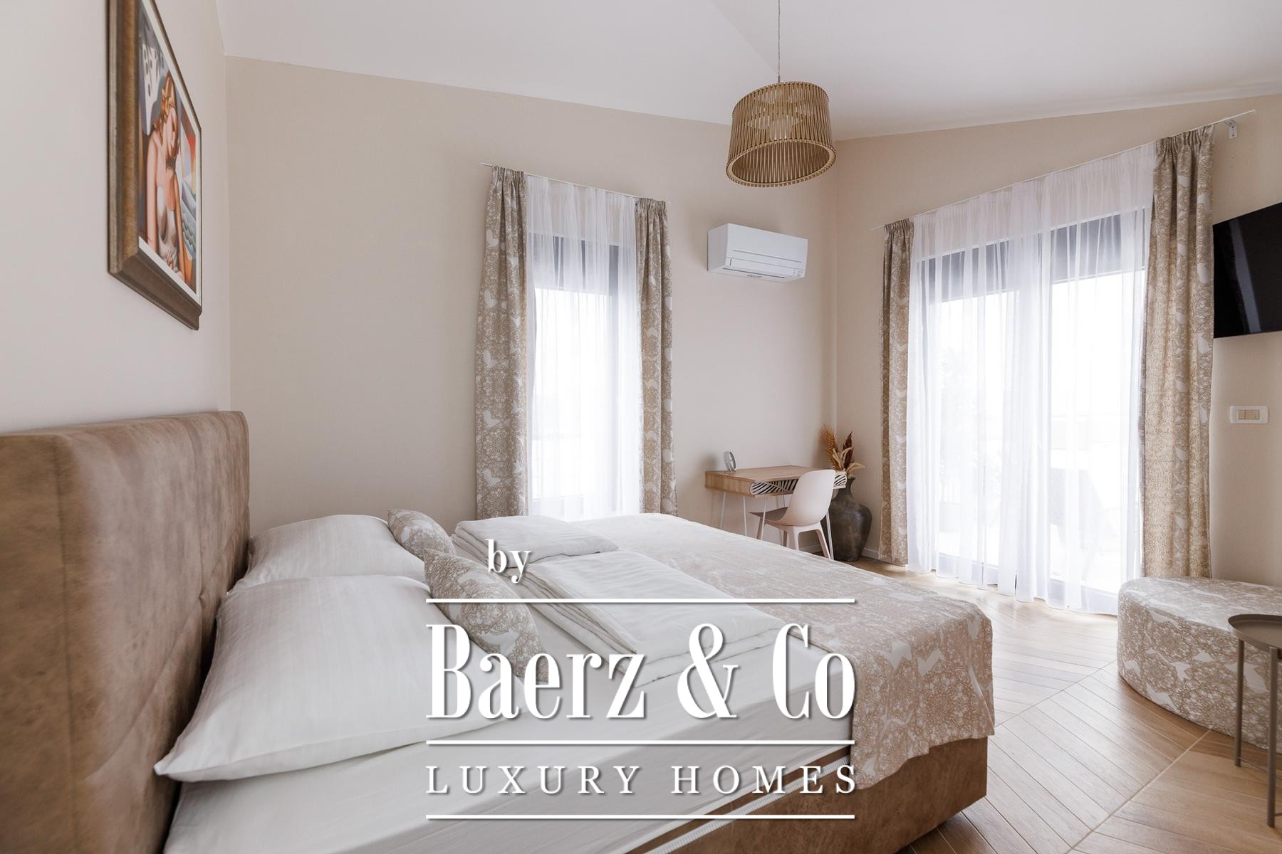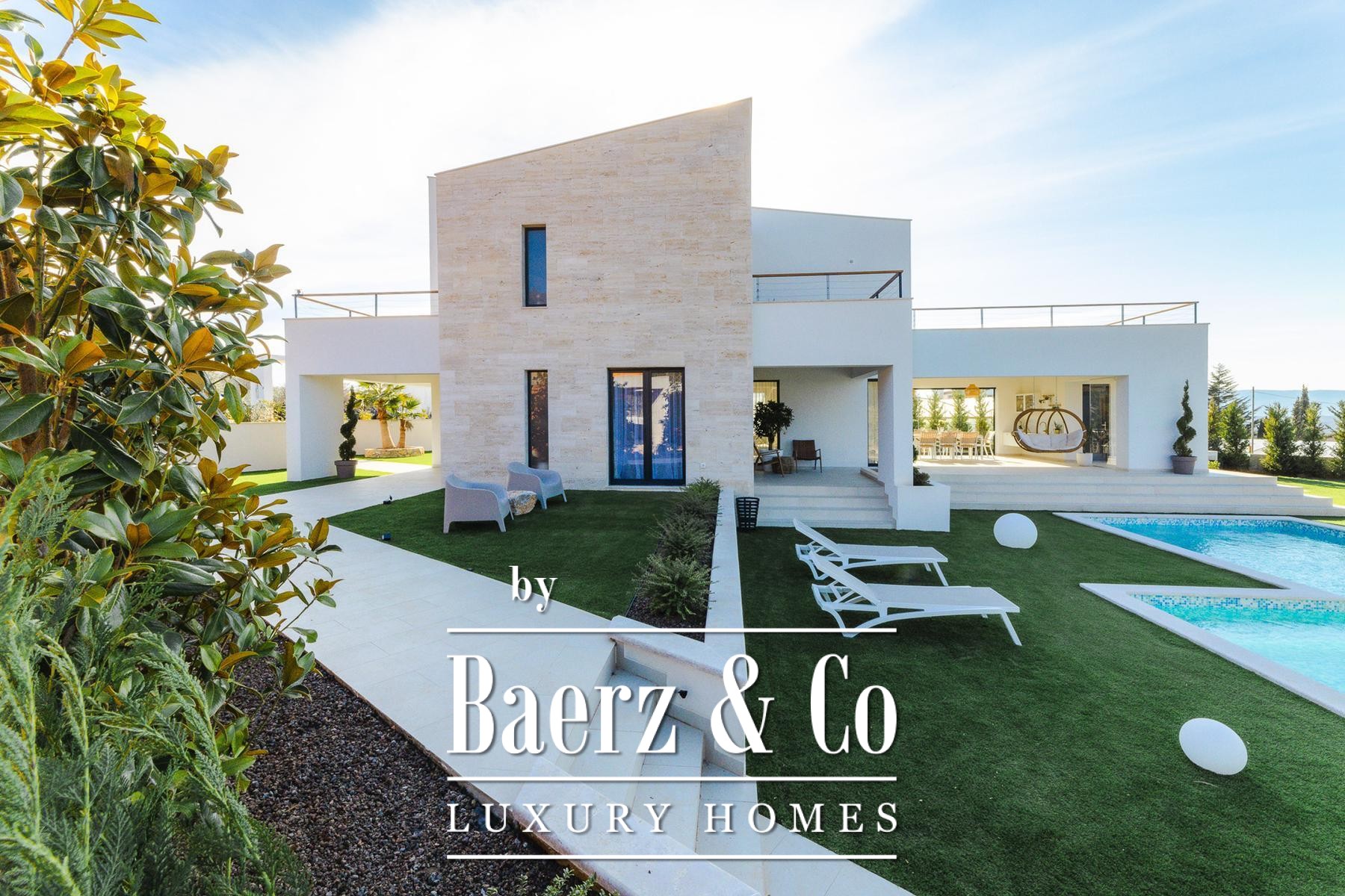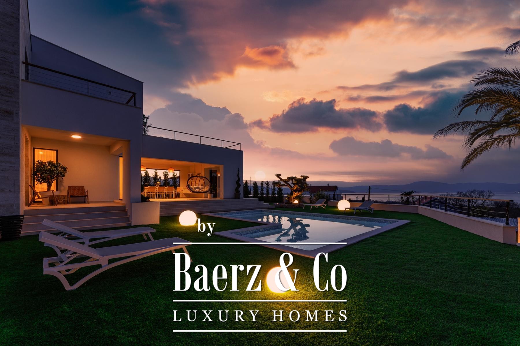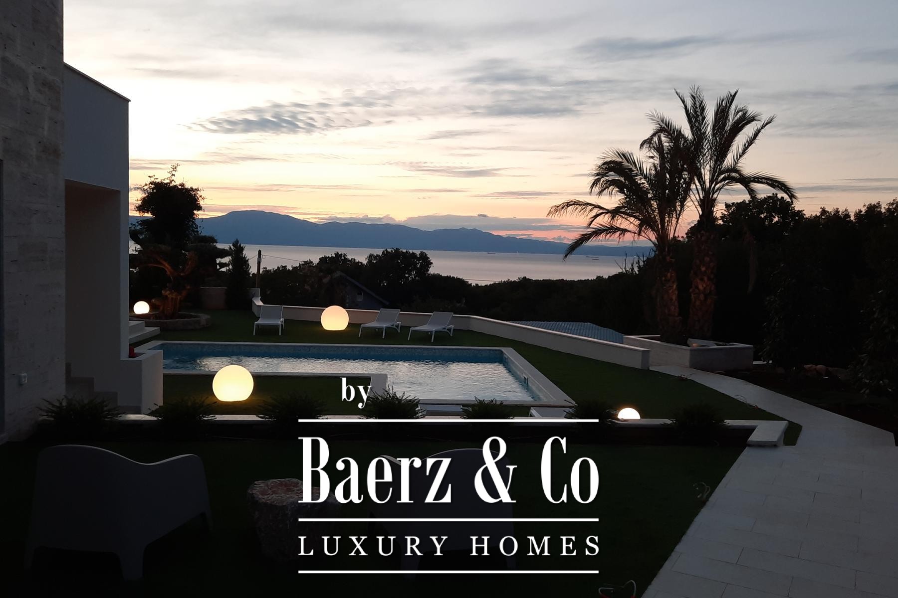 furnished bedroom with a private bathroom and a terrace.A marble staircase leads to the upper floor where there are two additional bedrooms with double beds and private terraces that offer an enchanting view of the blue of Kvarner, and another room with separate beds and a toilet.The exterior of the villa is equally impressive, with a beautifully landscaped garden of 700 m2 that contains a swimming pool, a sundeck and a terrace with a grill area, ideal for outdoor gatherings and enjoying the sun.The villa also offers a spacious garage of 45m2 with capacity for two cars and several parking spaces. With modern equipment and superb design, this villa represents an extraordinary opportunity for those looking for an exclusive home or investment in one of the most beautiful locations on the Adriatic.We are at your disposal for any additional information.
