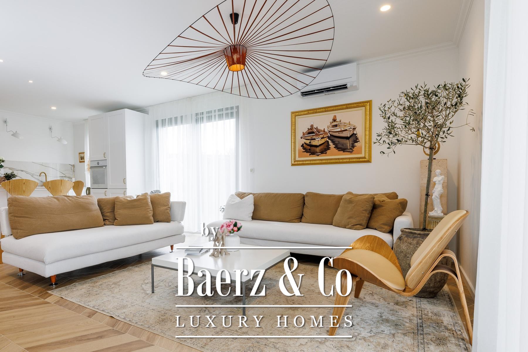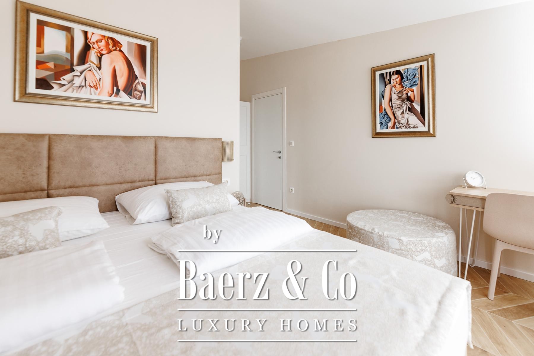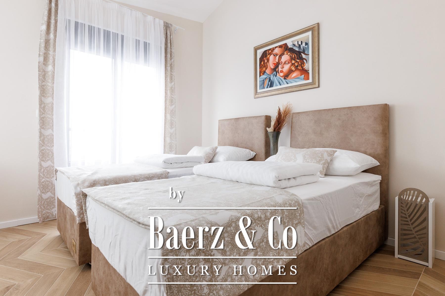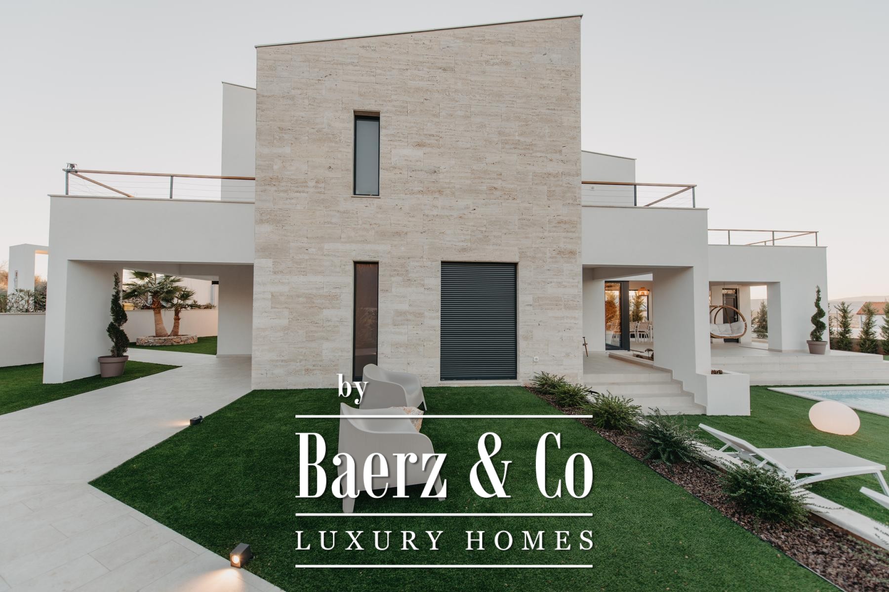 furnished bedroom with a private bathroom and a terrace.A marble staircase leads to the upper floor where there are two additional bedrooms with double beds and private terraces that offer an enchanting view of the blue of Kvarner, and another room with separate beds and a toilet.The exterior of the villa is equally impressive, with a beautifully landscaped garden of 700 m2 that contains a swimming pool, a sundeck and a terrace with a grill area, ideal for outdoor gatherings and enjoying the sun.The villa also offers a spacious garage of 45m2 with capacity for two cars and several parking spaces. With modern equipment and superb design, this villa represents an extraordinary opportunity for those looking for an exclusive home or investment in one of the most beautiful locations on the Adriatic.We are at your disposal for any additional information.