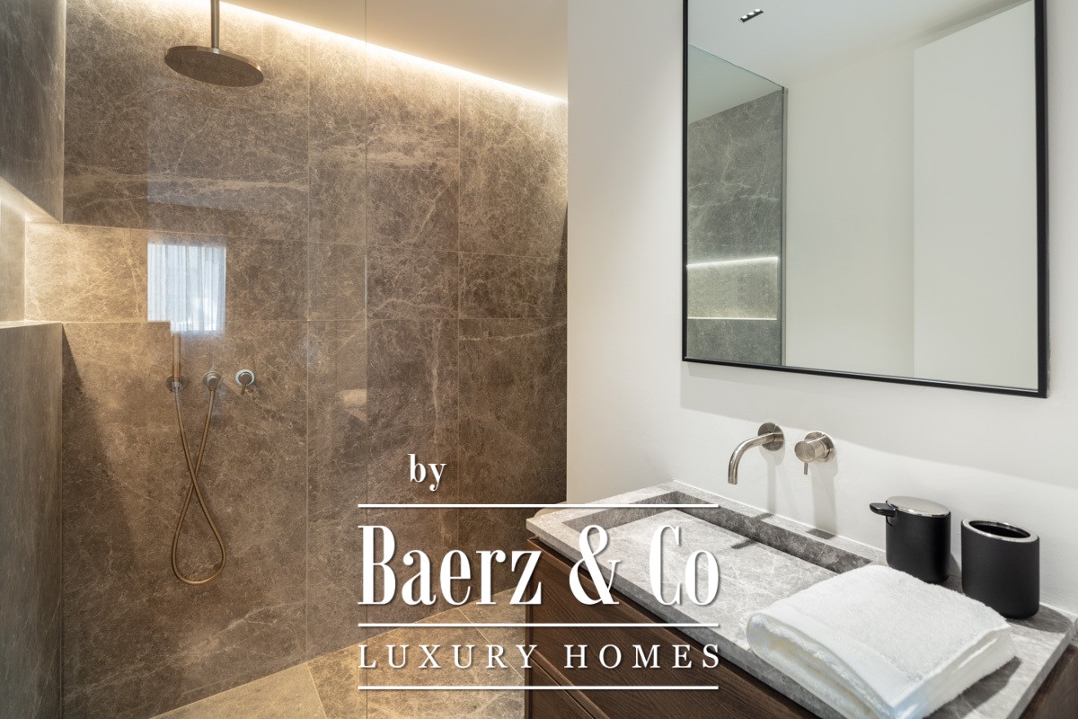 The kitchen features marble finishes and a concealed appliance setup, supporting both refined entertaining and effortless daily living. The covered, expansive terrace extends the living space outward for alfresco dining and relaxation, with direct access from the master suite and living area. Each of the three bedrooms maintains its own en-suite bathroom, finished in the finest materials. The master suite, with its privacy glass partition and grey stone double vanity, offers a discreet space to unwind.