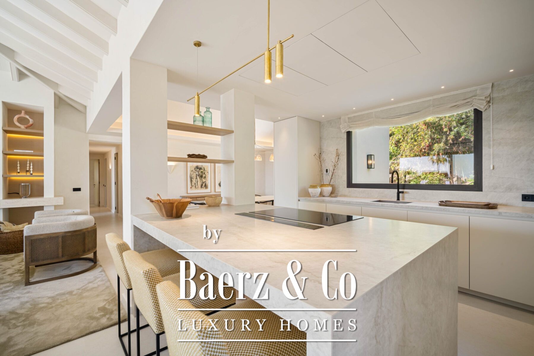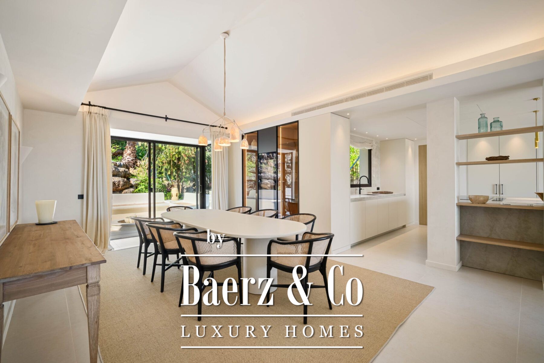 Villa Marbella with Sea and Mountain Views sits quietly in Nueva Andalucía, minutes from Los Naranjos Golf Course and close to Marbella’s celebrated beaches and dining. This fully renovated single-level villa, with 241 m² of living space and set on an 855 m² elevated plot, captures the essence of Mediterranean life. The main living area is defined by its open-plan design, vaulted ceilings, and a palette of soothing natural tones. Light moves freely throughout, courtesy of floor-to-ceiling glass doors that lead to a generous terrace, where an infinity-edge pool appears suspended above the valley. From both inside and the rooftop terrace, expansive views reach across the valley to meet the sea.