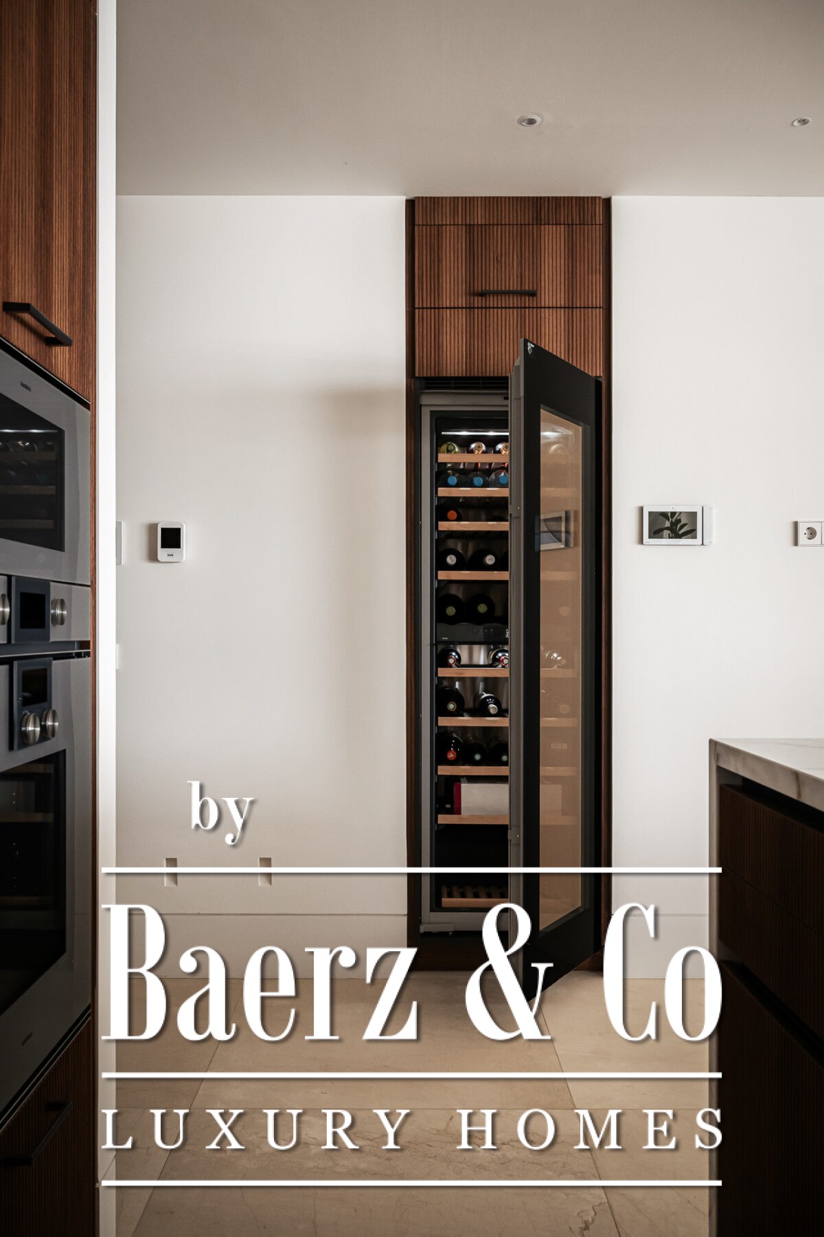 Arriving through a central hall, the apartment’s layout divides efficiently between social and private zones. The open-plan living area flows into a kitchen appointed with Gaggenau and Miele appliances, a striking floor-to-ceiling wine display, and fully automated glazing that merges indoor living with the terrace. In the private wing, the master suite features a walk-in wardrobe and full bathroom, accompanied by two further en-suite bedrooms facing the tranquil gardens. Additional amenities include a laundry room, smart home systems, premium materials throughout, and two garage spaces with a registered electric buggy and storage room.