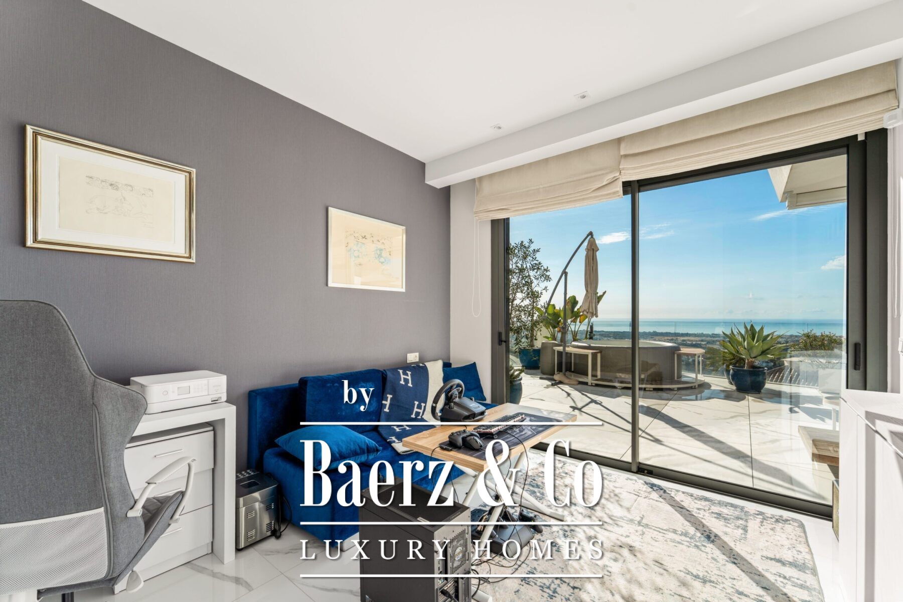 The living experience revolves around an expansive 102-square-meter terrace, its sunlit expanse accessible privately from each of the three bedrooms. The principal suite offers a dedicated en-suite while two additional bedrooms share adjacent bathrooms, balancing comfort for families or guests with the orientation of each room toward uninterrupted views. The terrace is a space for calm or convivial gatherings, equipped with a jacuzzi and generous zones for dining and relaxation, all set against the backdrop of Mediterranean light.
