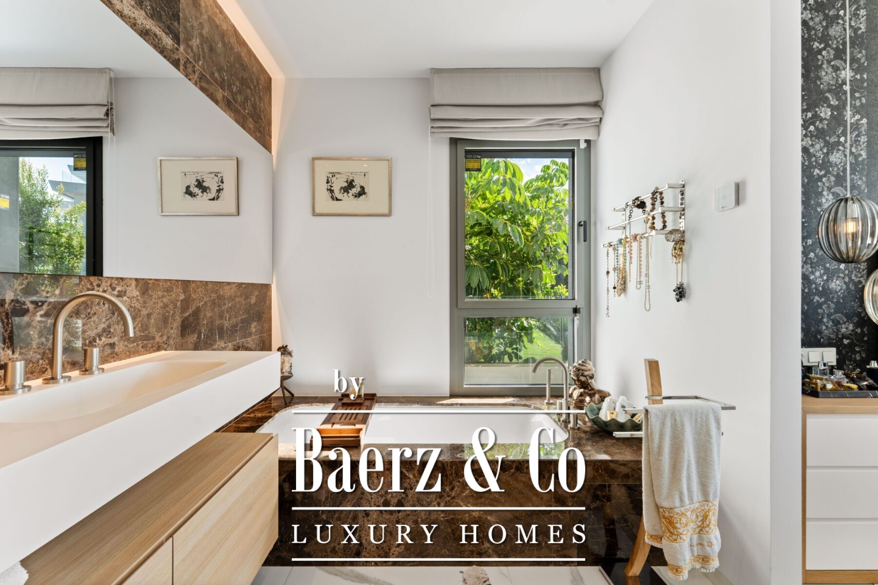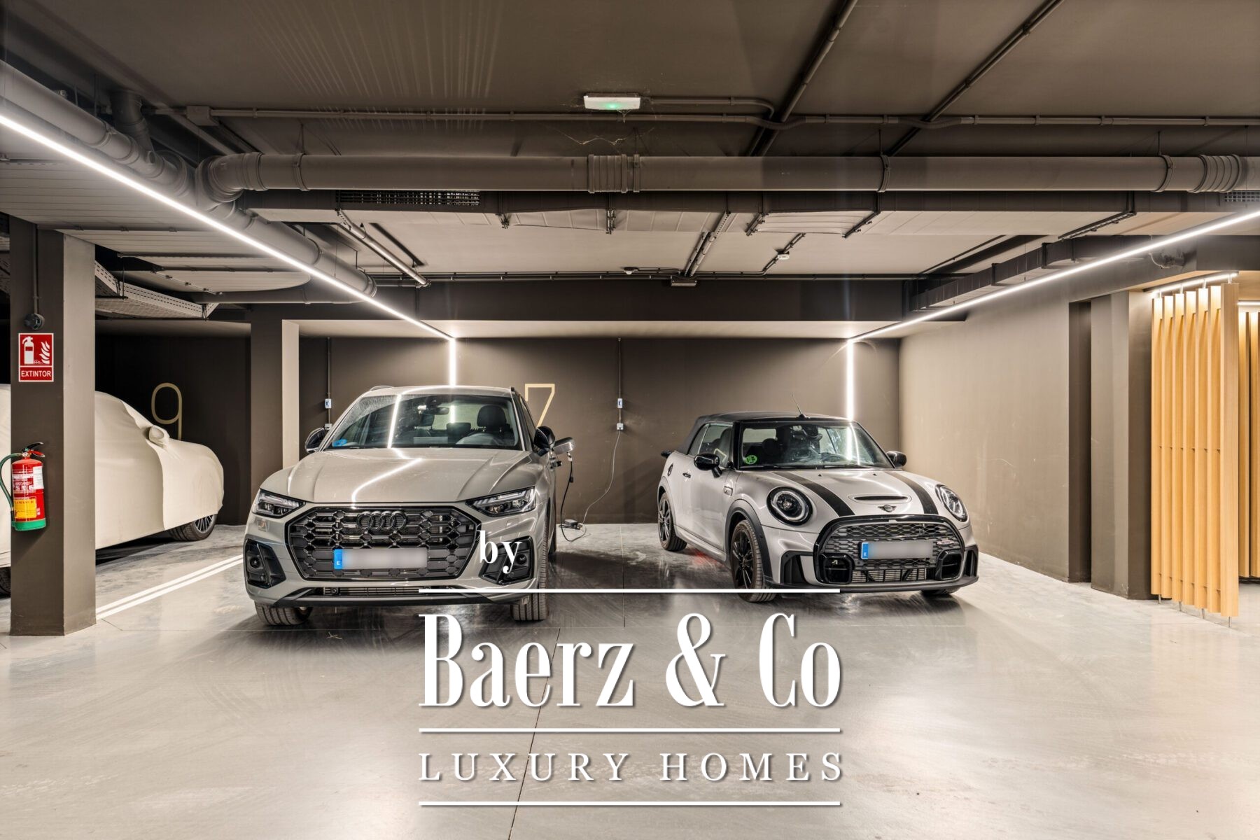 Indoors, open-plan living, dining, and kitchen areas harmonise contemporary Scandinavian tone with functional sophistication. Features such as floor-to-ceiling doors, Miele appliances, stone worktops, electric blinds, underfloor heating, and a guest WC contribute to a cohesive, comfortable atmosphere. Two underground parking spaces and a storage room ensure practical luxury.