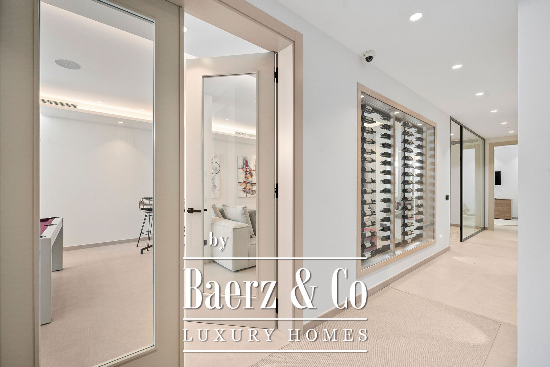 Each space is curated for comfort and flexibility. The main floor welcomes guests with ample living and dining zones, while the upper level promises tranquil mornings from two private terraces adjoined to the master suite. Downstairs, a private cinema, games room, gym, and wine bodega make leisure a daily ritual. Electric underfloor heating in basement bathrooms and a garage add functional luxury.