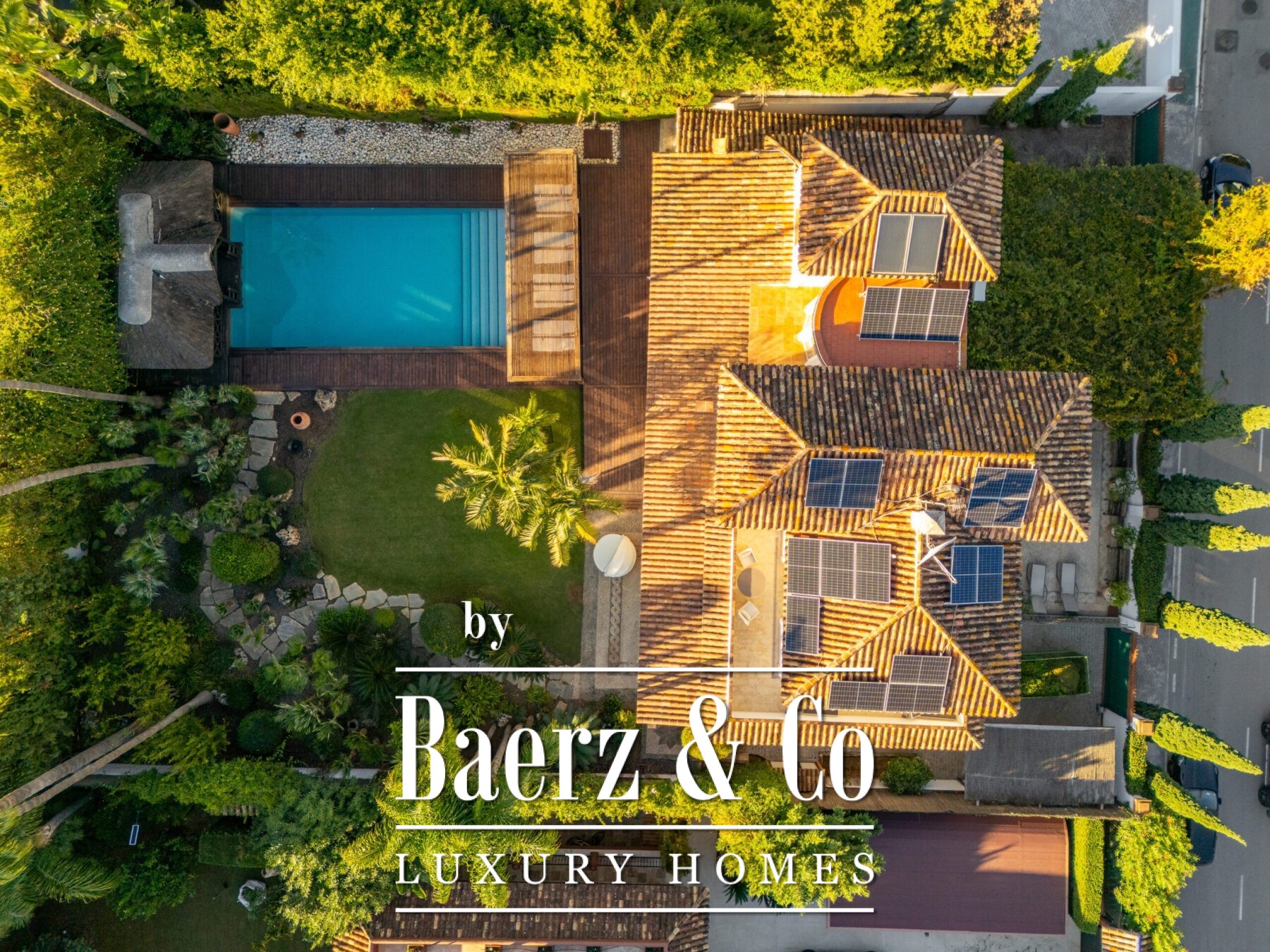 On the main level, an open-plan kitchen with high-end appliances flows to the garden, complementing a living space enriched by a fireplace and full-height windows. Light saturates every room from east to west, underscoring the villa's harmonious connection to its surroundings. A guest suite and an additional bedroom with its own bath ensure versatility.