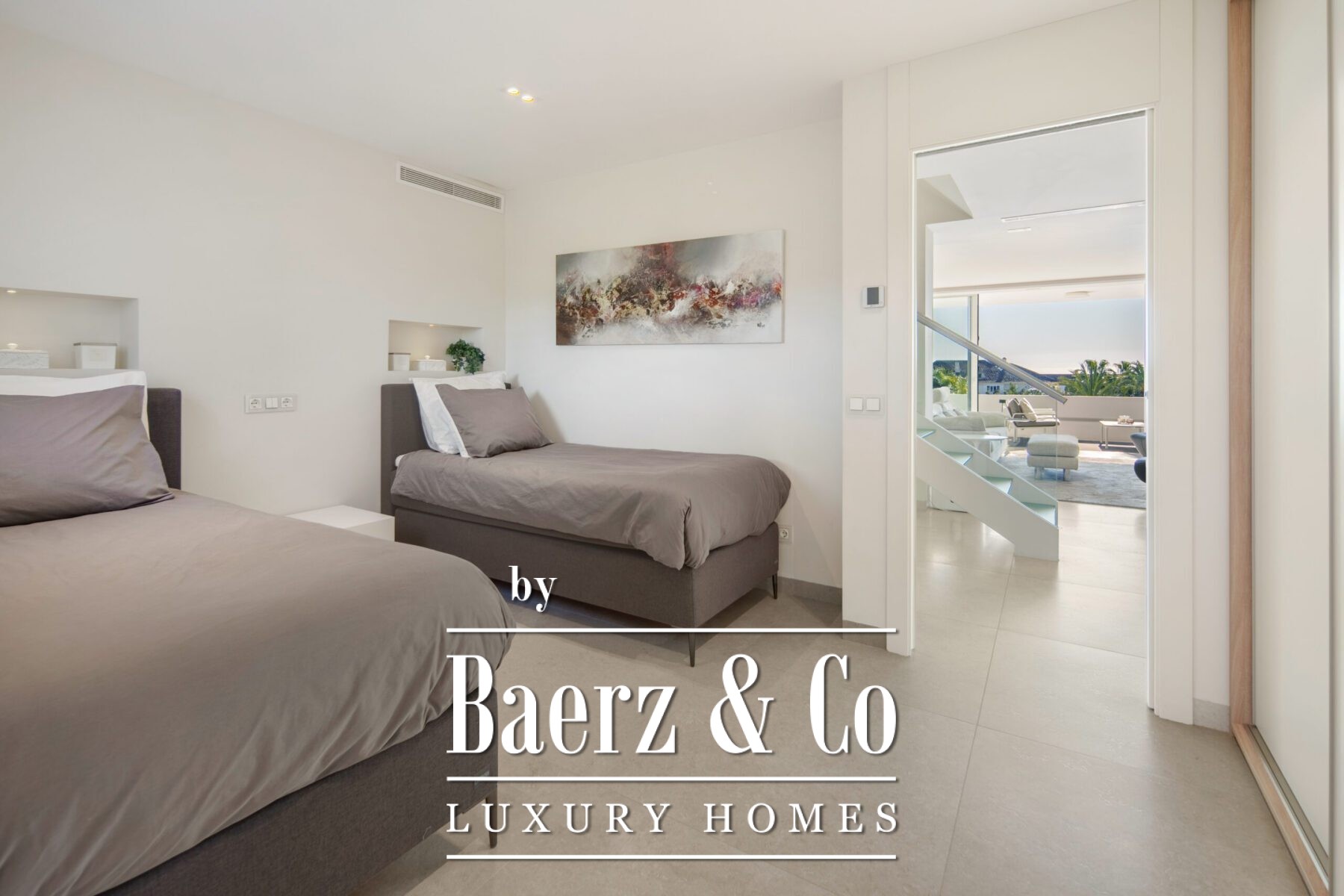 The focus keyword duplex penthouse Marbella Golden Mile captures a home defined by composure and purposeful design. This property spans 156 m² and is arranged over two levels. On the ground floor, an open-plan space blends kitchen, living, and dining areas, leading seamlessly outdoors. Here, two terraces offer distinct atmospheres: one with mountain air and morning light, the other granting calm, uninterrupted sea views. Two guest bedrooms are situated on this level, maintaining privacy and flow for both residents and visitors.