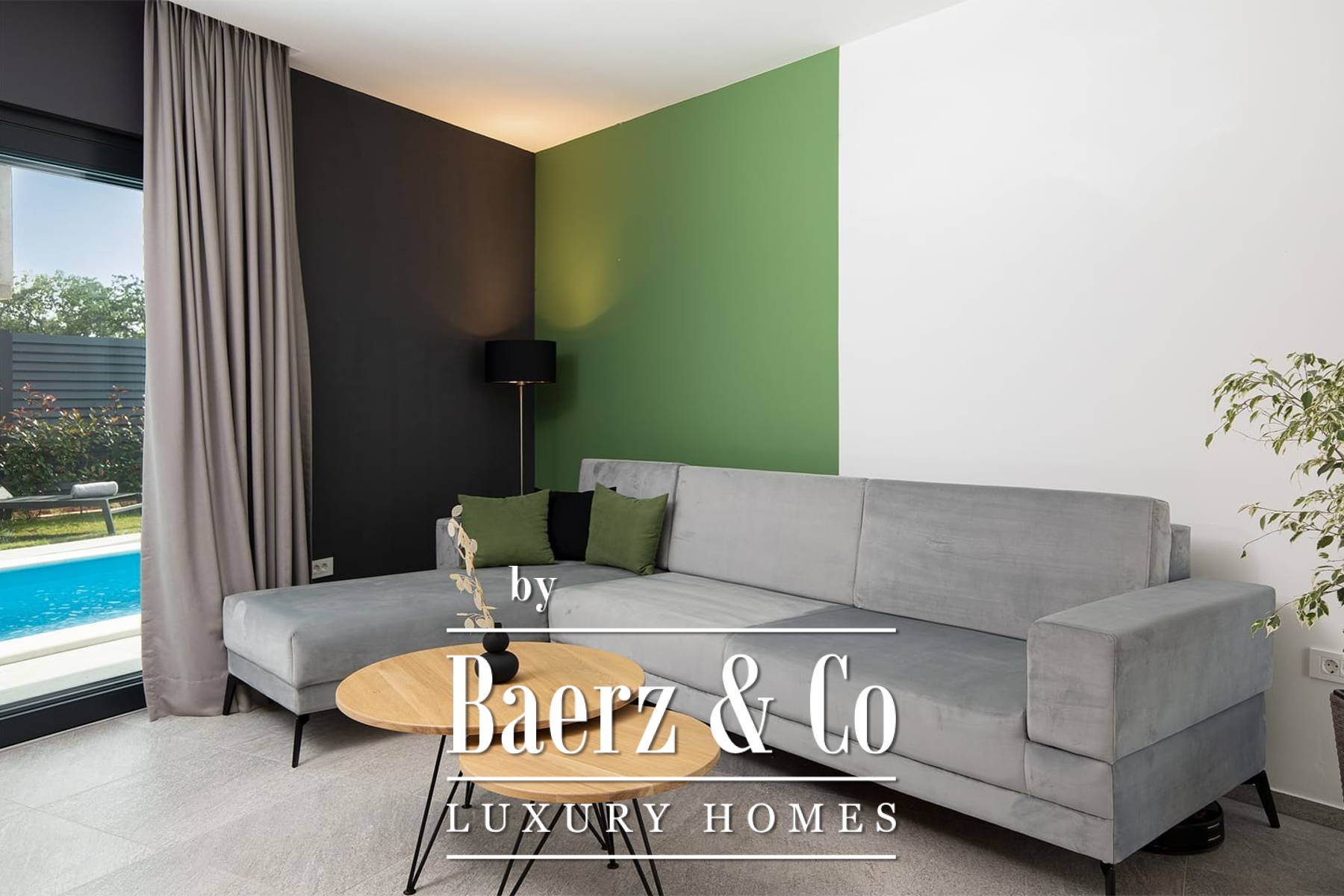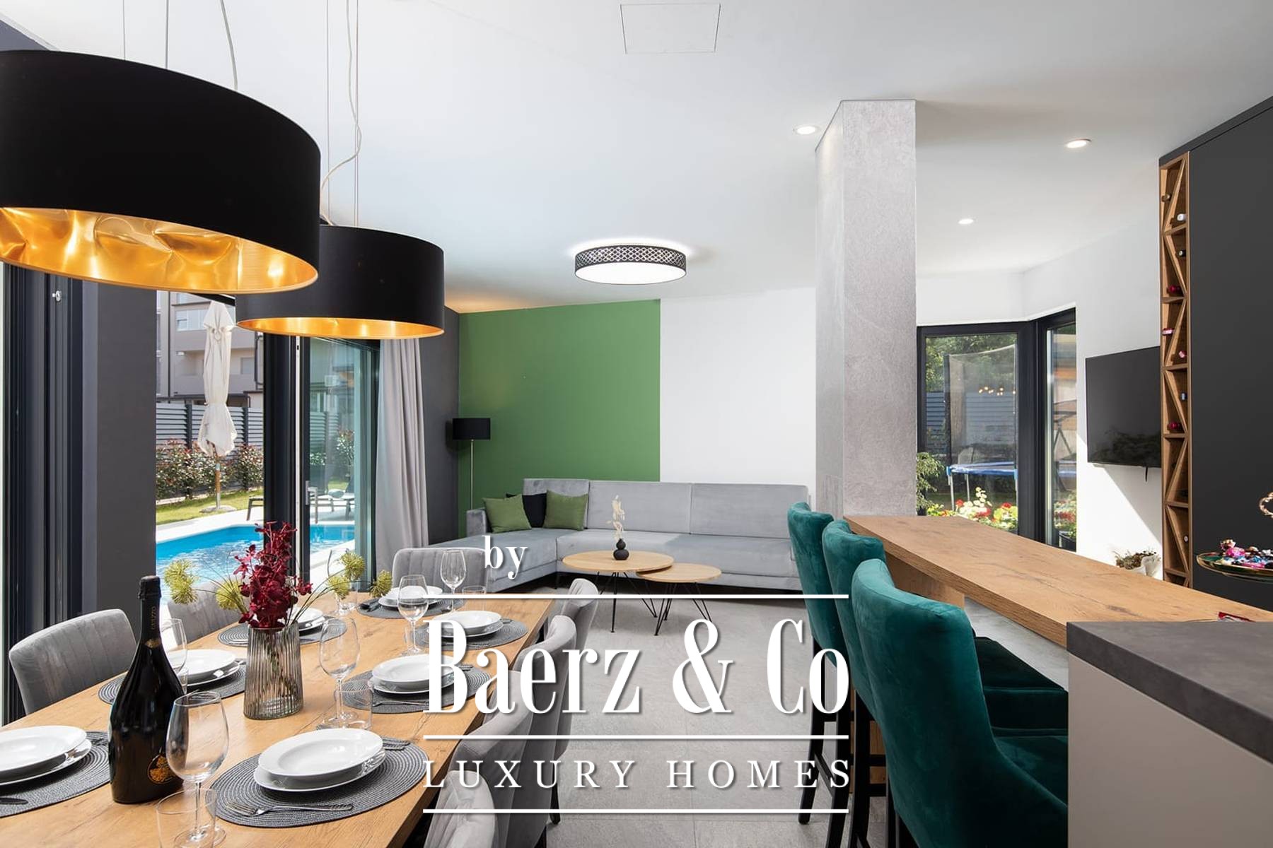 For sale is this luxurious modern villa in Medulin, net area 300 m2, located on a plot of 600 m2 in a quiet area. It consists of a basement, ground floor and first floor with the following layout: in the basement there is a wellness area with a relaxation zone. On the ground floor there is an entrance, a spacious open space living room with kitchen and dining room, three bedrooms each with its own bathroom. From the living room there is access to the terrace (part covered, part uncovered) from which access to the pool 9 m x 3.5 m and the garden, summer kitchen and children's playground. On the first