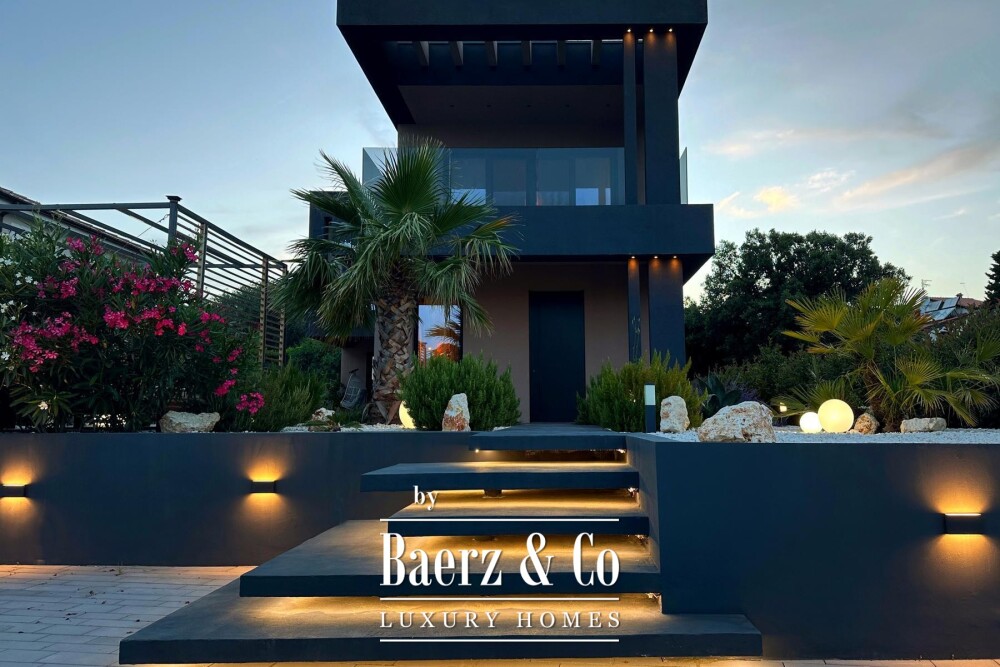 On the first floor, the main bedroom is airy, extending onto a covered terrace with views of the surrounding landscape, while its spacious bathroom integrates green elements for a sense of retreat. A second bedroom of modern design features its own private bath. Throughout, furniture and finishes originate from Germany, Italy, and the Czech Republic, curated for quality and enduring appeal. Underfloor heating using a heat pump system and individual air conditioning units ensure comfort all year. Outdoors, the villa’s barbecue, terraces, and mature greenery encourage privacy and conviviality, complemented by evening lighting and video security. Parking for four vehicles is offered in the entrance courtyard. This villa in Premantura is rare for its assured blend of seclusion, light, and European craftsmanship.