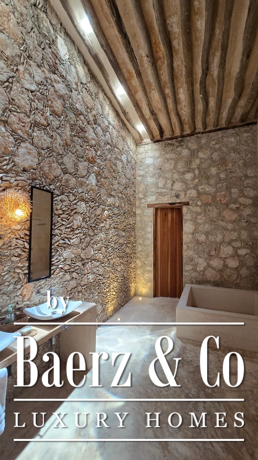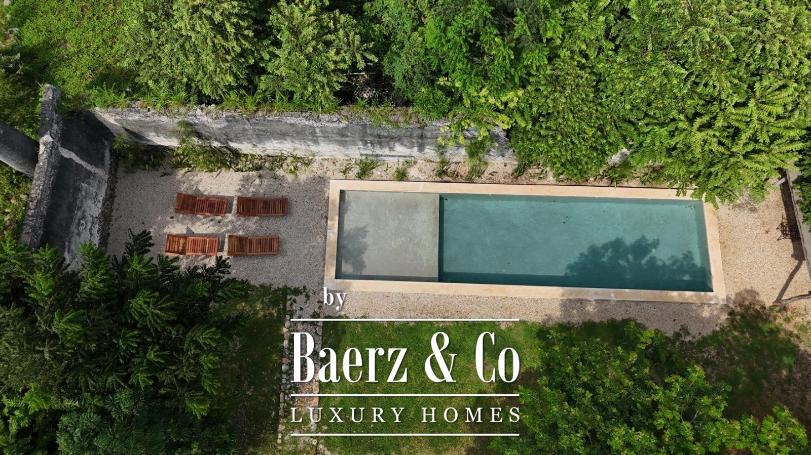 The estate is surrounded by jungle, with cenote views enhancing the experience of place. Colonial corridors, original stone walls, an orchard under restoration, and a swimming pool with lounge areas create layered moments throughout the grounds. The cenote itself reveals stone waterfalls and crystal-clear waters accessed by a hand-crafted zapote wood staircase, providing an intimate connection to the land’s legacy.
