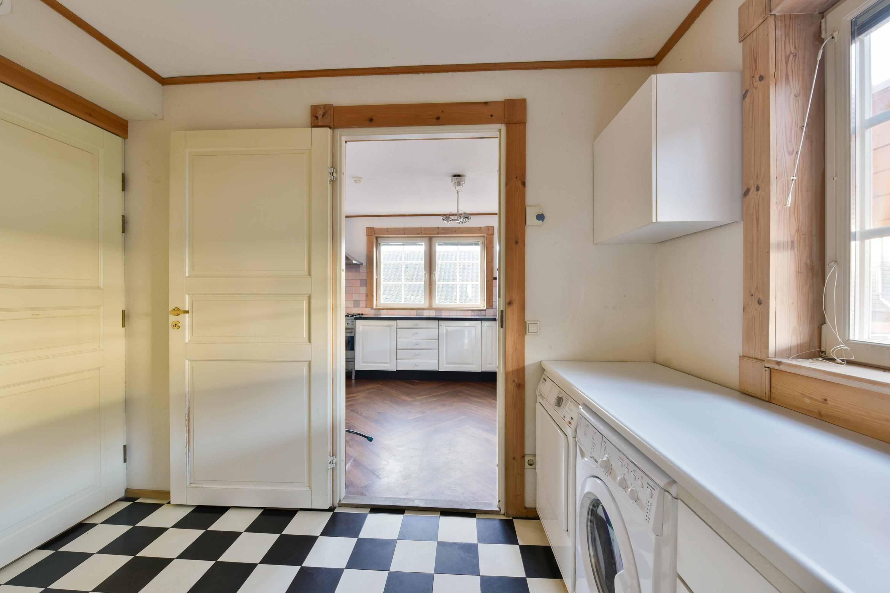 From the kitchen, you enter the practical, spacious utility room with a black-and-white tiled floor. Here, you’ll find connections for a washing machine and dryer under a stylish work table with cabinets for extra storage. The utility room gives access to the central hallway and a staircase leading to the basement.