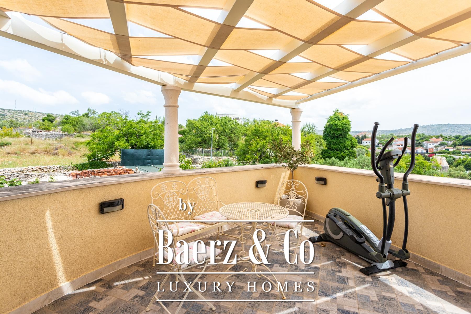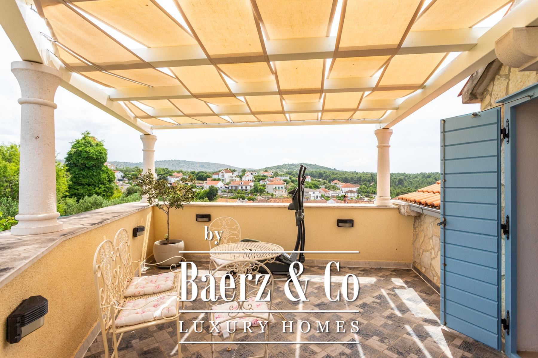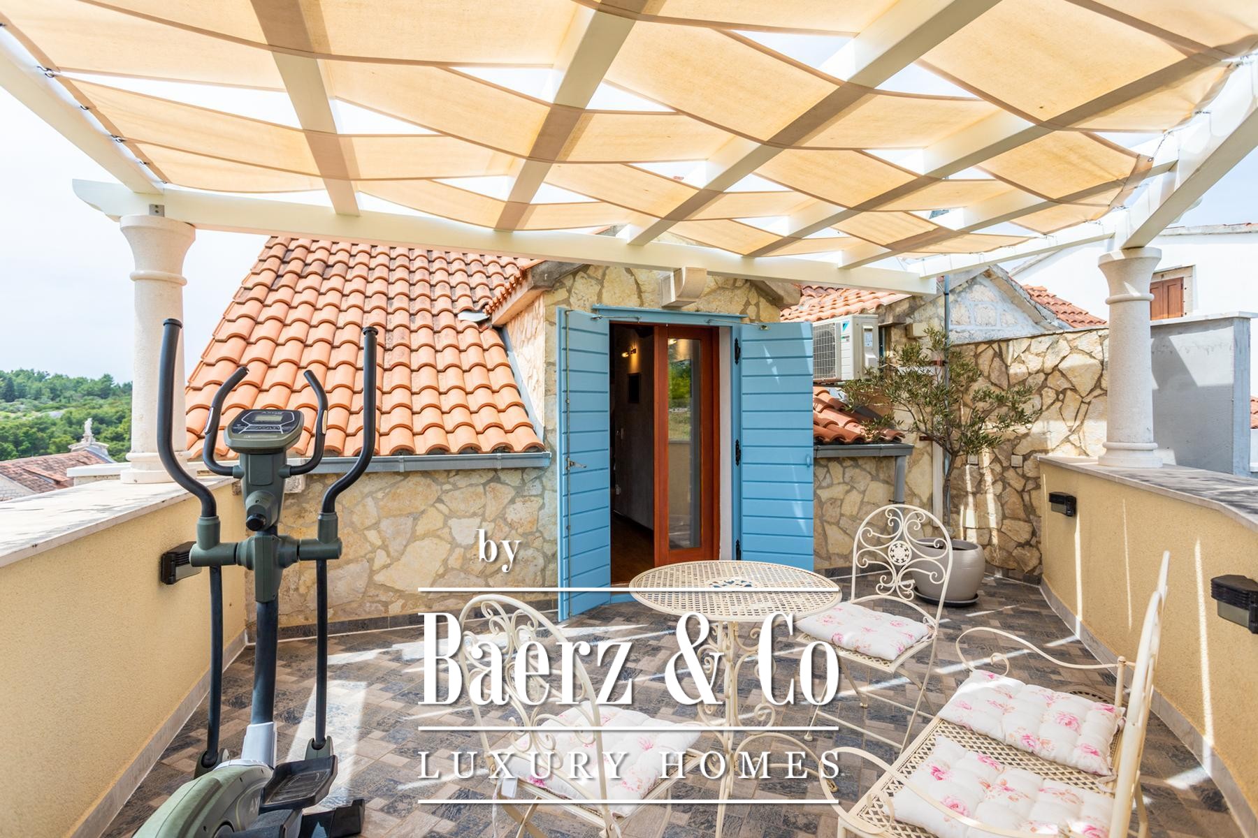Unique fully furnished stone villa in Milna, island of Brač. It extends over three floors, with a total living area of 201.80 m2 with a spacious garden. On the ground floor of the villa there is a kitchen, dining room, living room and toilet. On the first floor there are two spacious bedrooms (one with two single beds and one with a double bed) and a bathroom. On the second floor, there is a master bedroom (with one double bed and one single bed) with its own bathroom and a spacious terrace with an open sea view. In the courtyard of the villa