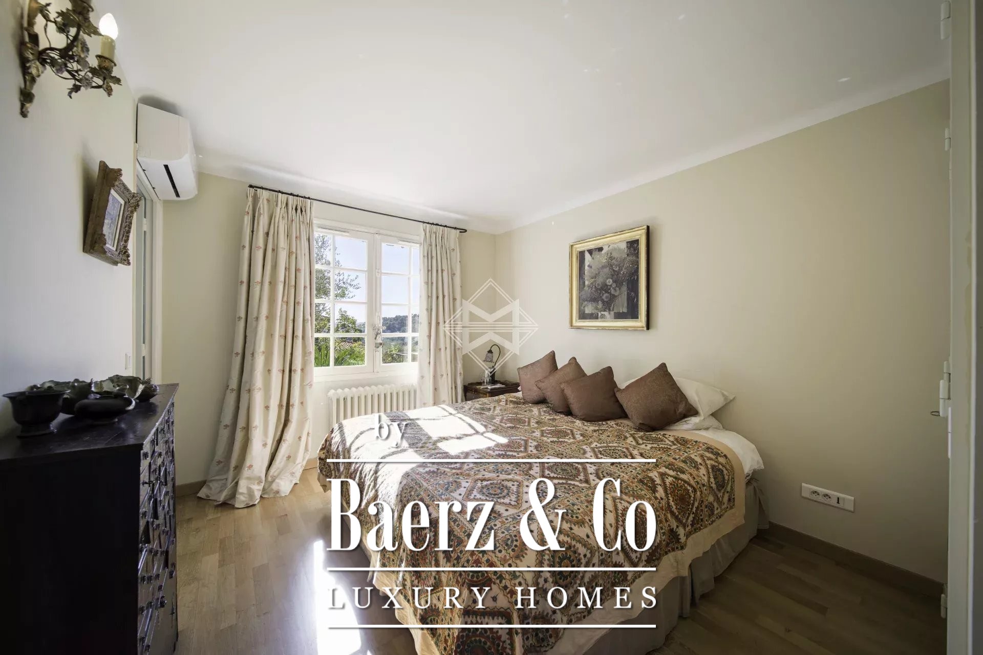This charming villa is ideally located just steps from the picturesque village of Mougins, renowned for its gourmet restaurants and art galleries. Nestled atop a lush garden, it offers panoramic views of the verdant Esterel hills and stunning sunsets.