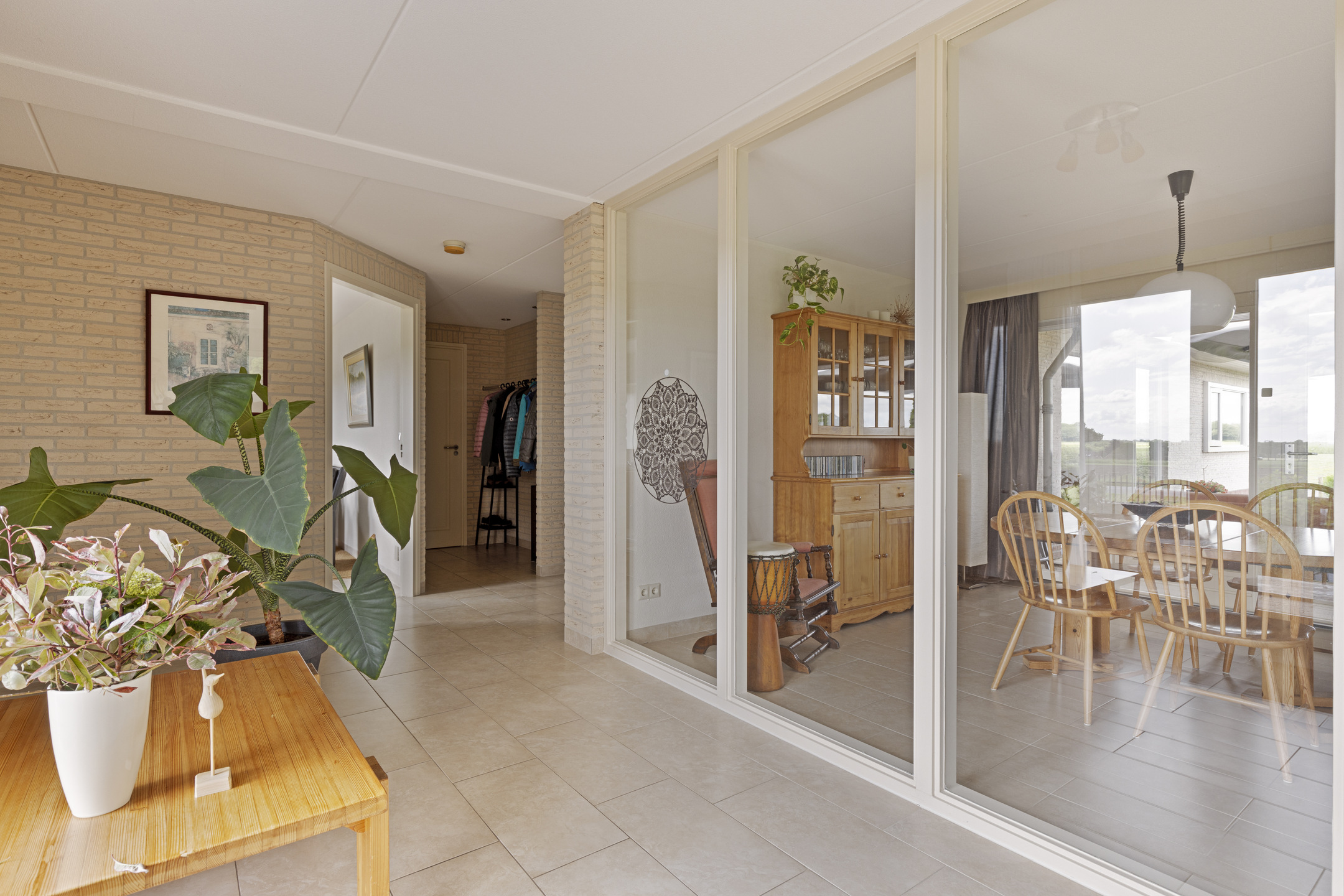The villa is entirely single-story, barrier-free and with extra-wide doorways. In the genial east, we naturally like to enter from the back, but for form entrance at the front of the house, in the spacious and sunny hall. On the floor is a beautiful, light ceramic tile that works excellently with underfloor heating. The baseboards are integrated with the walls throughout the house, so dusty edges have no chance here. The architect's mission was to create an open, light and sunny home, and he succeeded excellently.