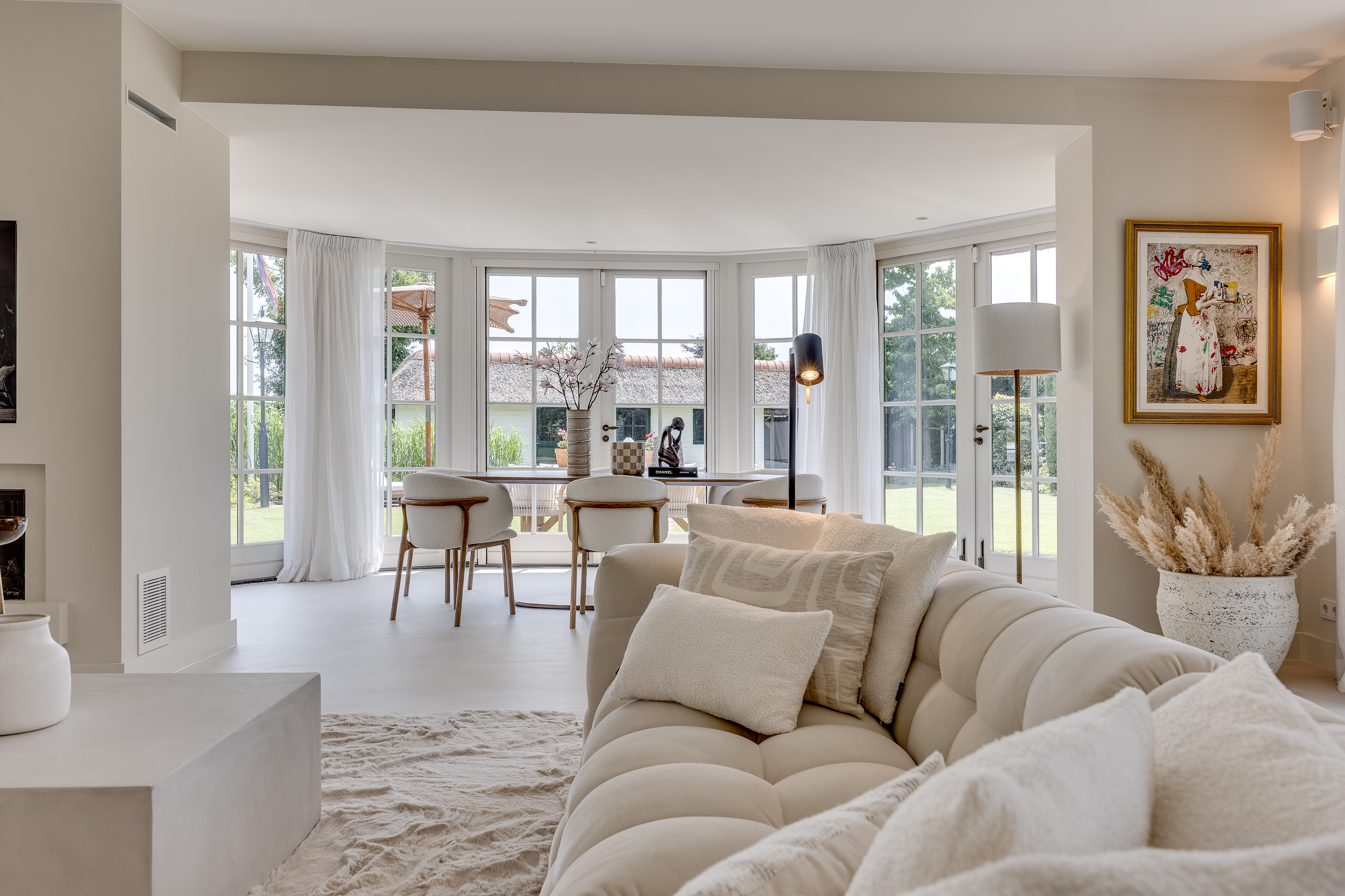 The ground floor features a spacious living room with an adjoining conservatory, two open fireplaces, a luxurious and comfortable kitchen/dining room, a very spacious study (which can easily be converted into a bedroom with an en-suite bathroom, see artist's impression/floor plan), a gym (fitness room), and a large basement. On the first floor, there are now two bedrooms, each with its own bathroom. The thatched roof, the rod-divided windows, and doors exude character, while modern technology invisibly ensures ultimate comfort. Classic charm meets high-tech convenience, exactly as it should be.
