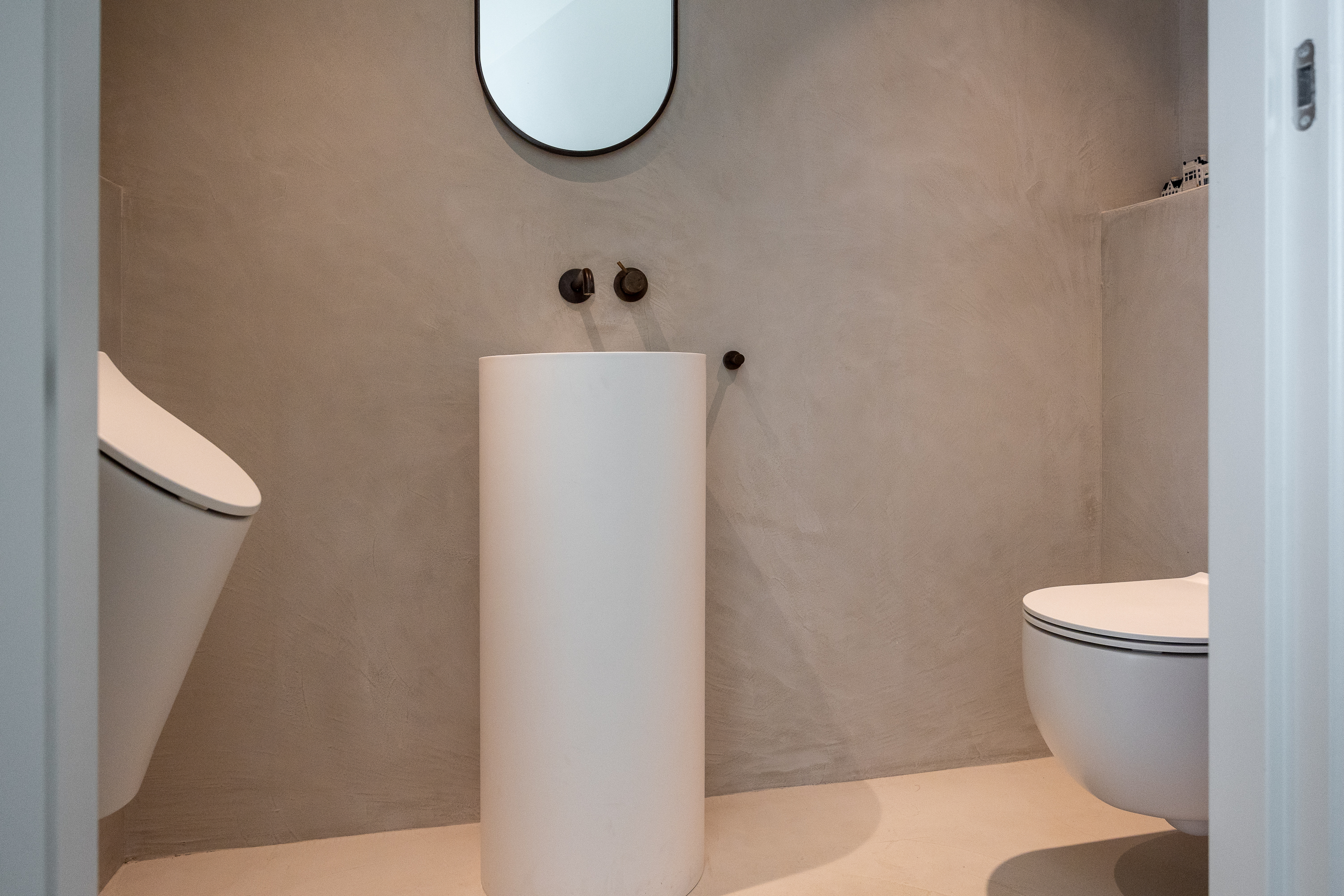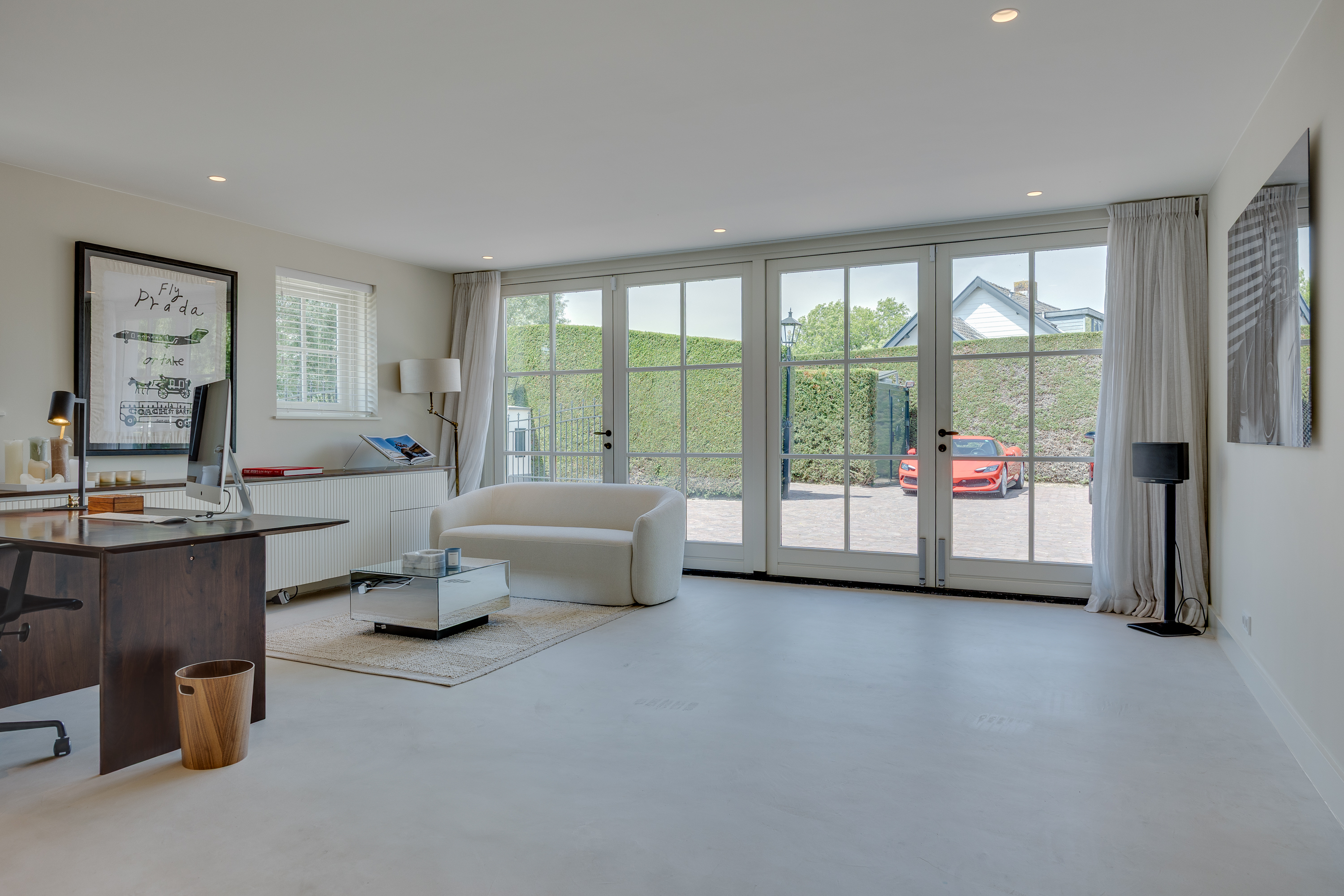 The delightful, spacious study where work and relaxation go hand in hand. Here you can concentrate on your work, and then just as easily do a few squats in the adjacent gym. The study is equipped with custom-made cupboards and, above all, lots of light. Thanks to the large double French doors, you can even park your car inside as a work of art! If you wish to live here for the rest of your life, the study can easily be converted into an extra bedroom with en-suite bathroom with a few adjustments.