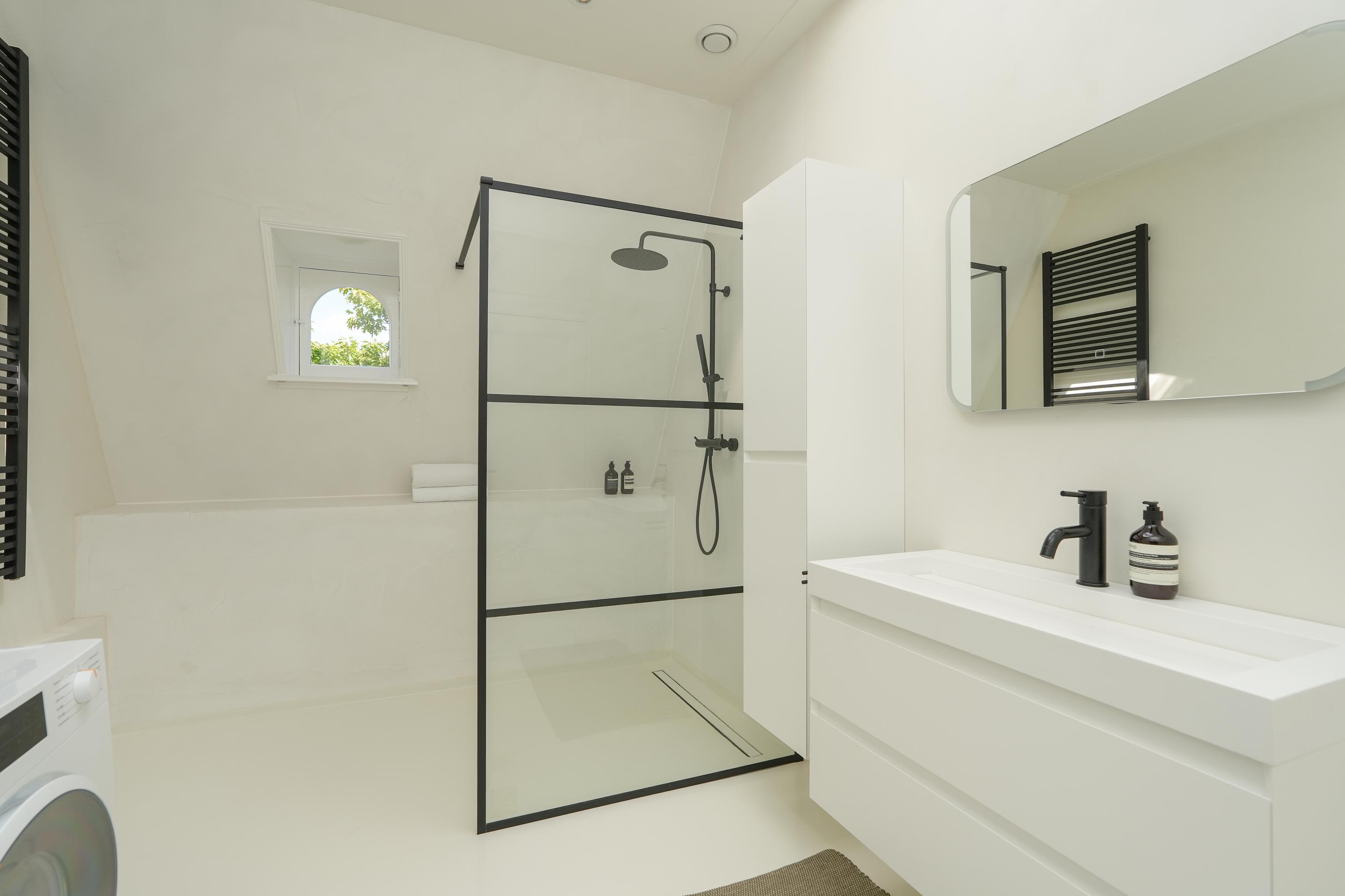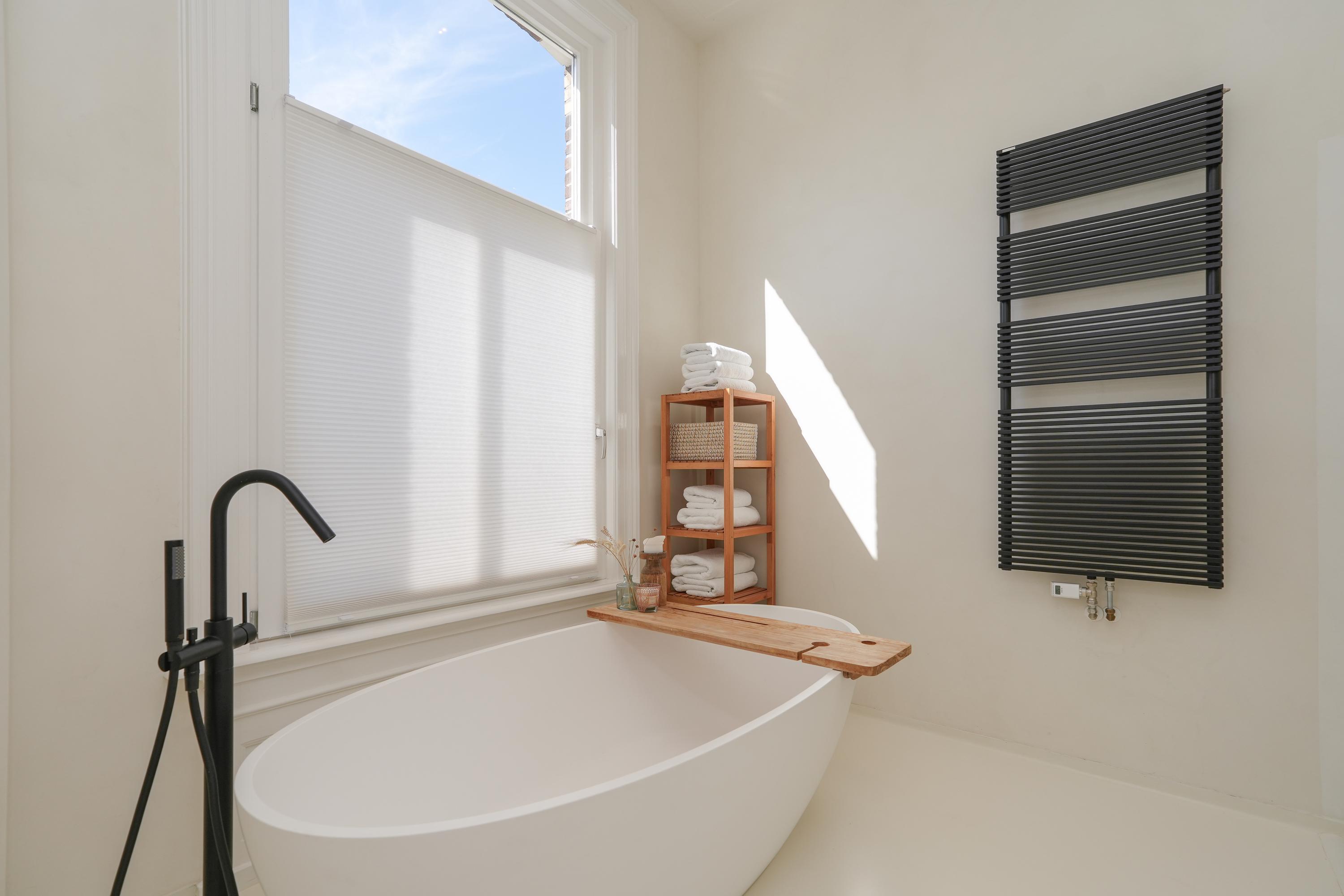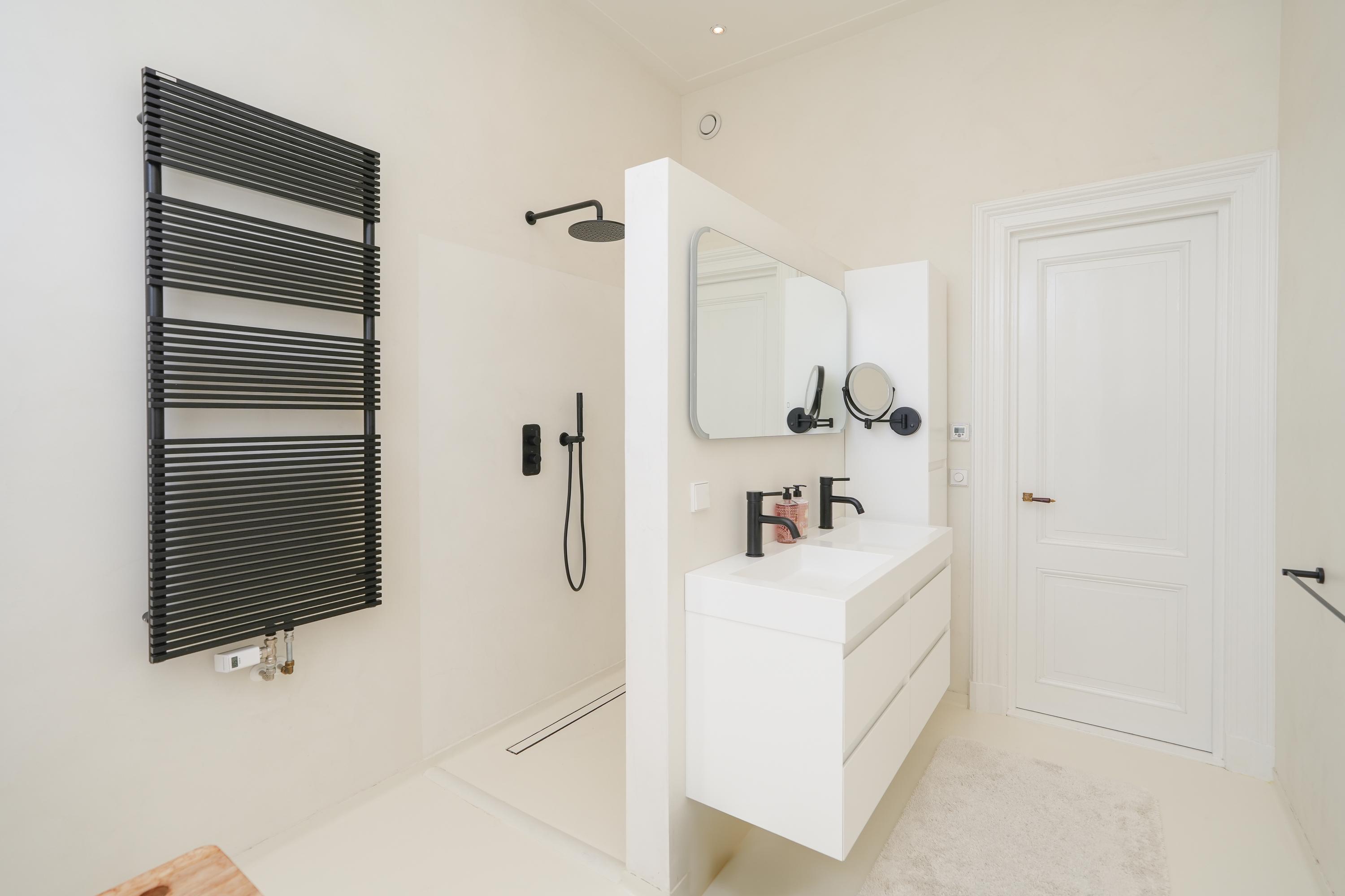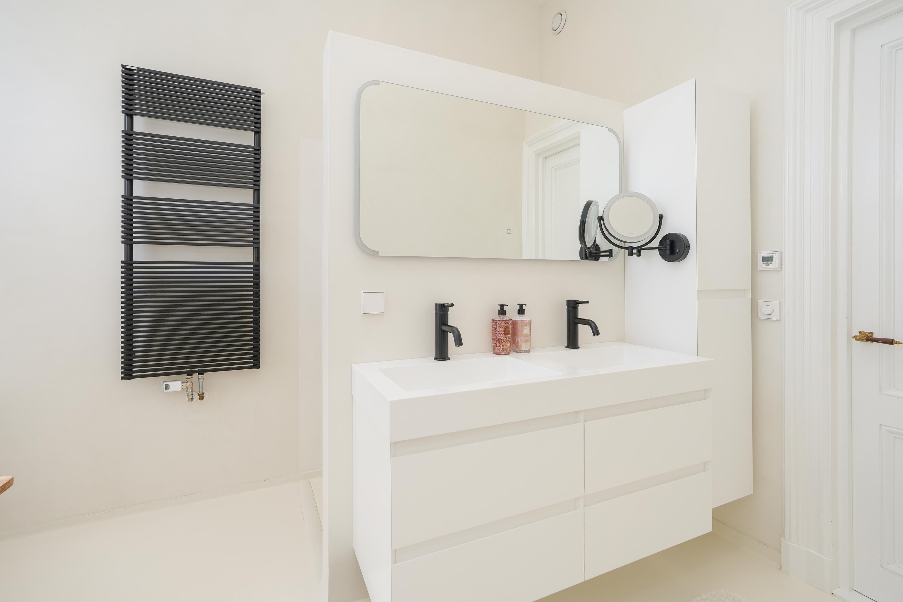 Bright landing with staircase to the top floor. The first floor has two bedrooms, a modern bathroom and a separate toilet with washbasin. The master bedroom has air conditioning and a spacious walk-in closet, accessible via two sliding doors next to the bed. At the front is a wide balcony next to the walk-in closet and at the rear is a spacious, sunny roof terrace next to the master bedroom. Originally, the master bedroom and walk-in closet were two separate bedrooms, and this layout can easily be restored. The second bedroom also has air conditioning. The luxurious, modern bathroom is accessible from both the master bedroom and the landing and features a freestanding bathtub, double walk-in shower, double sink in a vanity unit and underfloor heating. The toilet and bathroom are equipped with automatic mechanical ventilation.