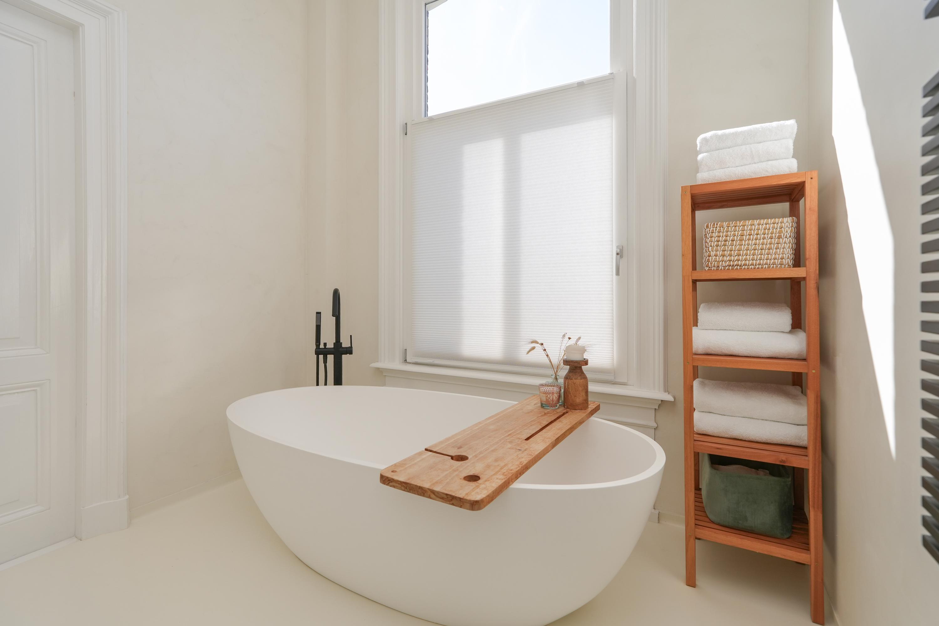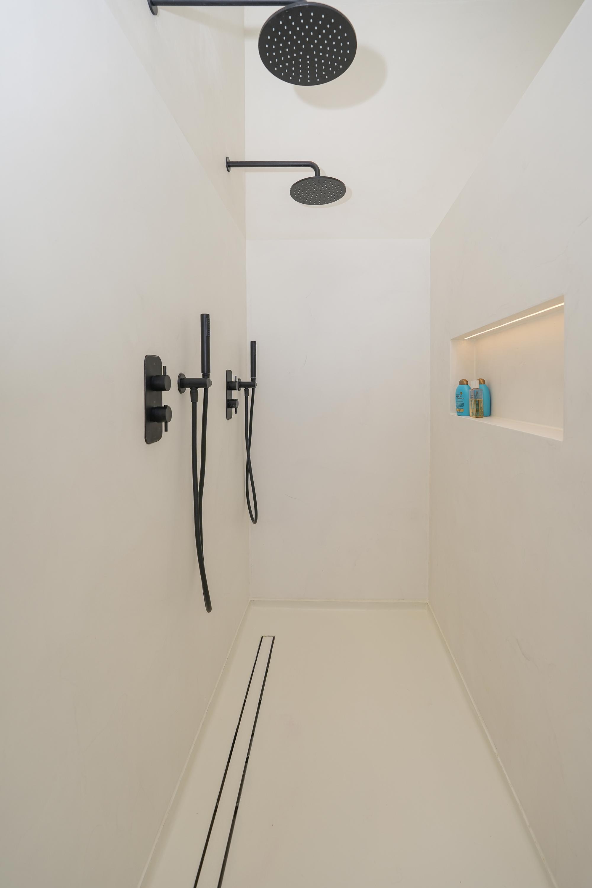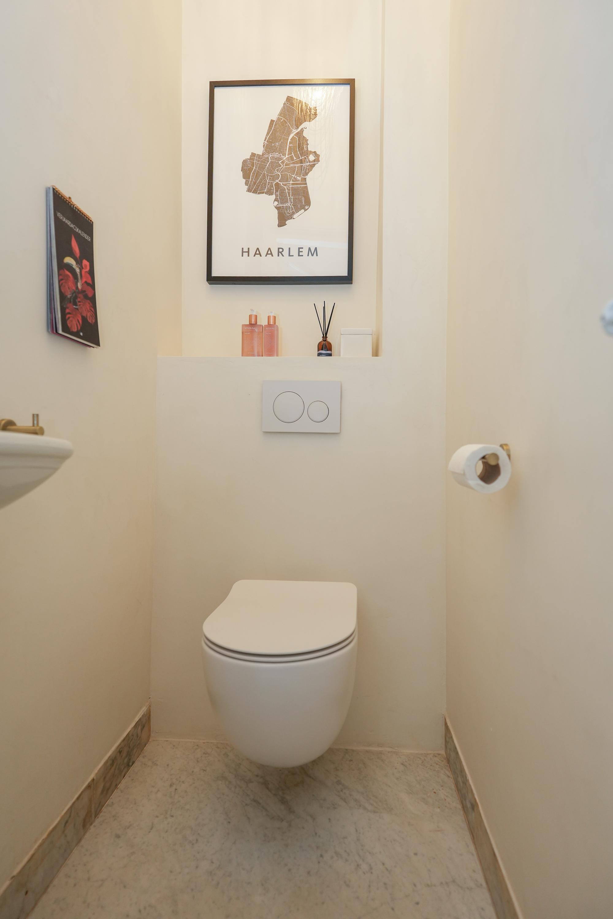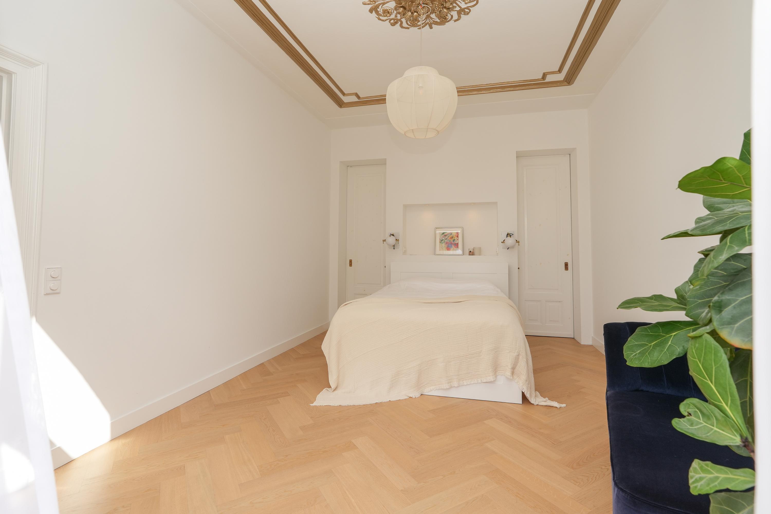 Bright landing with staircase to the top floor. The first floor has two bedrooms, a modern bathroom and a separate toilet with washbasin. The master bedroom has air conditioning and a spacious walk-in closet, accessible via two sliding doors next to the bed. At the front is a wide balcony next to the walk-in closet and at the rear is a spacious, sunny roof terrace next to the master bedroom. Originally, the master bedroom and walk-in closet were two separate bedrooms, and this layout can easily be restored. The second bedroom also has air conditioning. The luxurious, modern bathroom is accessible from both the master bedroom and the landing and features a freestanding bathtub, double walk-in shower, double sink in a vanity unit and underfloor heating. The toilet and bathroom are equipped with automatic mechanical ventilation.