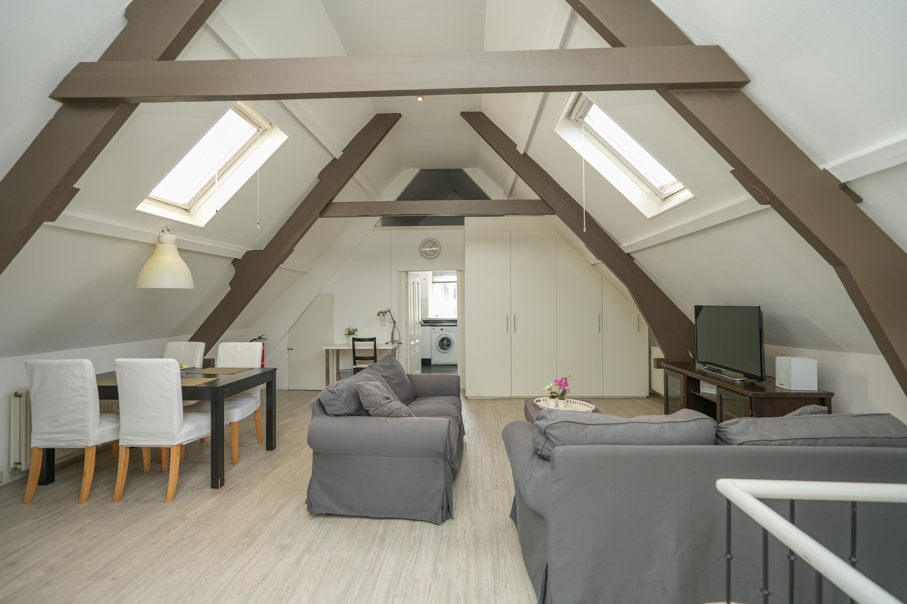 Middels een vaste trap is de bovenste verdieping bereikbaar, hier bevindt zich een ruime woonkamer met een bedstee. Tevens is er een moderne dichte keuken met witgoedaansluiting en er is een functionele badkamer met toilet en douche. Deze verdieping is sfeervol doordat de originele constructiebalken zichtbaar zijn gebleven en de ruimte is lekker licht door de dakramen. Bovendien is er veel bergruimte in vaste kasten.
