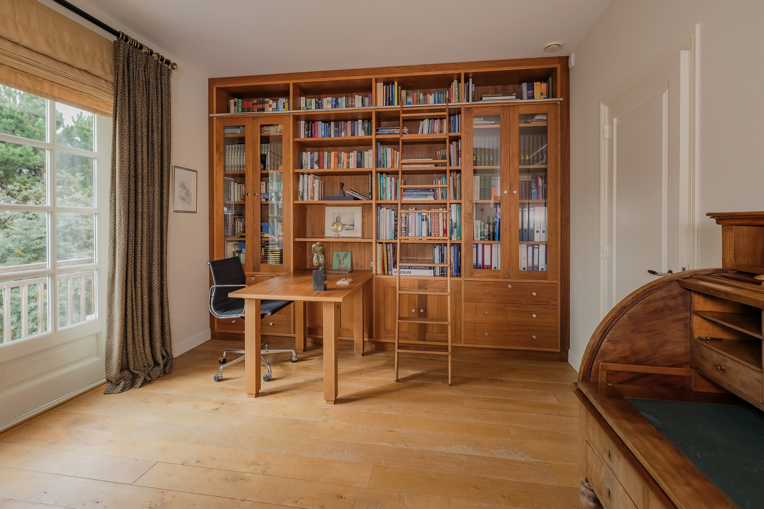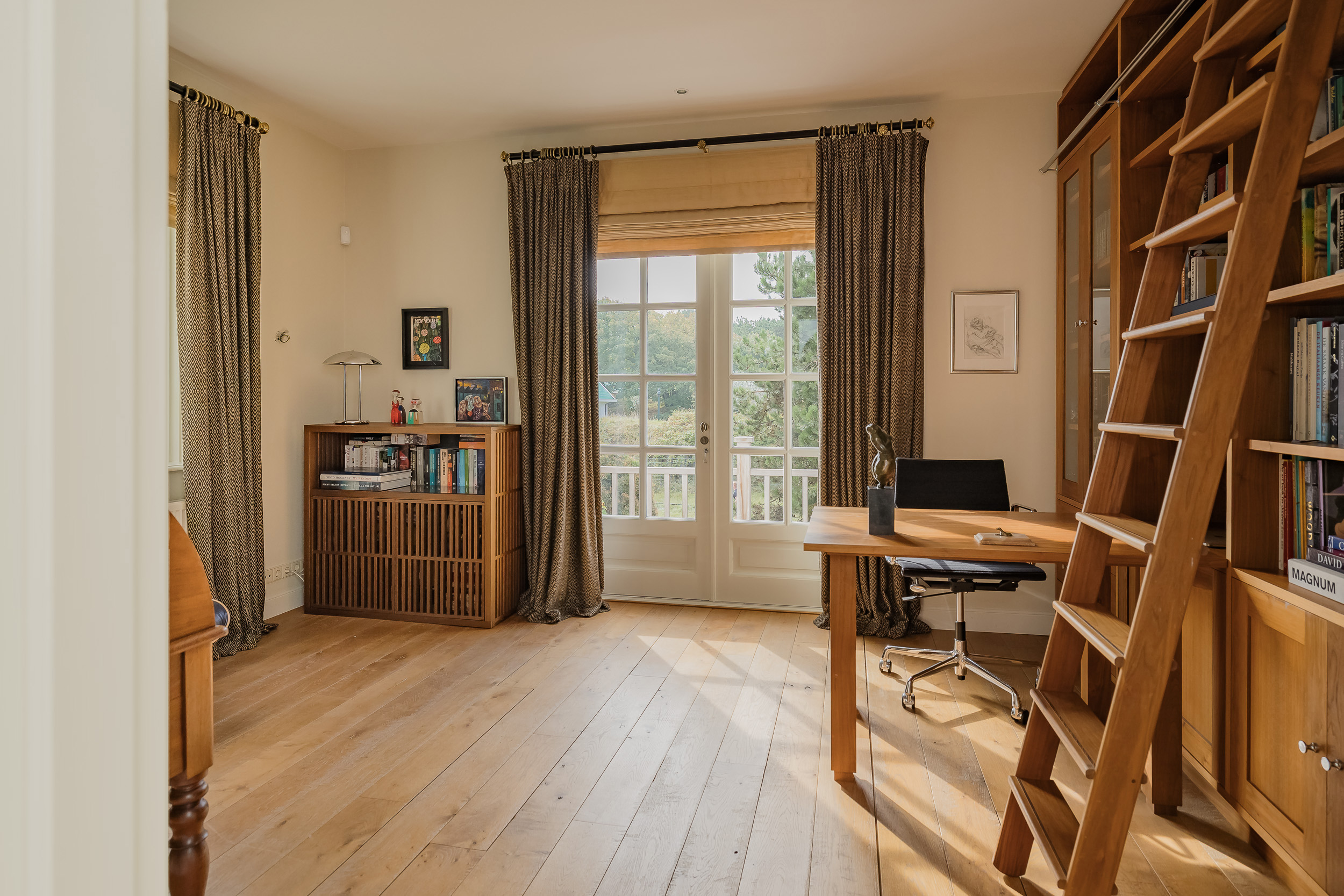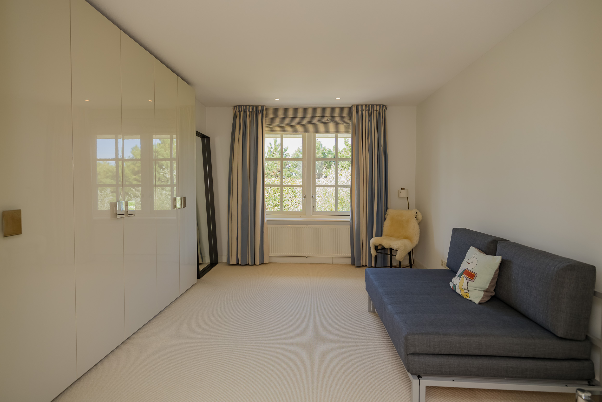 The villa exudes tranquility, space, and elegance. An elegant entrance, richly surrounded by flowers, welcomes you at the door. The spacious hall leads to the cozy living room with fireplace, adjacent dining room, and delightful kitchen with French doors to the garden. A place that invites you to spend long evenings cooking, dining, and enjoying life. A practical utility room and a spacious study on the ground floor complete the picture. All rooms have direct access to the garden, veranda, or one of the balconies.