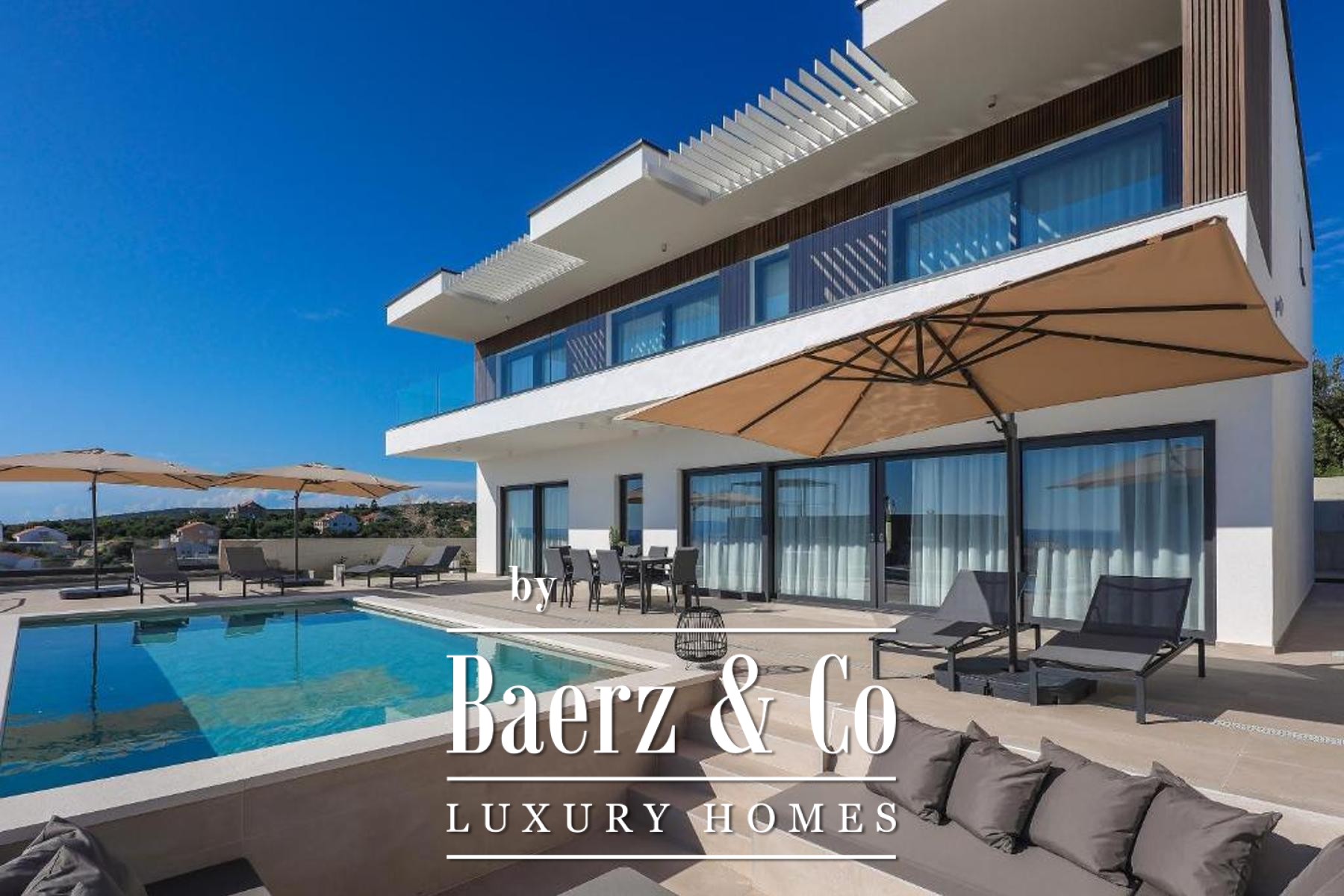 Luxury villa in an excellent location in Jakišnica (Lun), only 90 meters from the sea. It is situated on a landscaped plot of 804 m², surrounded by a carefully designed Mediterranean garden and open views of the sea and sunsets.The villa extends over two floors; the living area follows an open-space concept with direct access to the covered terrace and sun deck.Layout and key features:• 4 spacious bedrooms, each with its own en-suite bathroom