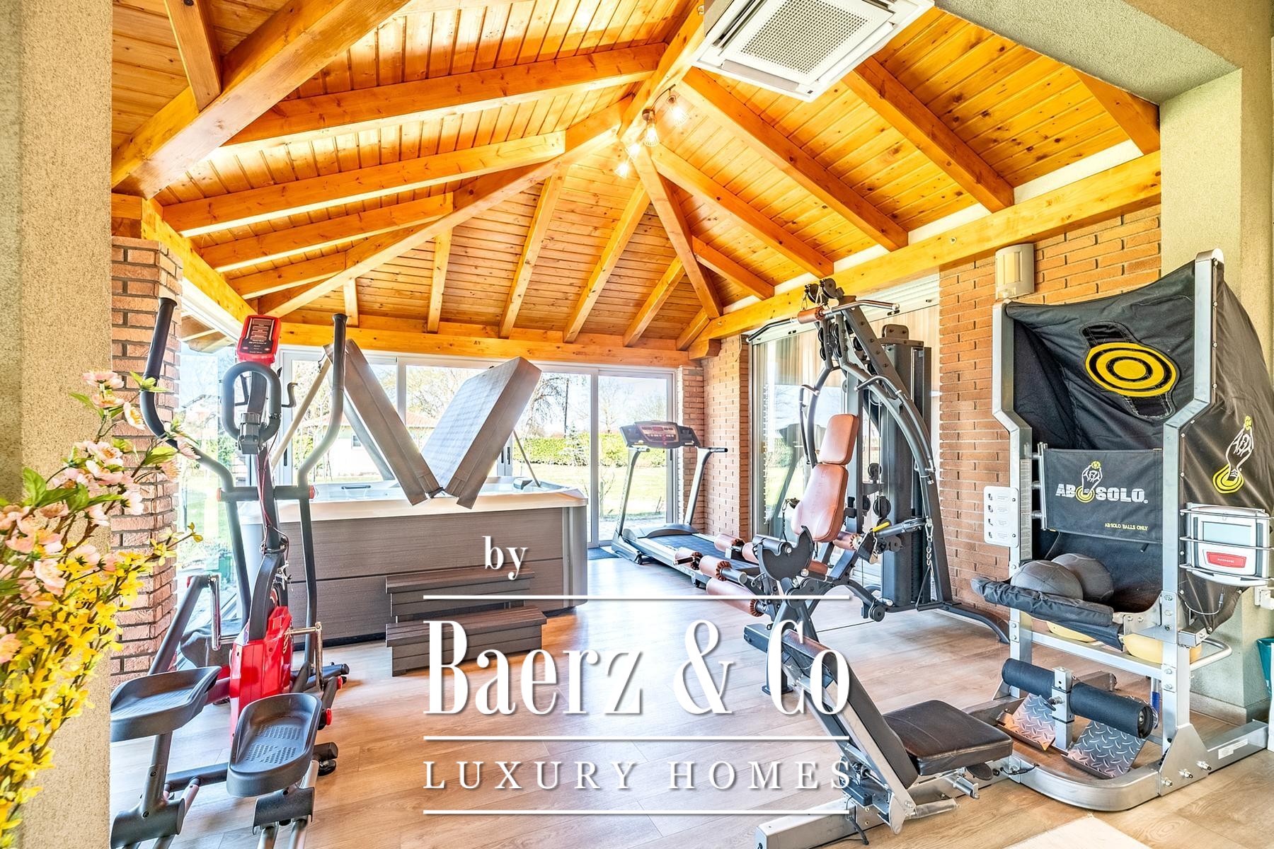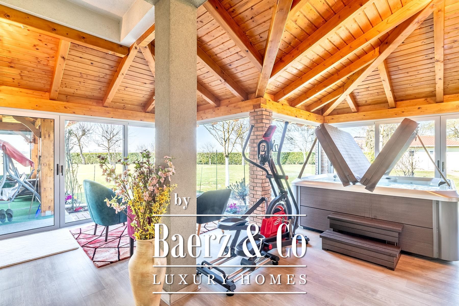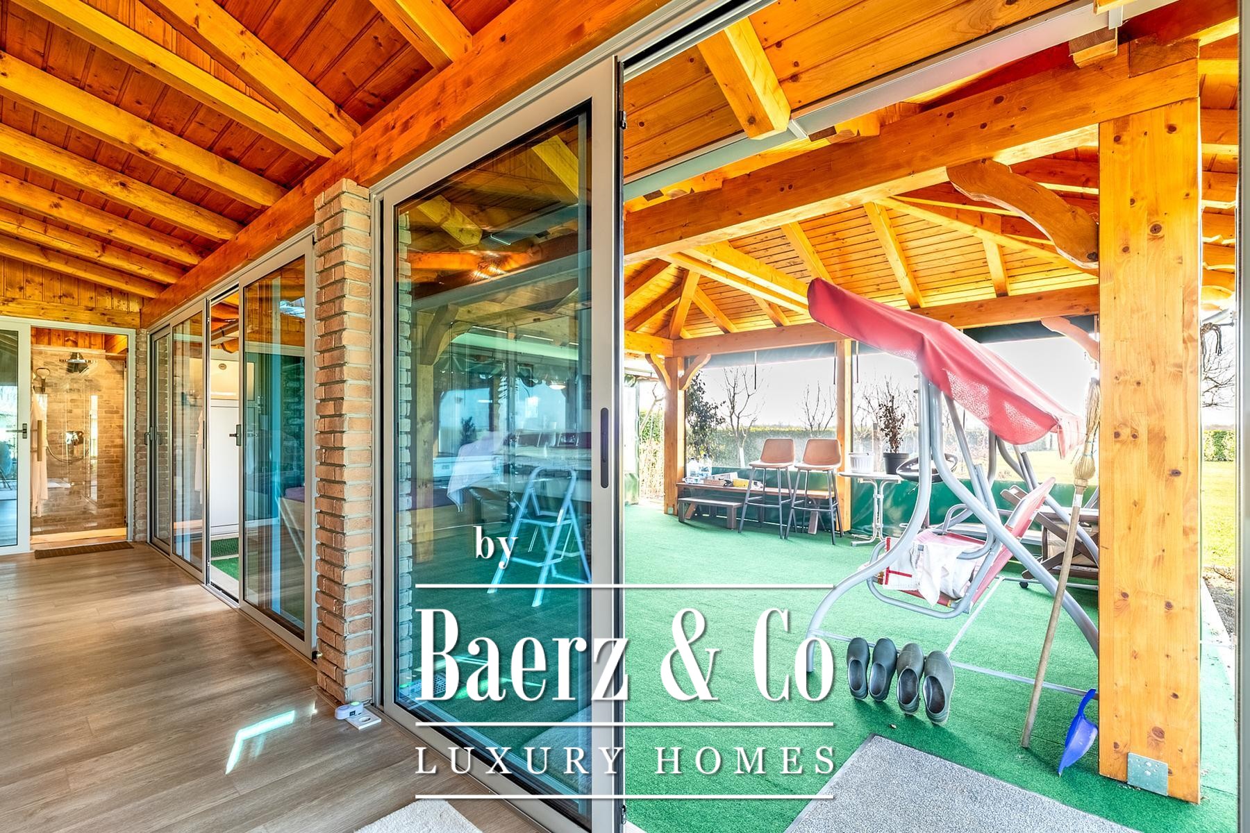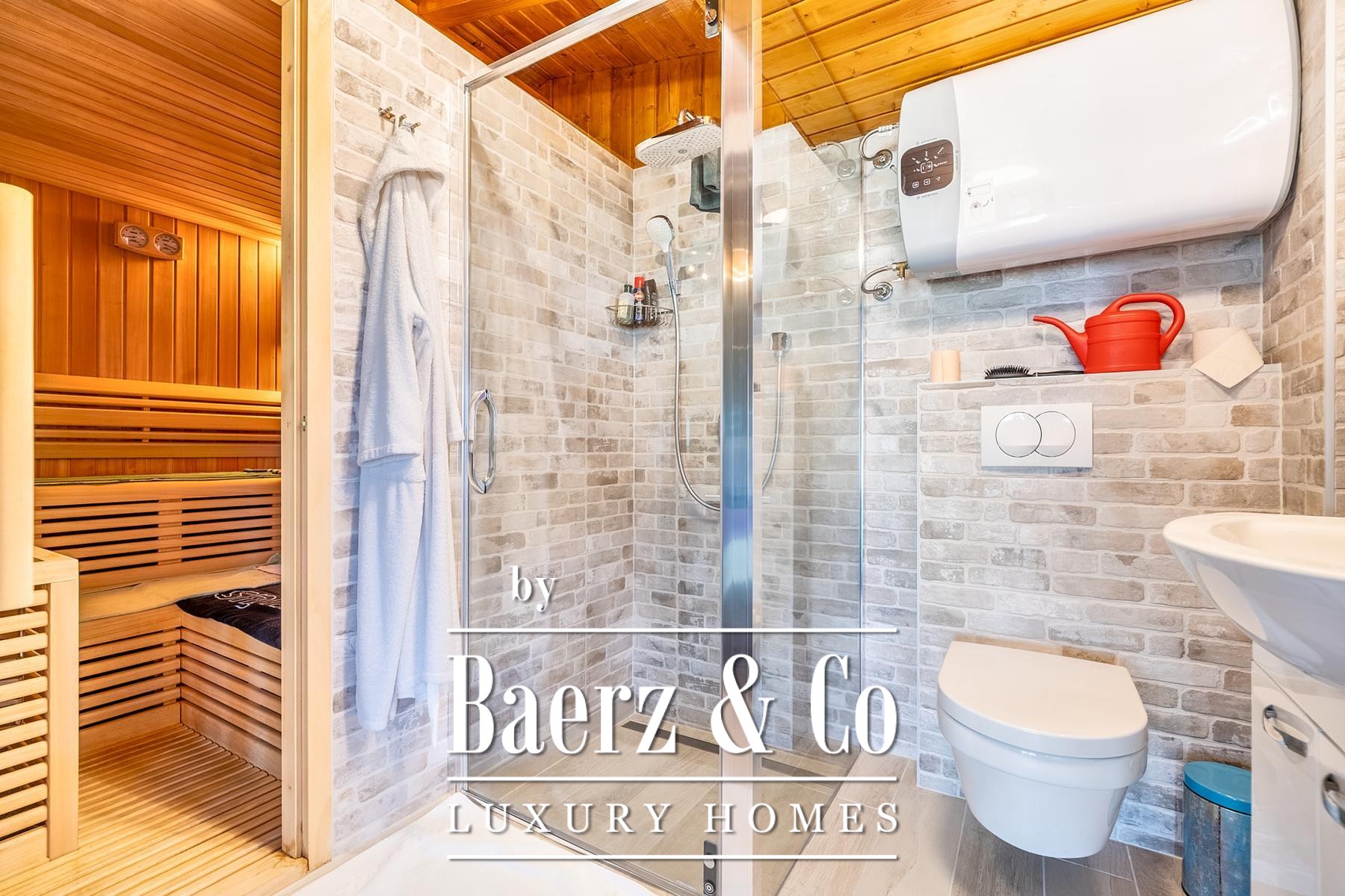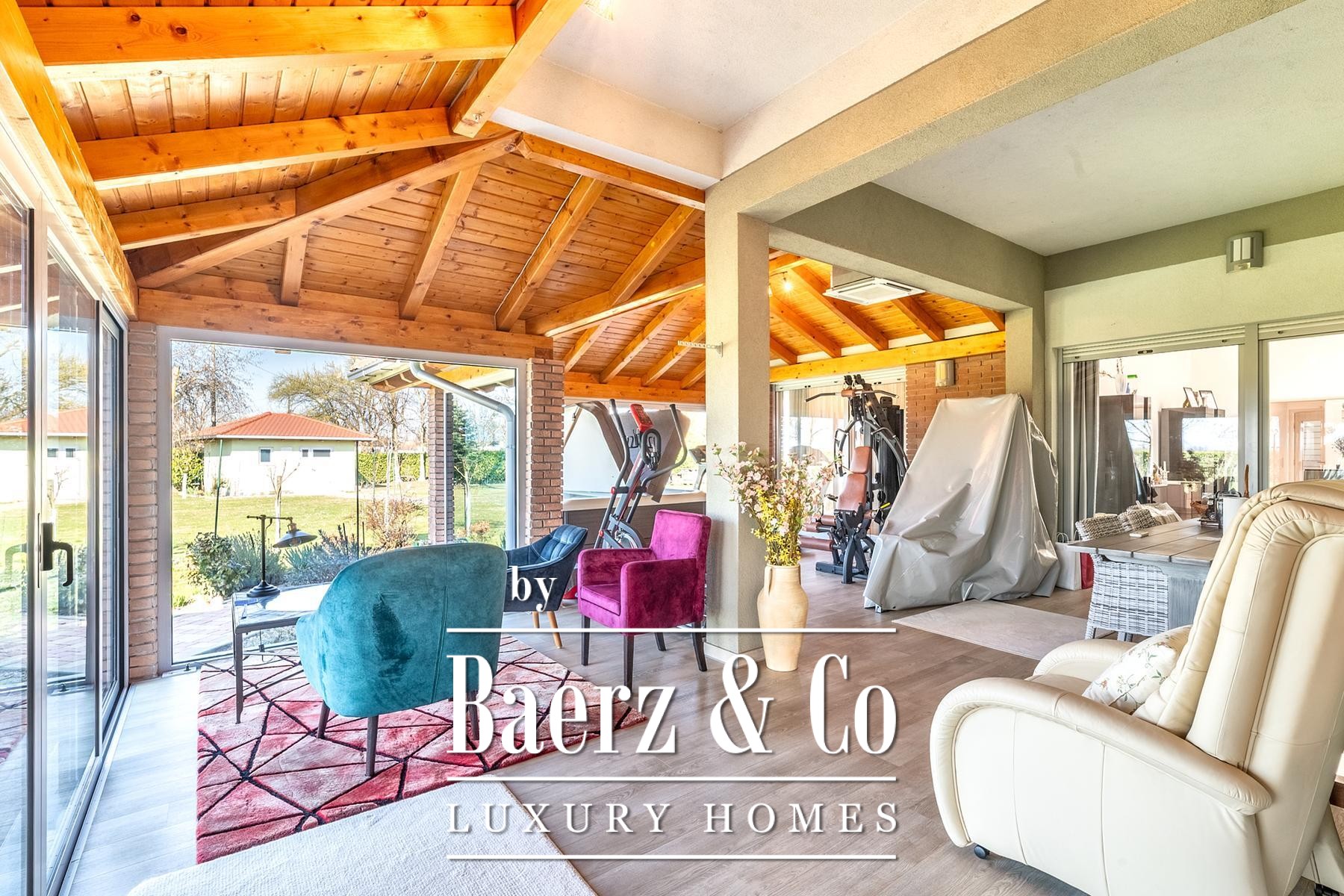 The interior welcomes with a spacious living room, kitchen, and dining area, opening directly onto a glazed, heated winter garden. Three bedrooms provide private retreats, supported by two bathrooms and a guest toilet. Functional elements include a dedicated laundry room and direct, warm access from the garage. The wellness area invites relaxation, featuring a sauna and an additional bathroom for comfort.