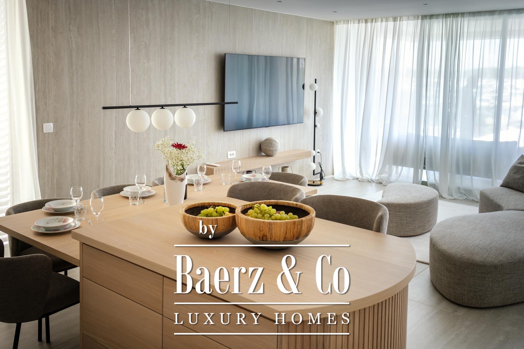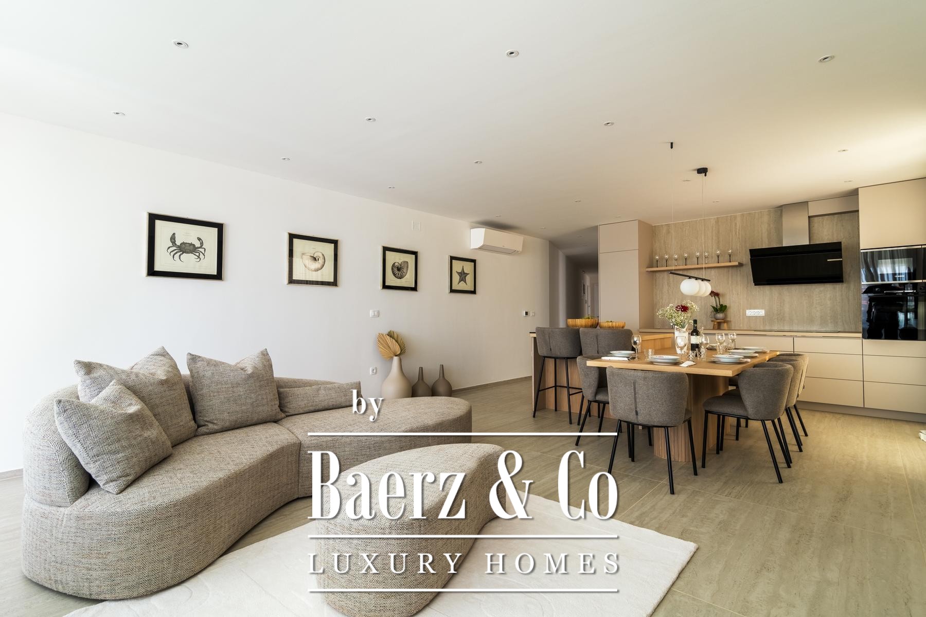 Light fills the open-plan living area where kitchen, dining, and lounge flow seamlessly onto a covered terrace with expansive sea views. The master bedroom enjoys its own private bathroom and balcony, while two further bedrooms share a well-appointed bathroom. Every element, from Bosch appliances to underfloor heating and air conditioning, prioritizes comfort and quality. The apartment extends its atmosphere of ease with two parking spaces, a private storage area, and access to a heated saltwater pool, sauna, and gym.