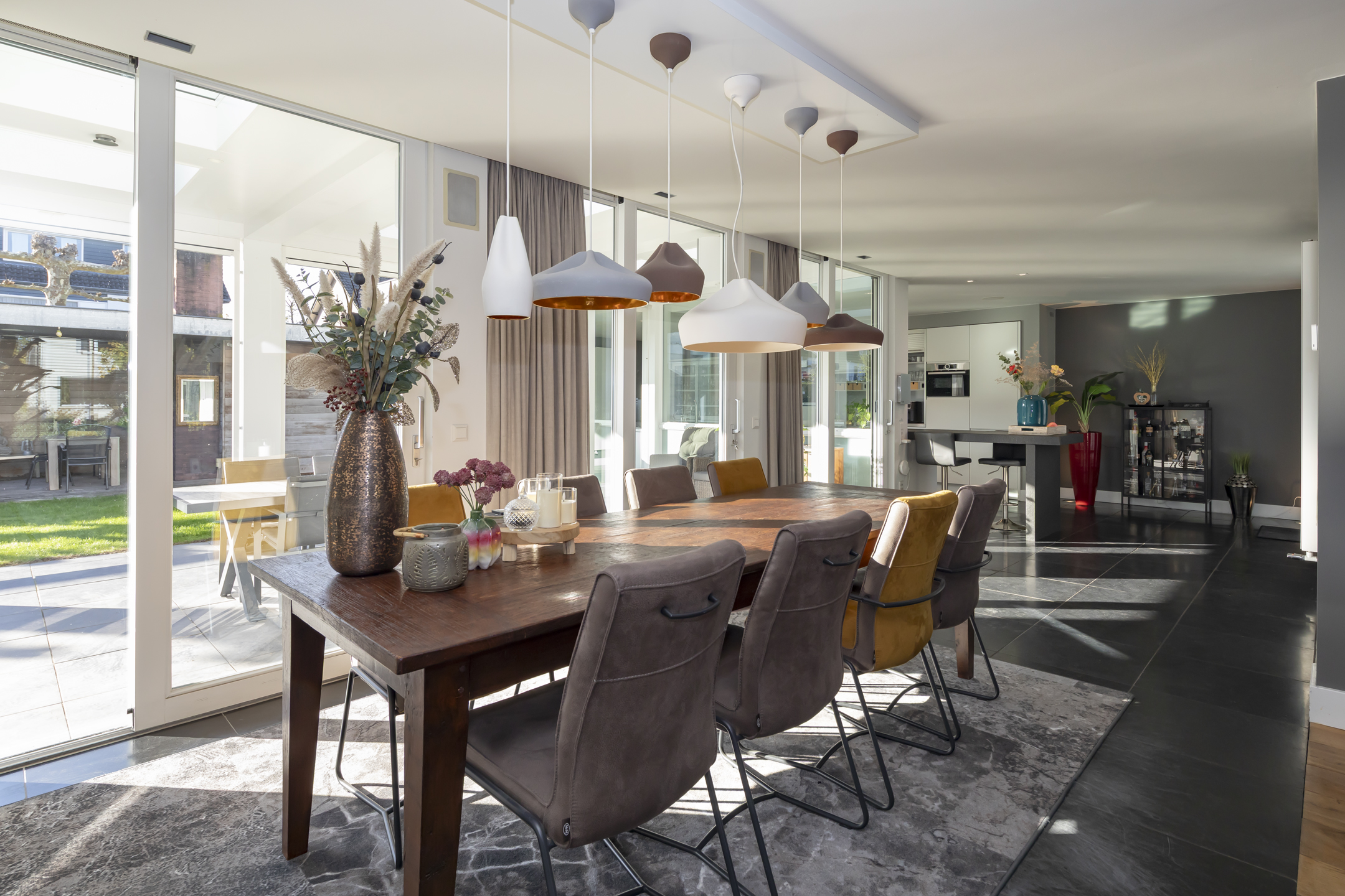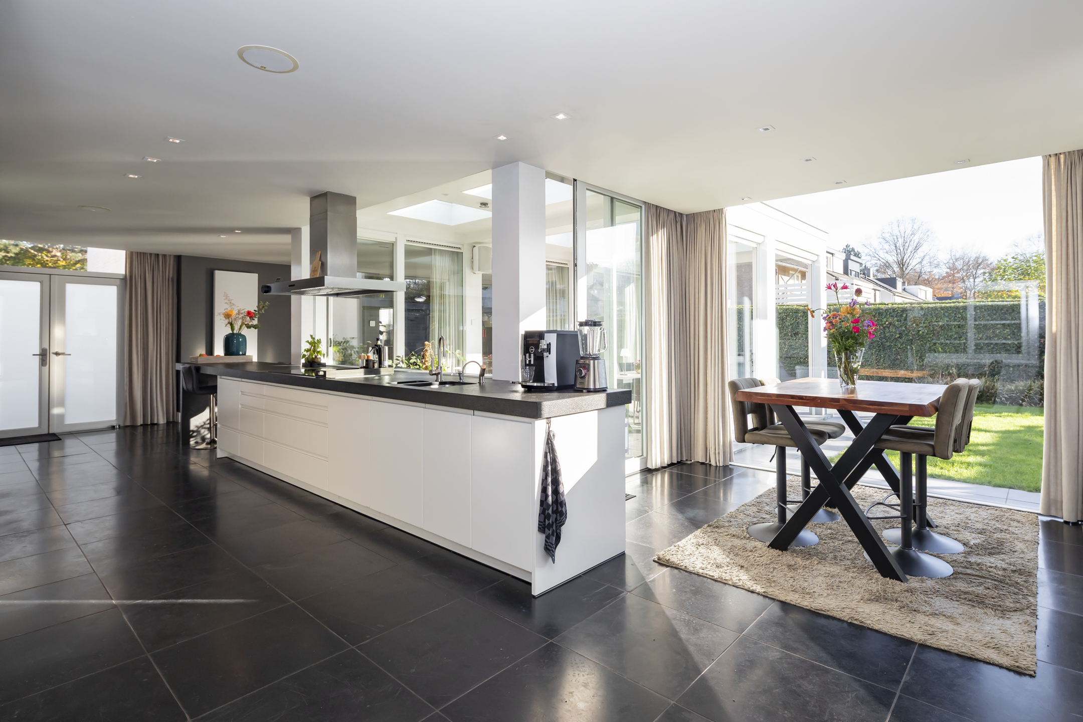 The modern Bulthaup kitchen is equipped with a range of high-quality built-in appliances. There is a Quooker, a dishwasher, a 5-burner induction hob, an extractor hood, an oven, a combination microwave/convection oven and a built-in refrigerator with freezer drawers.