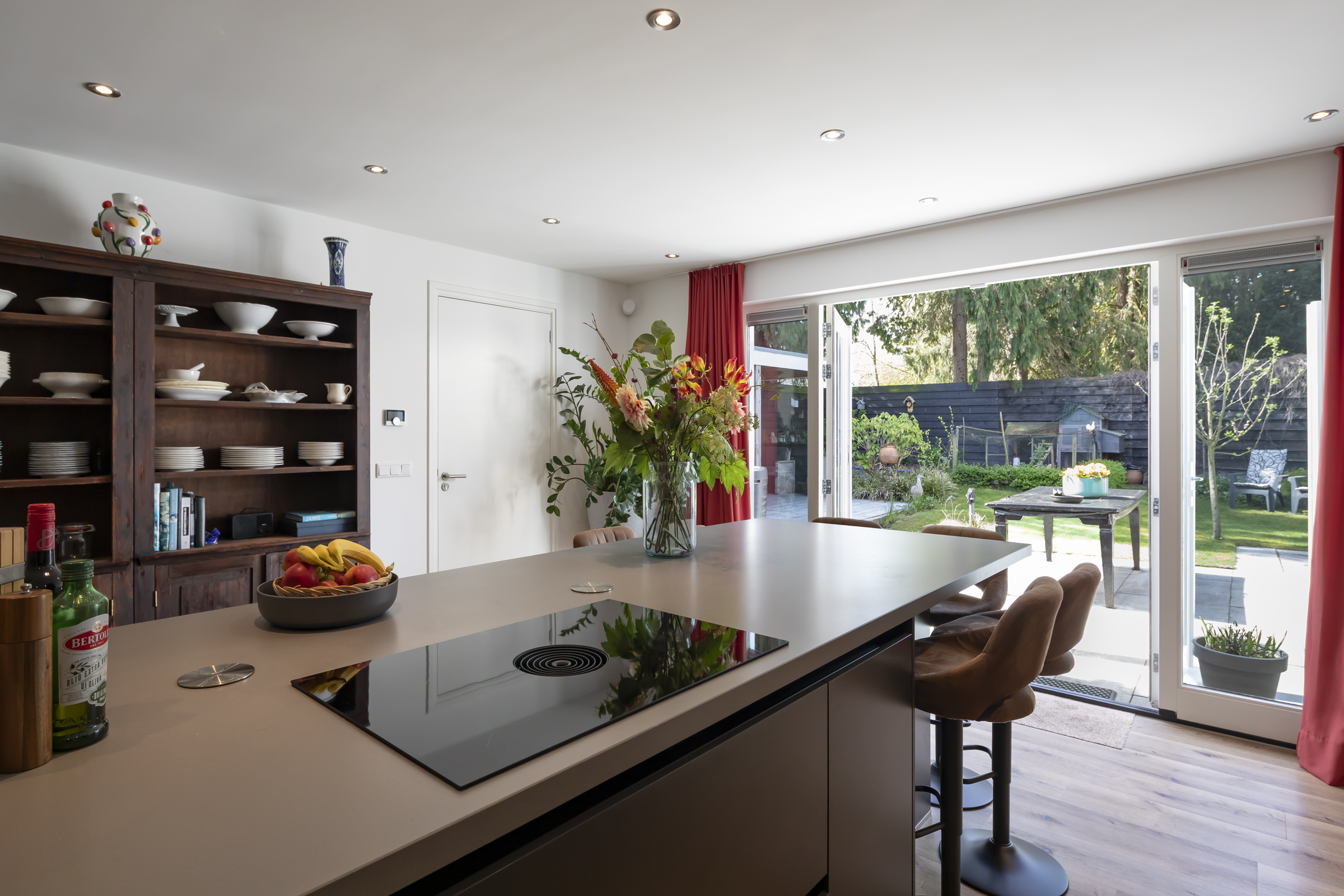 Renovated in 2021, the ground floor flows from a light filled living room with a glass front and garden views, into a spacious kitchen with a striking island, composite surfaces, and high quality appliances. Multiple garden doors open to the southwest facing landscaped garden, framed by an inviting veranda for year round enjoyment. A separate ground floor wing features a bedroom and bathroom suite with direct garden connection, while upstairs, three further bedrooms and a second bathroom enhance flexibility.