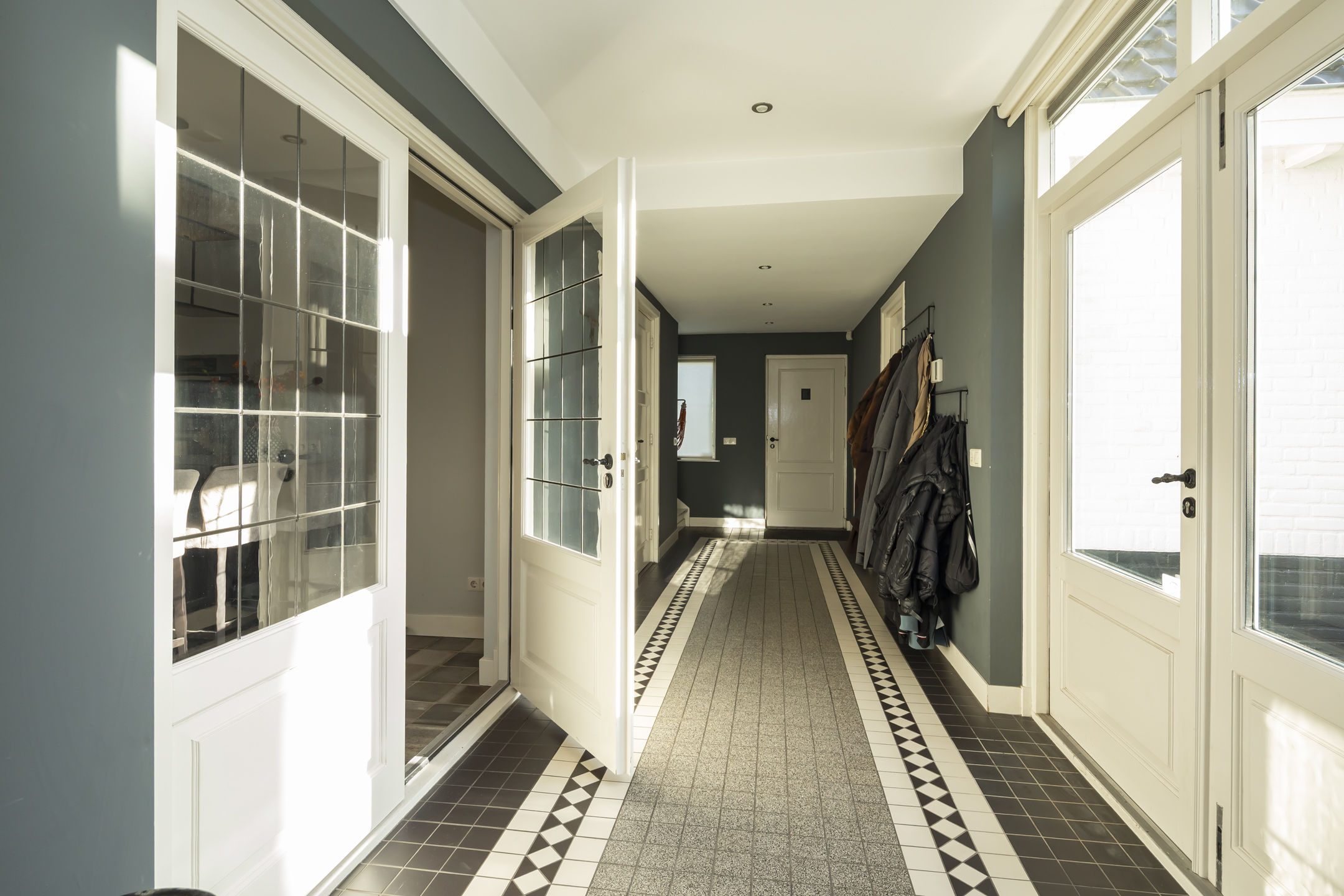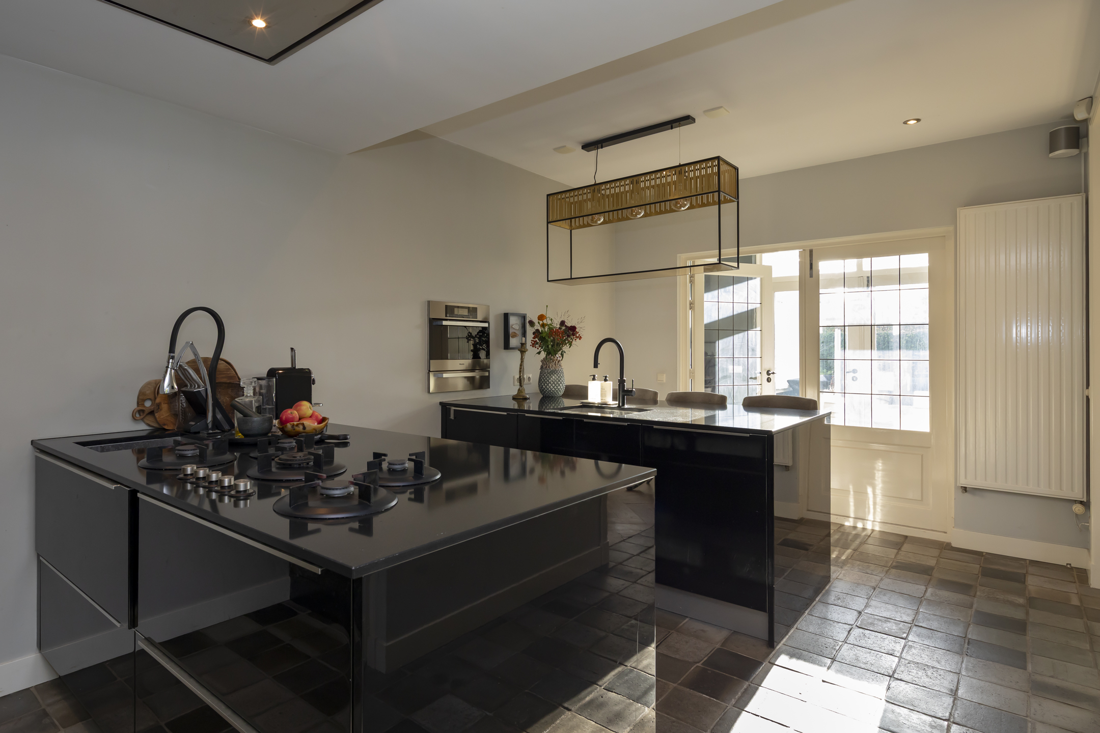 The residence showcases a refined entrance hall with high ceilings, authentic details, and a vibrant floor, setting a tone of understated luxury. The living room is defined by a rich ambiance and a classic fireplace, seamlessly connecting via French doors to a sheltered patio garden. Light flows through beautiful stained-glass en suite doors into the elegant dining room, while an additional multifunctional room offers flexibility for work or play, each with garden access. The contemporary kitchen is equipped with premium appliances, creating a space ideal for both culinary pursuits and informal gathering.