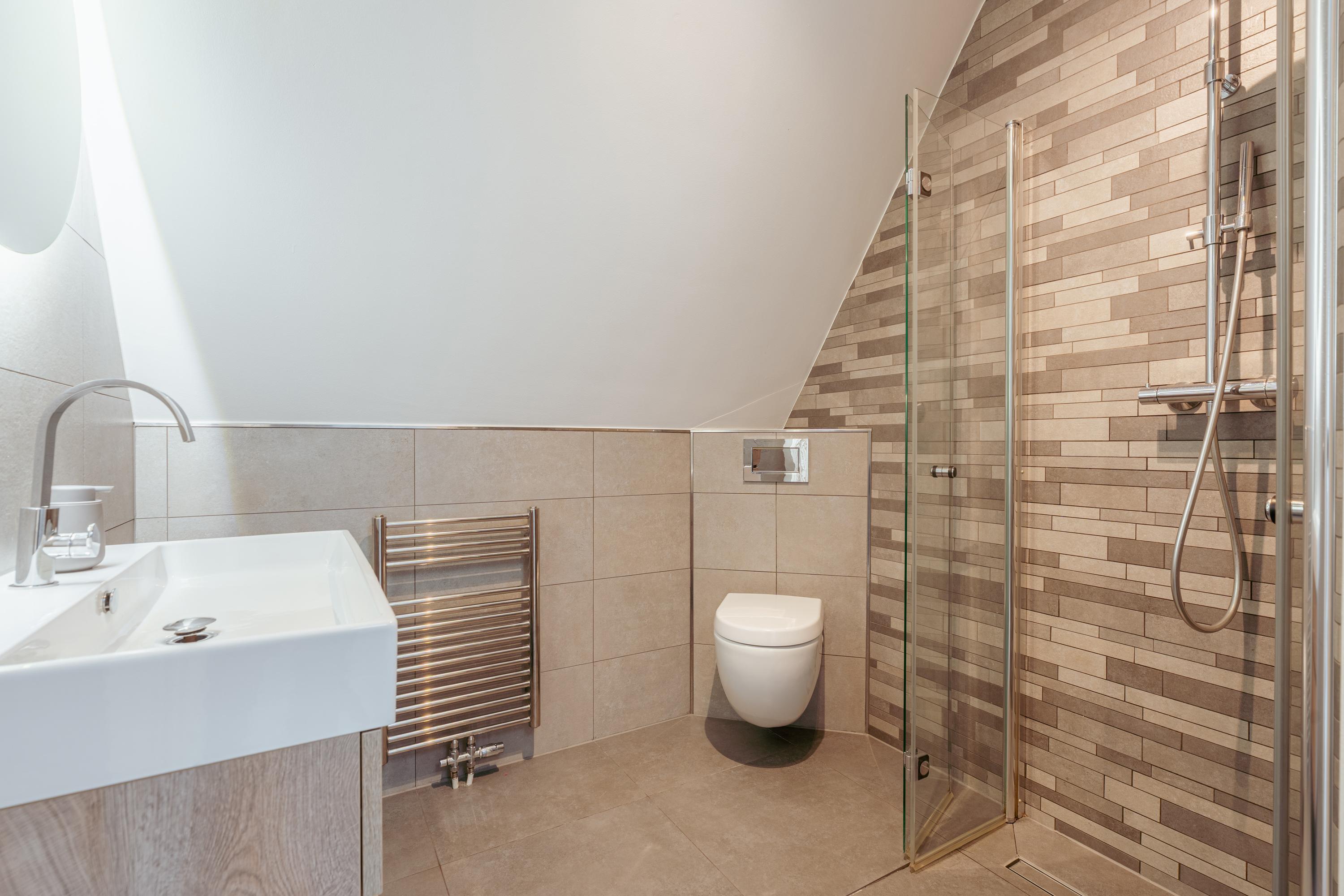 The second floor comprises two spacious bedrooms and a second bathroom, fitted with a toilet, washbasin and shower. Both bedrooms feature dormer windows on two sides, built-in wardrobes with sliding doors and air conditioning.