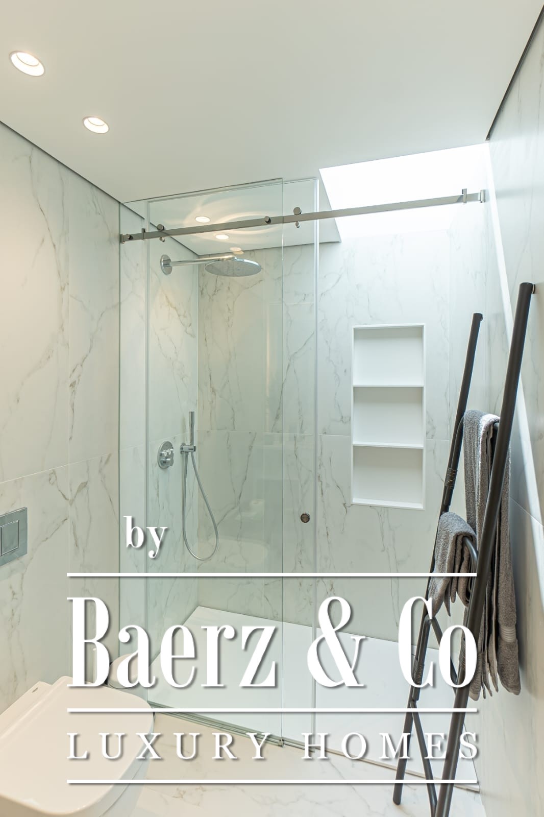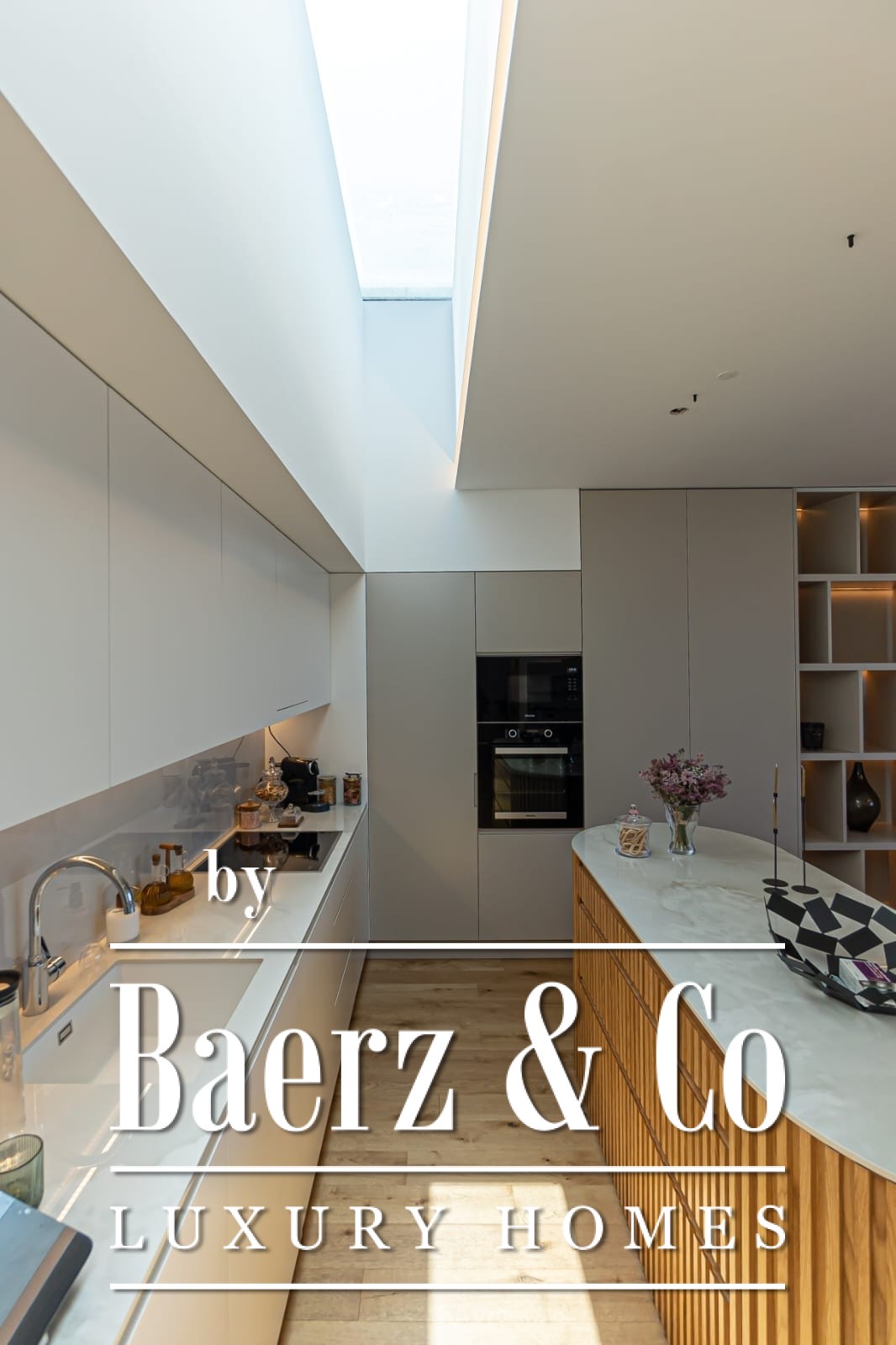 Spanning 112 m² of private space within a 159 m² plot, the apartment is meticulously planned. The open living and kitchen area, with a central island and natural light filtering from both the kitchen and bathroom, creates a fluid sense of space. Three bedrooms include a primary suite with a walk-in closet and access to a generous balcony, which features a dedicated dining area framed by panoramic sea vistas.