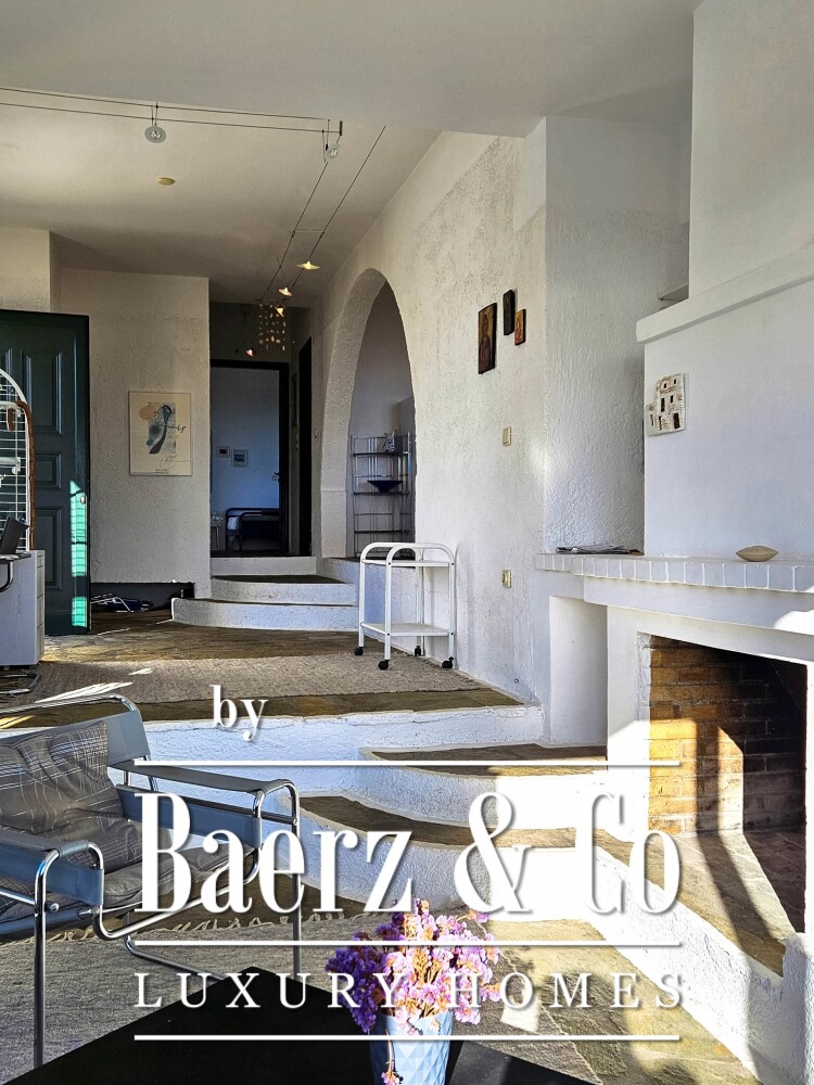 On the main level of 96.65 m², a living room with fireplace flows to a terrace overlooking the coastline, while a semi-separate kitchen and dining area, two bedrooms, bathroom, and guest WC complete the layout. The bedrooms offer immediate access to a paved, multi-level garden, creating a quiet transition between indoor and outdoor living.