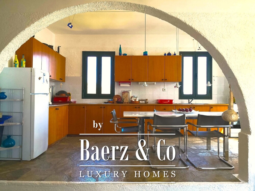This detached house Portocheli is set within 5,800 m² of landscaped grounds, surrounded by lush greenery just 350 metres from the sea. The property spans 148 m² over two levels, shaped by Cycladic architectural lines, whitewashed walls, and cubic forms. Openings and spacious terraces orient the interiors toward unobstructed sea and panoramic views, bringing in clarity and light.