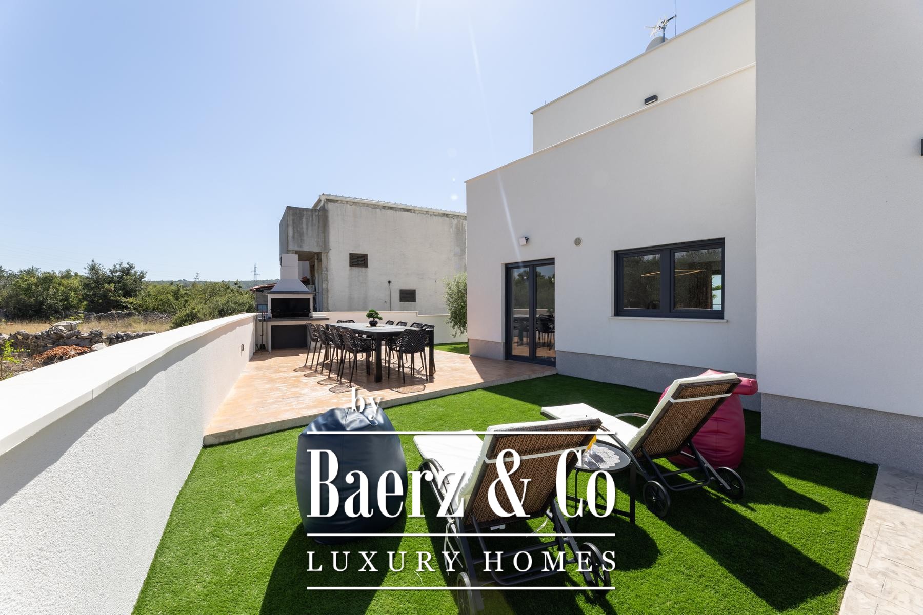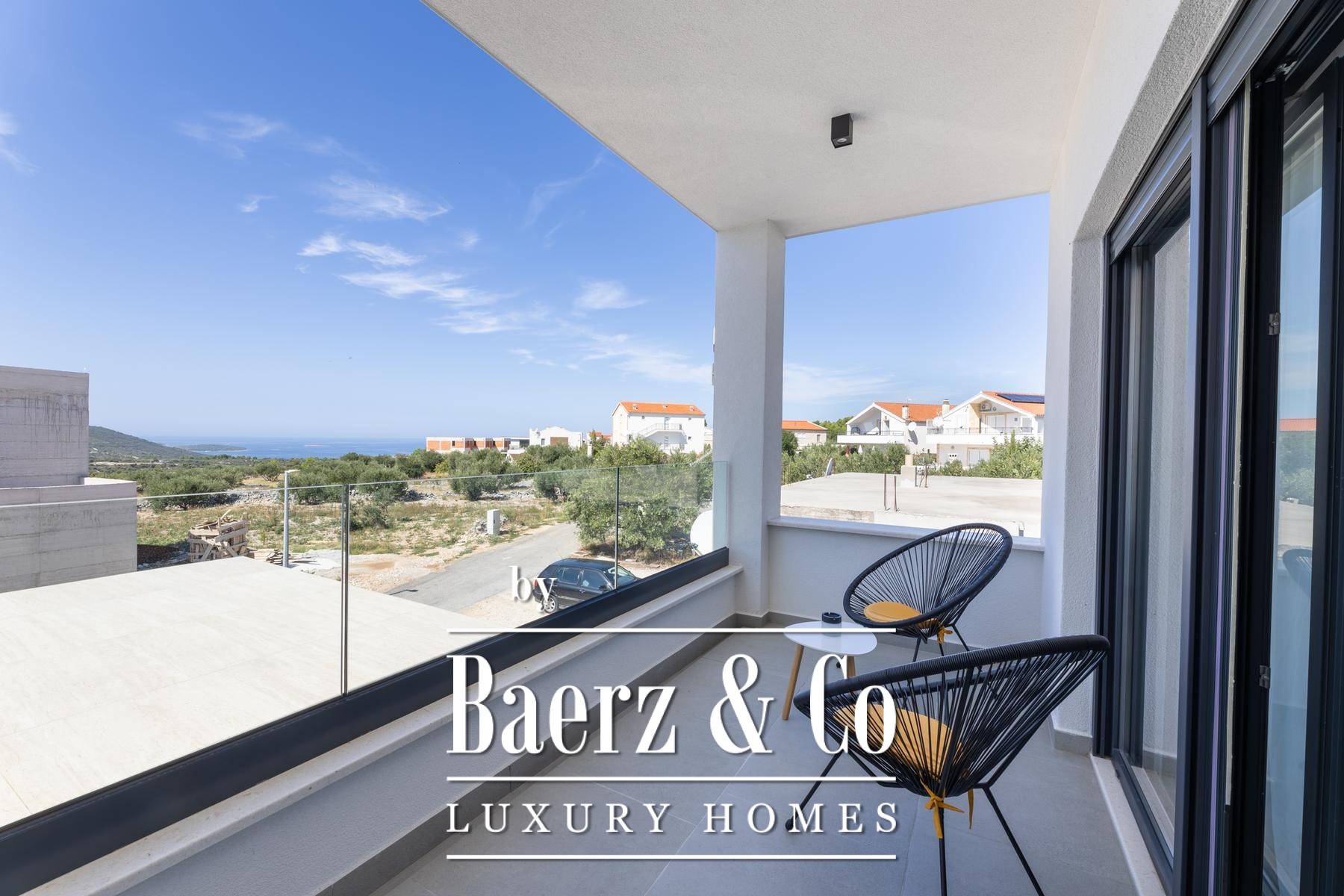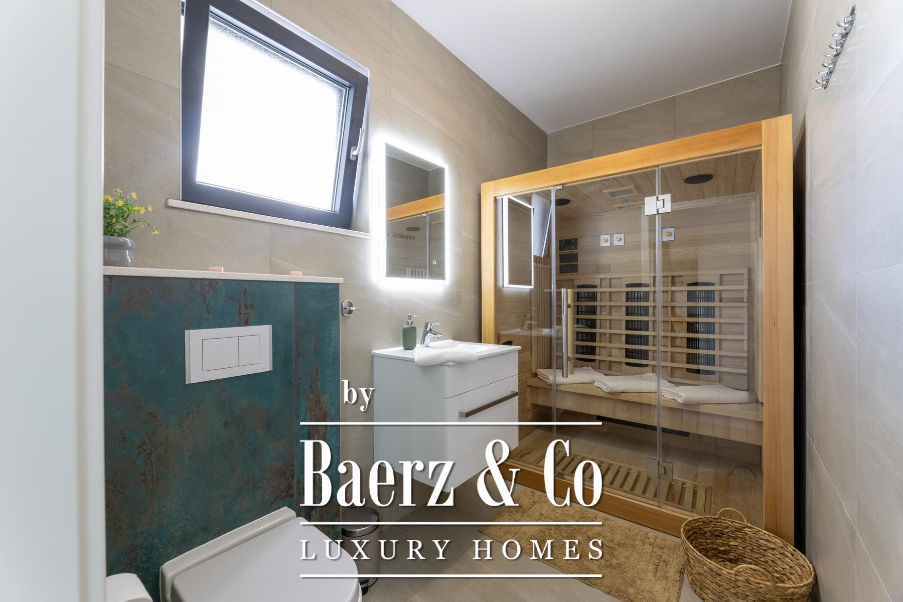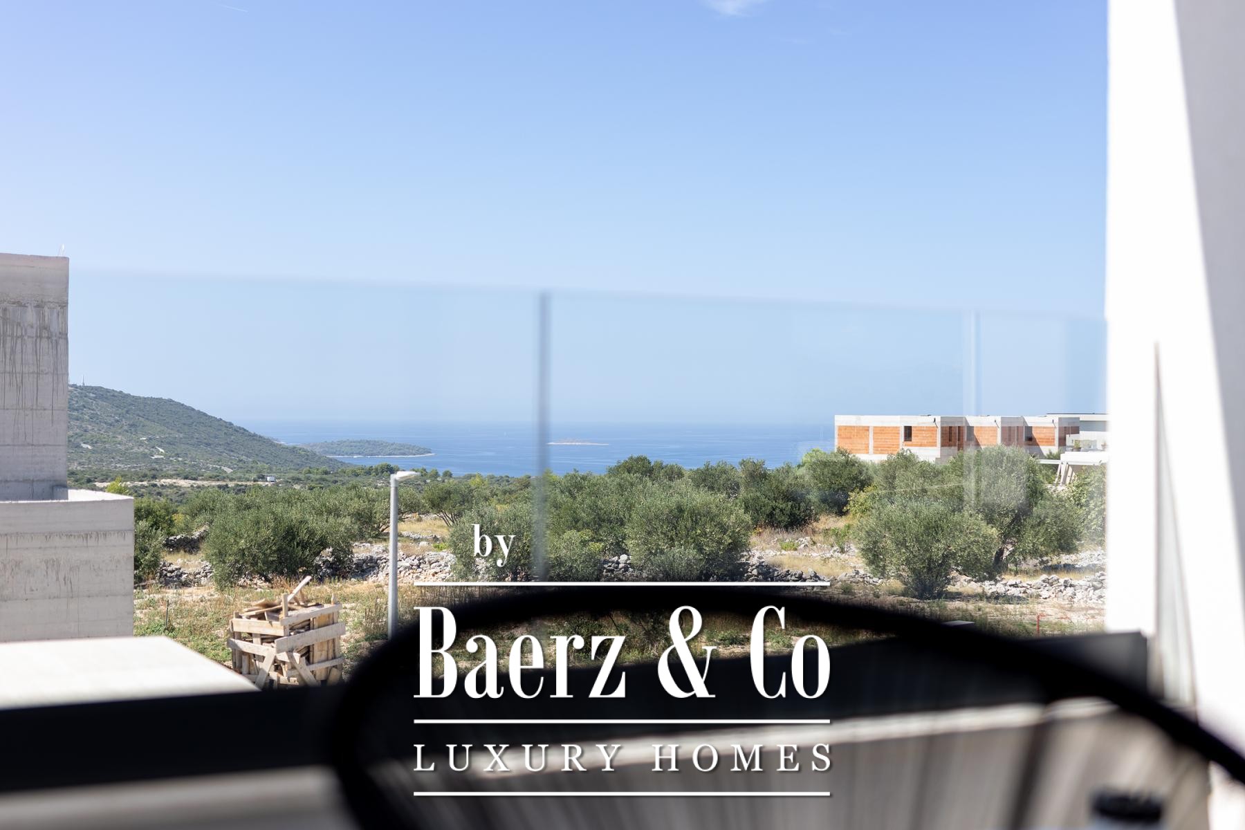 Villa Primošten with sea view presents a modern Croatian retreat defined by its 311.56 m² of refined living space and compelling Adriatic outlook. Completed in 2024 on a 515 m² plot, this residence articulates contemporary architecture across three thoughtfully arranged floors. The main level flows from a light-filled living room into a kitchen and dining area, accompanied by a bedroom suite and a separate wellness room with a sauna. Expansive glass doors open onto a sheltered terrace beside the pool, where a counter-current swimming system invites leisure and fitness alike.