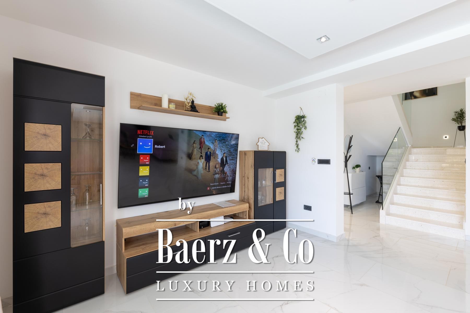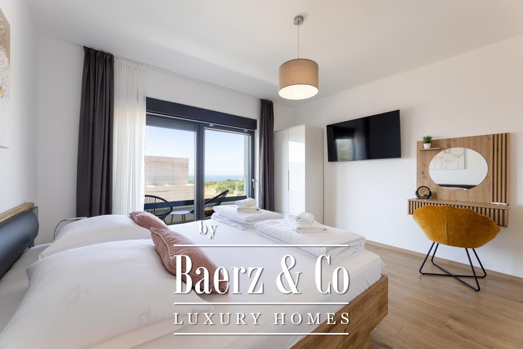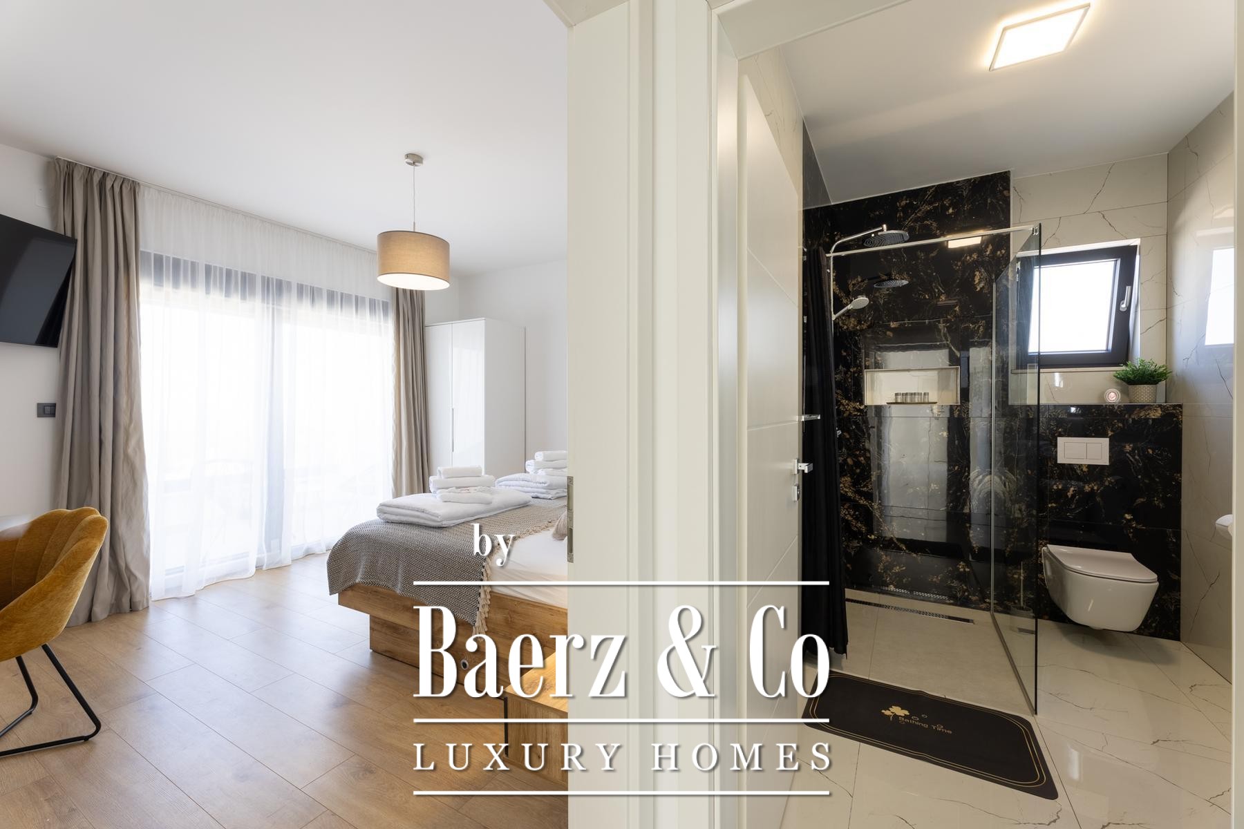 Villa Primošten with sea view presents a modern Croatian retreat defined by its 311.56 m² of refined living space and compelling Adriatic outlook. Completed in 2024 on a 515 m² plot, this residence articulates contemporary architecture across three thoughtfully arranged floors. The main level flows from a light-filled living room into a kitchen and dining area, accompanied by a bedroom suite and a separate wellness room with a sauna. Expansive glass doors open onto a sheltered terrace beside the pool, where a counter-current swimming system invites leisure and fitness alike.