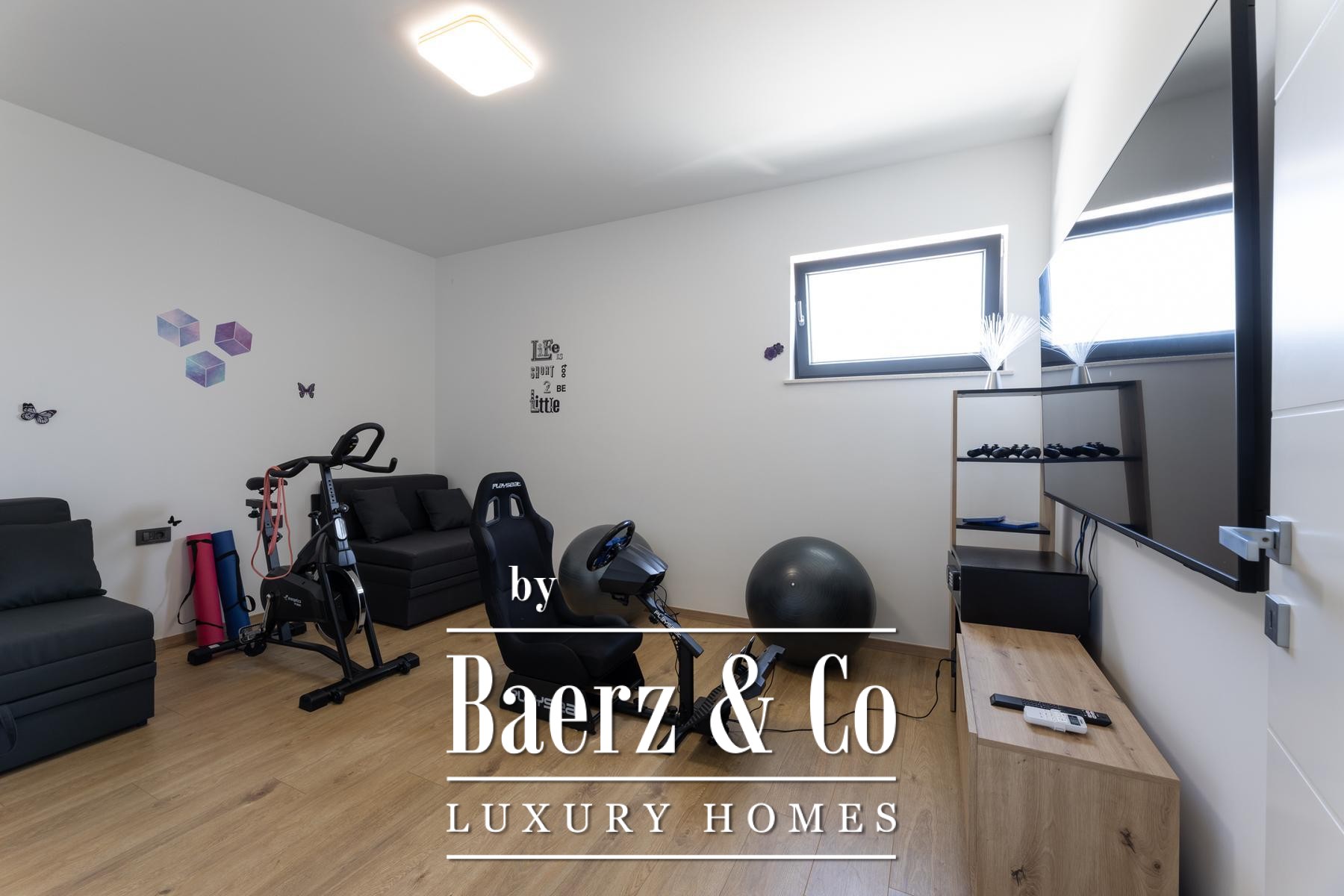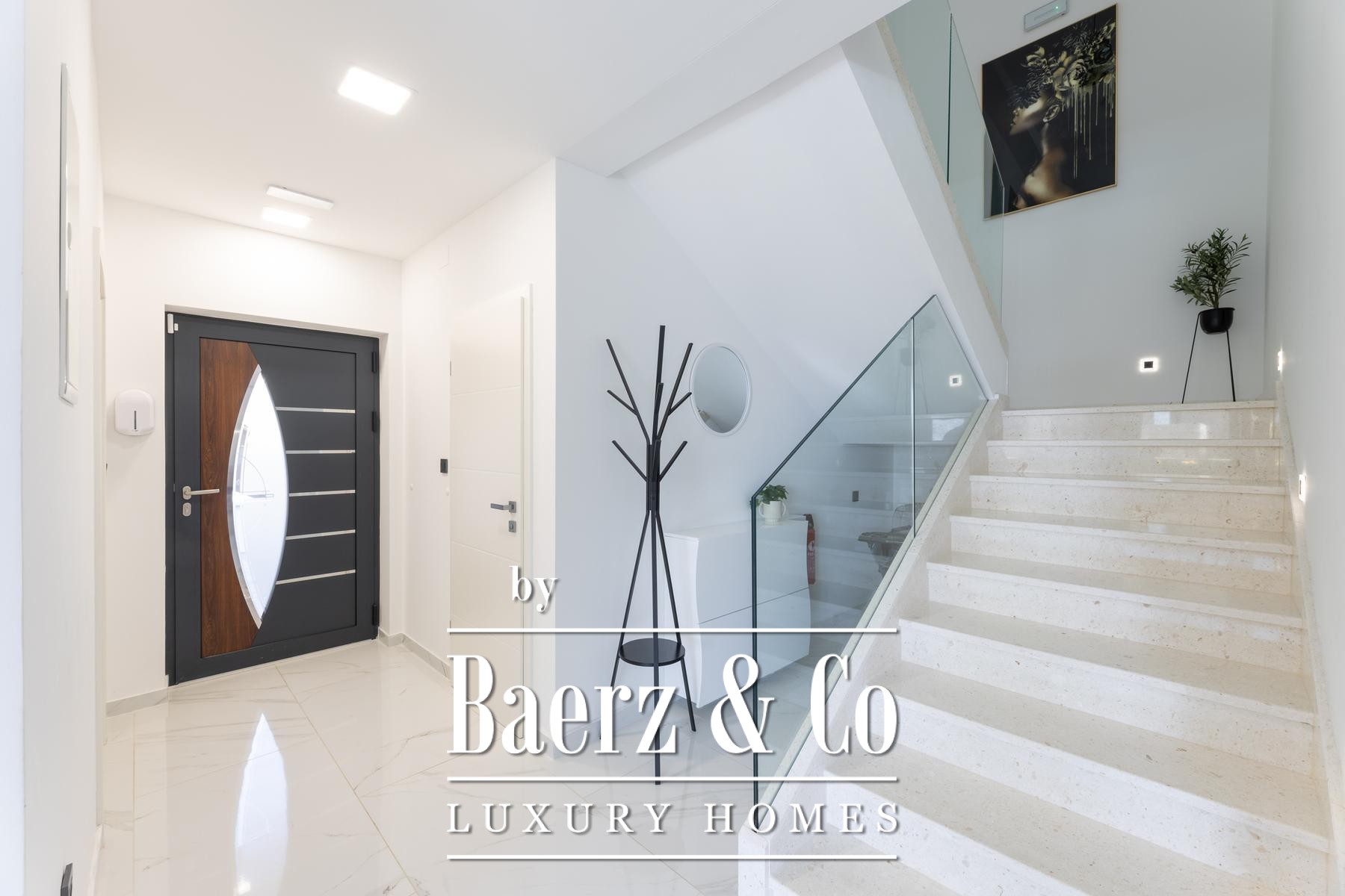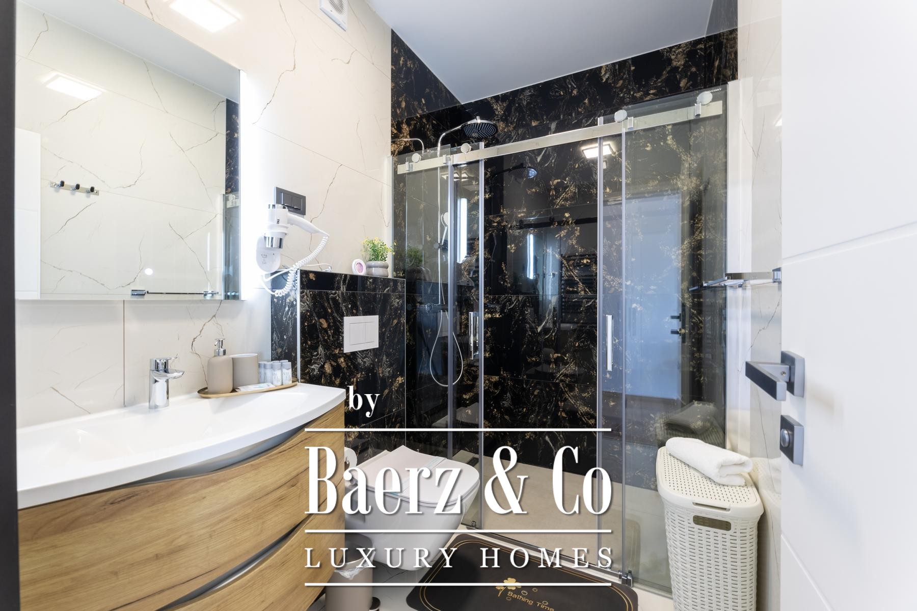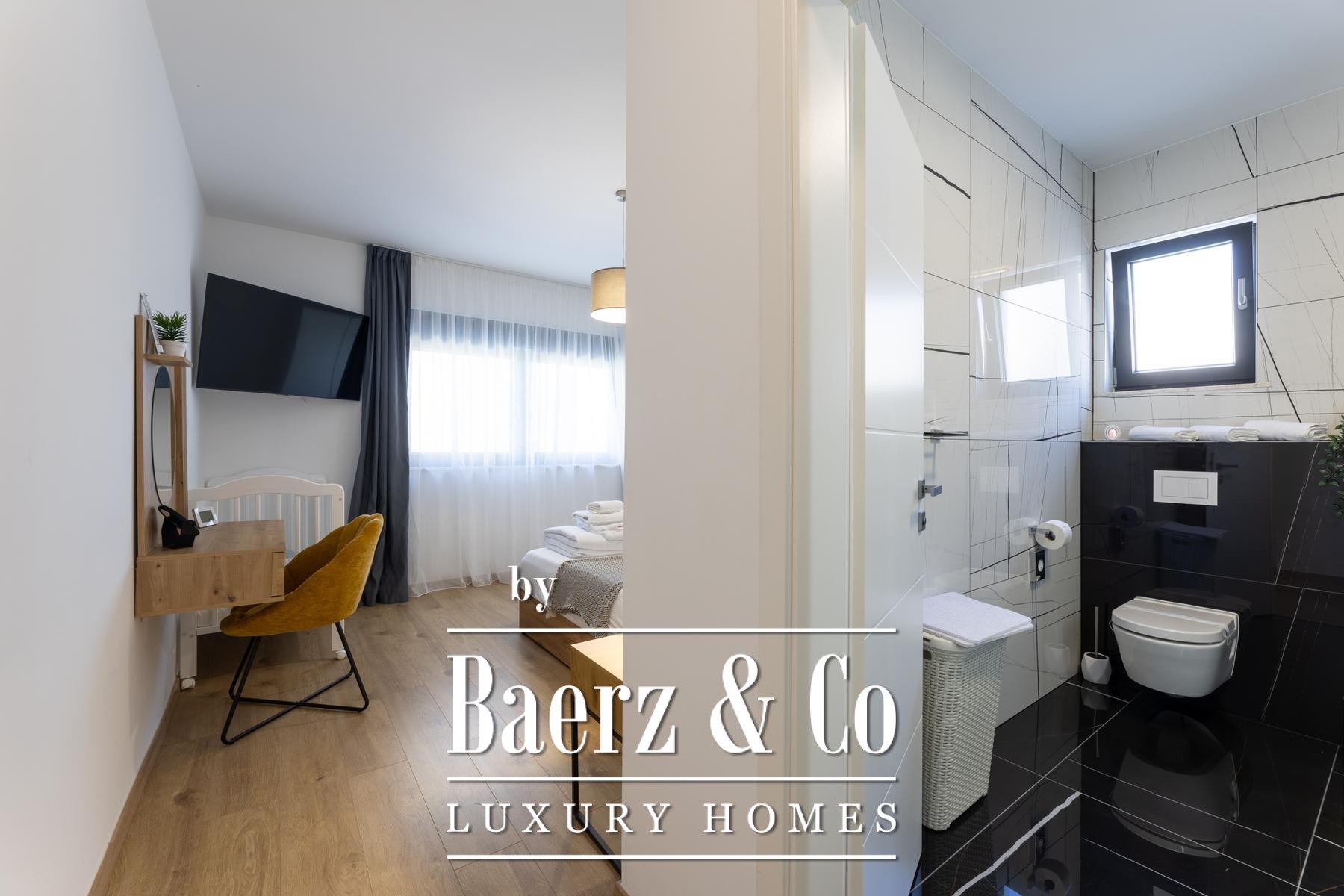 Villa Primošten with sea view presents a modern Croatian retreat defined by its 311.56 m² of refined living space and compelling Adriatic outlook. Completed in 2024 on a 515 m² plot, this residence articulates contemporary architecture across three thoughtfully arranged floors. The main level flows from a light-filled living room into a kitchen and dining area, accompanied by a bedroom suite and a separate wellness room with a sauna. Expansive glass doors open onto a sheltered terrace beside the pool, where a counter-current swimming system invites leisure and fitness alike.