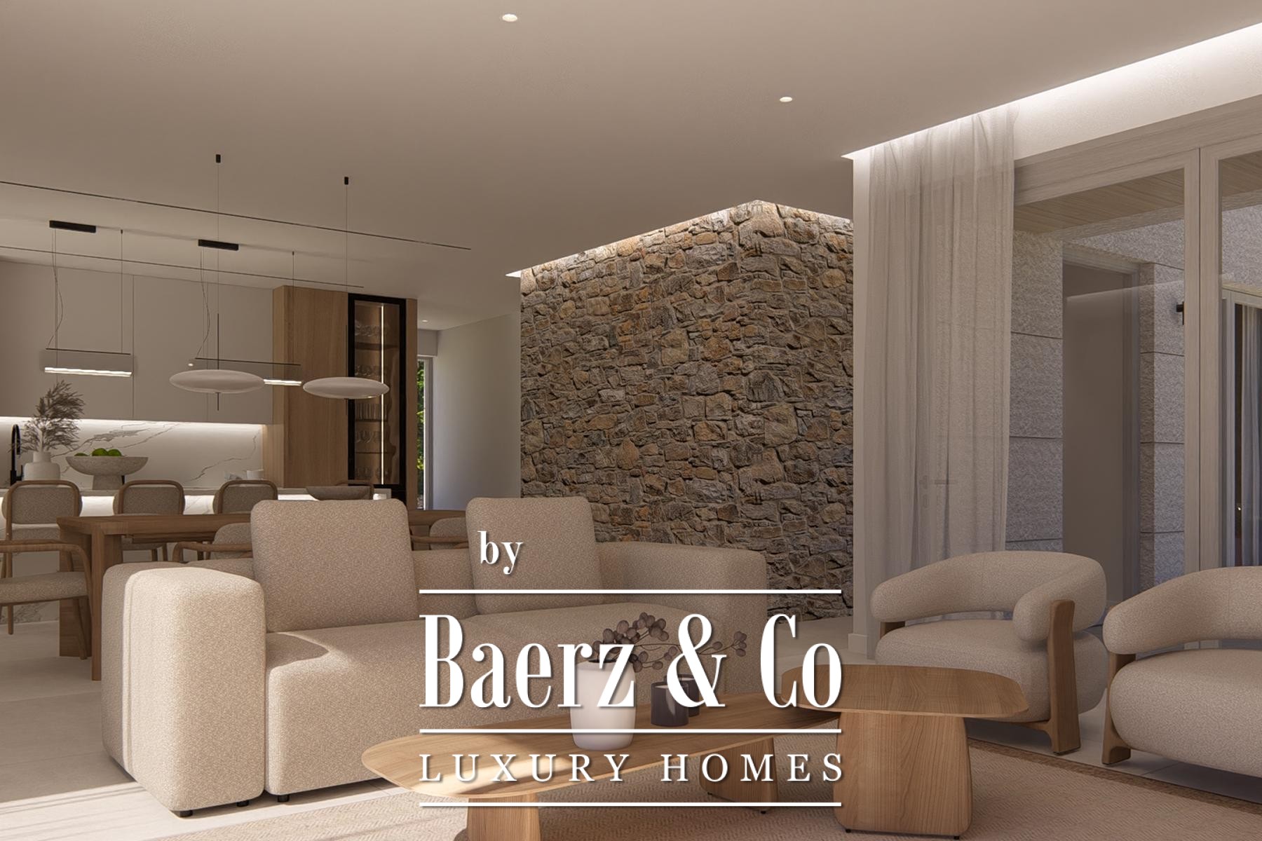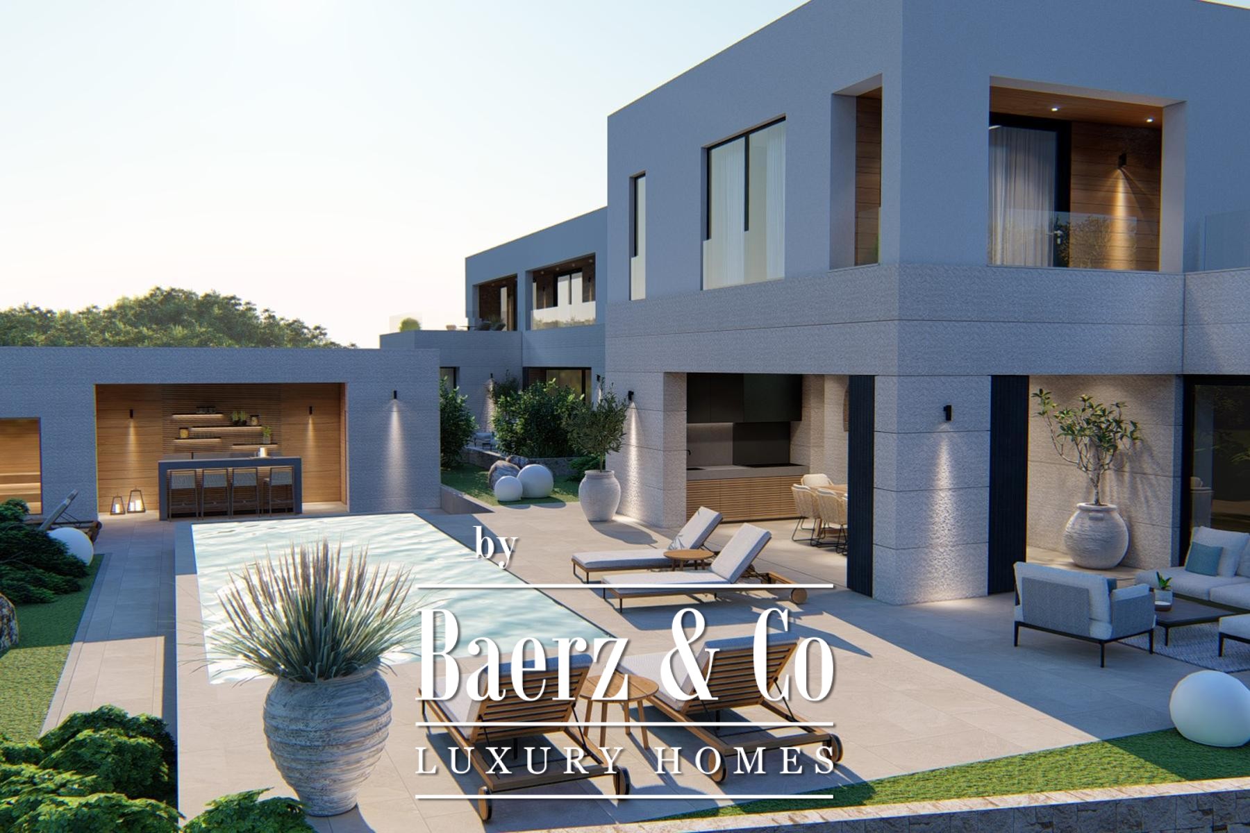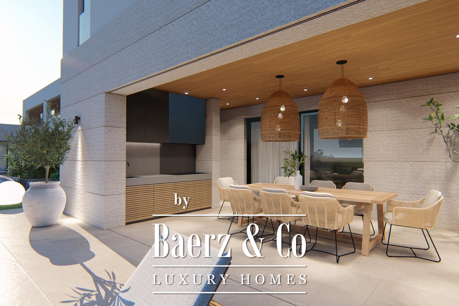 The main level welcomes you with an open living room, kitchen, and dining area, flowing onto a covered terrace with a barbecue. Here, expansive glass doors frame sea views and bring in natural light. The ground floor features one bedroom with its own private bathroom, while the first floor holds three further bedrooms, each with en-suite bathrooms and loggia access. The upper floor opens to a generous terrace, enhancing the flow between indoors and out.