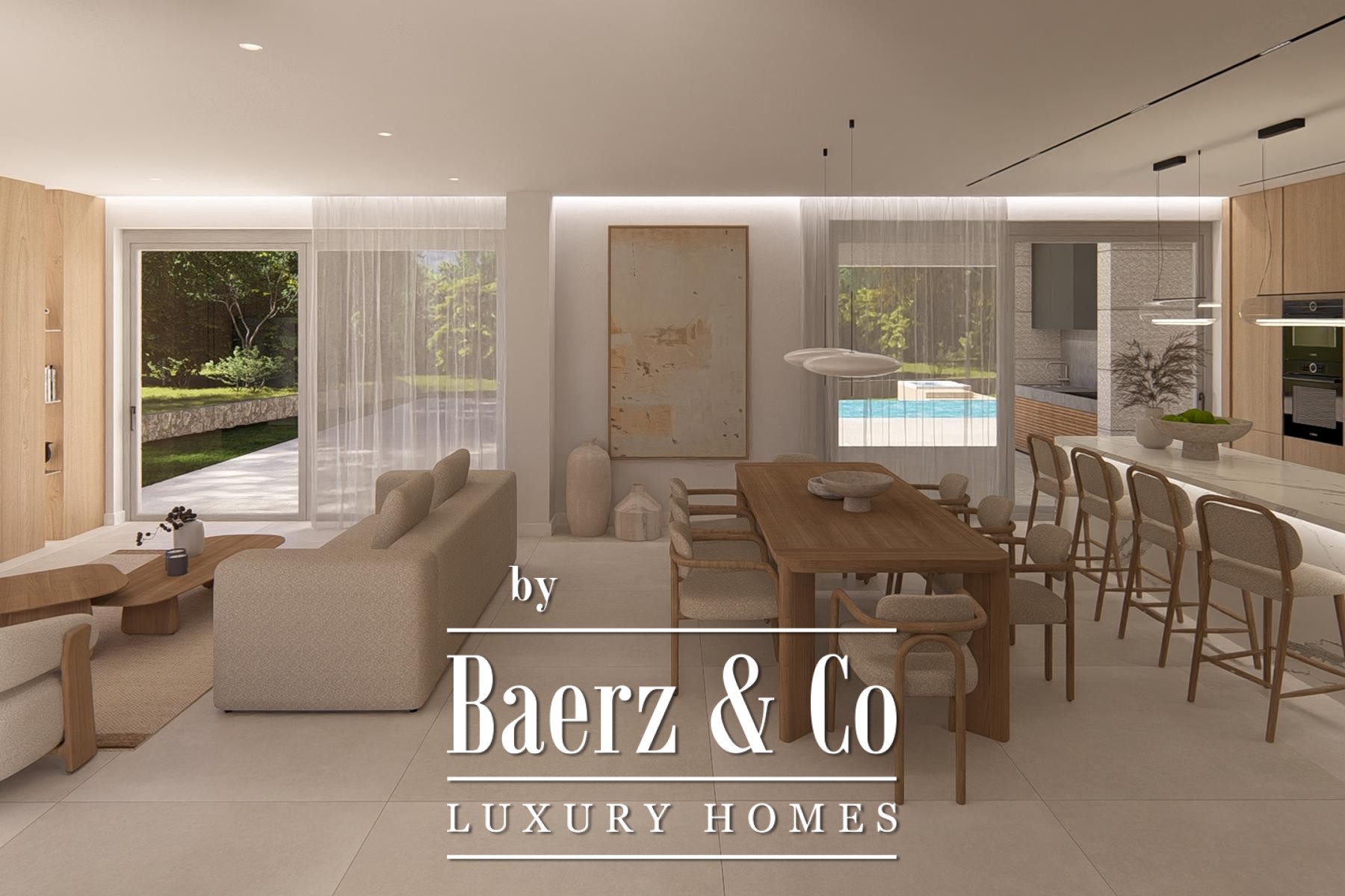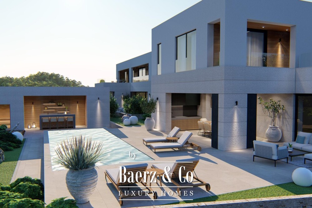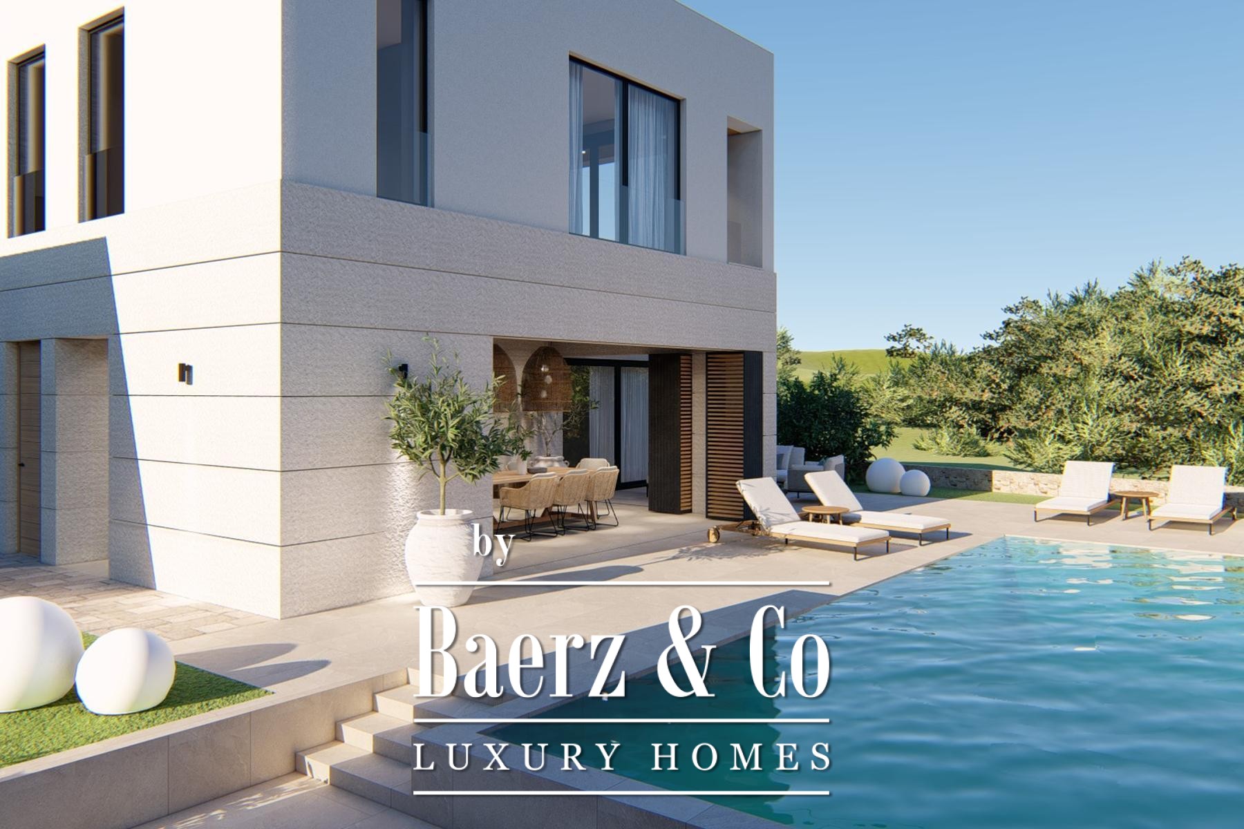 The main level welcomes you with an open living room, kitchen, and dining area, flowing onto a covered terrace with a barbecue. Here, expansive glass doors frame sea views and bring in natural light. The ground floor features one bedroom with its own private bathroom, while the first floor holds three further bedrooms, each with en-suite bathrooms and loggia access. The upper floor opens to a generous terrace, enhancing the flow between indoors and out.