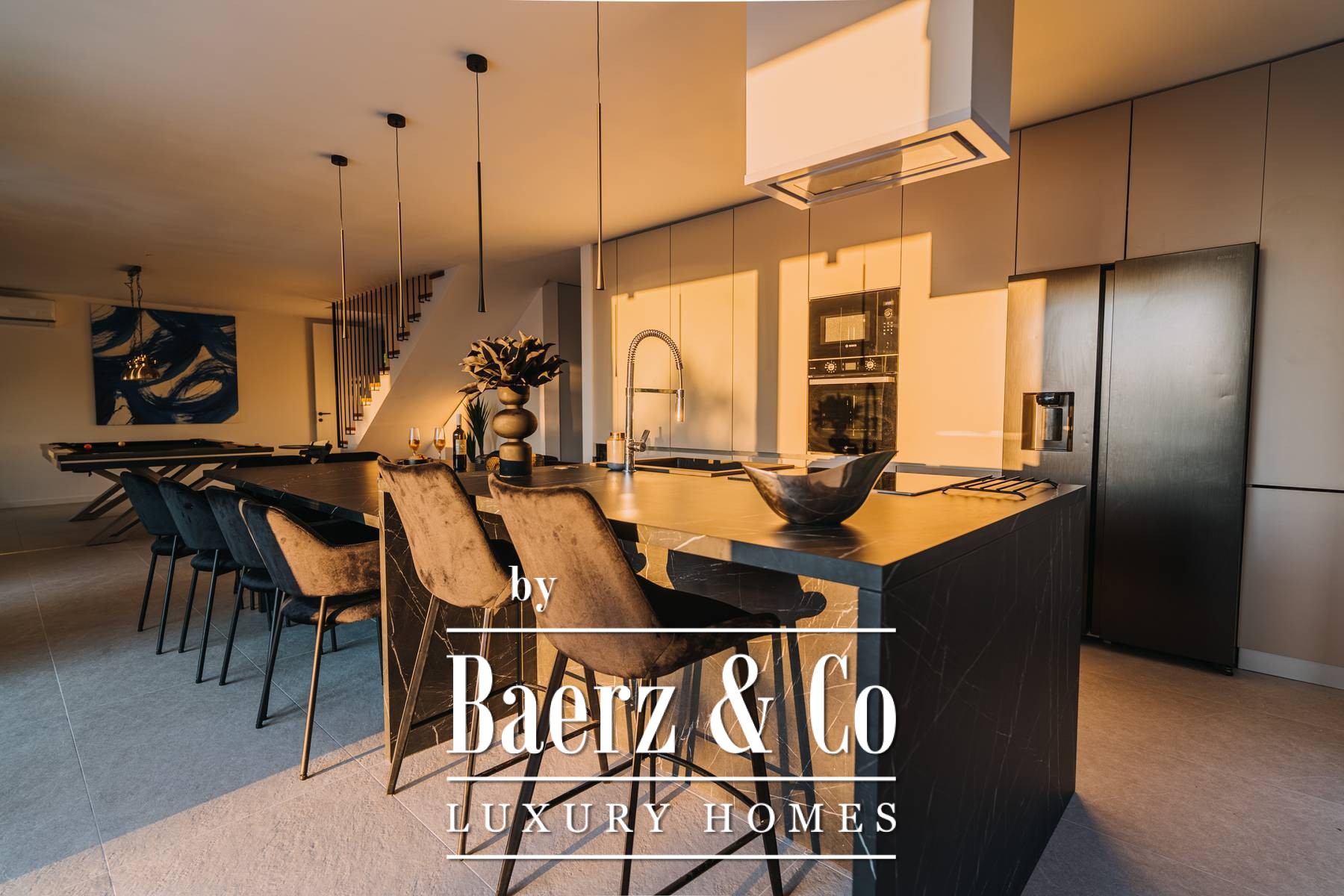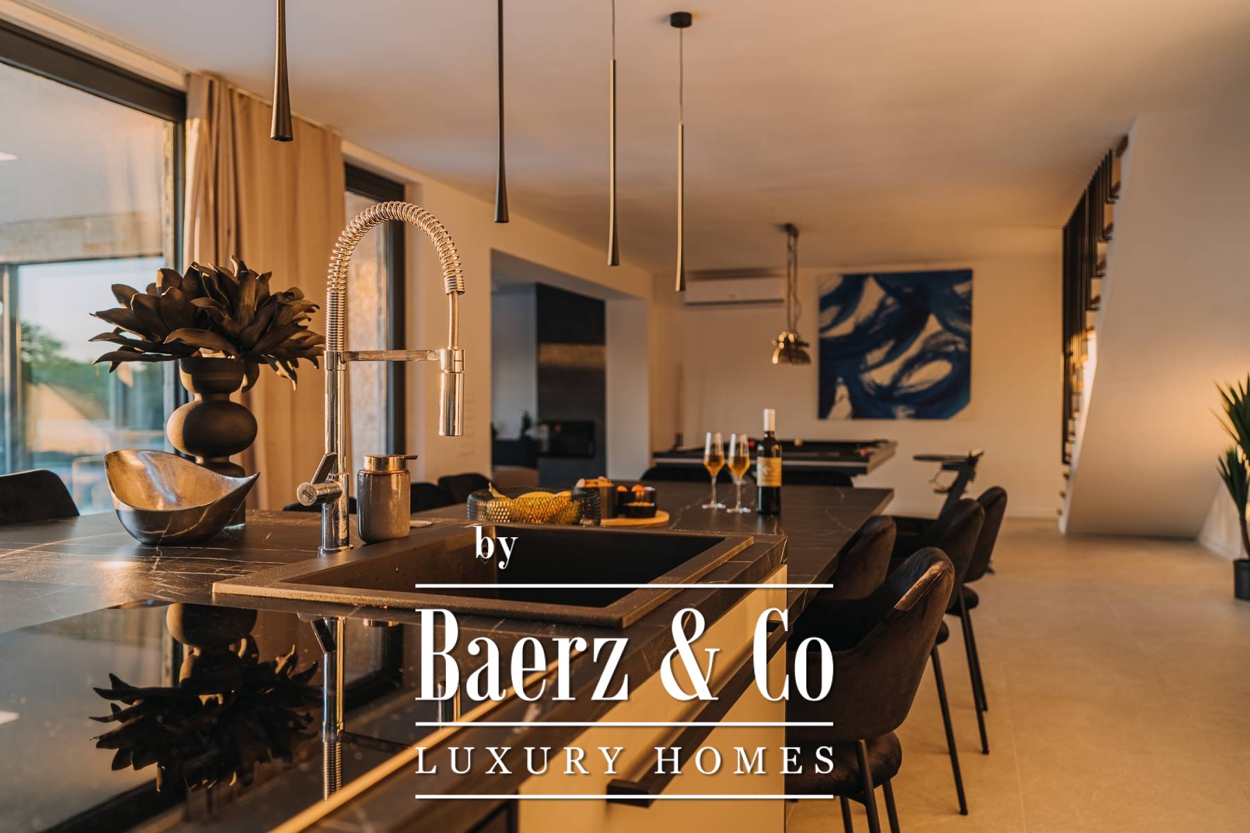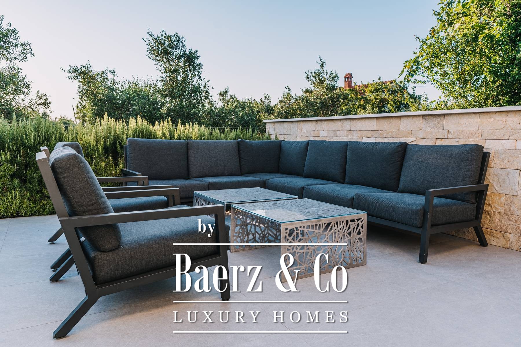 Built in 2023, the villa employs high quality materials and is equipped with solar panels, advanced appliances, and tasteful furnishings. Wellness touches include a 60 m² heated swimming pool with hydromassage, a spacious jacuzzi on the sun terrace, and an in-house sauna. The upper balcony opens to tranquil views, while outdoor spaces invite private relaxation, whether on the sundeck or the covered lounge area. Every element has been curated for a measured pace of life, anchored by privacy and natural light.