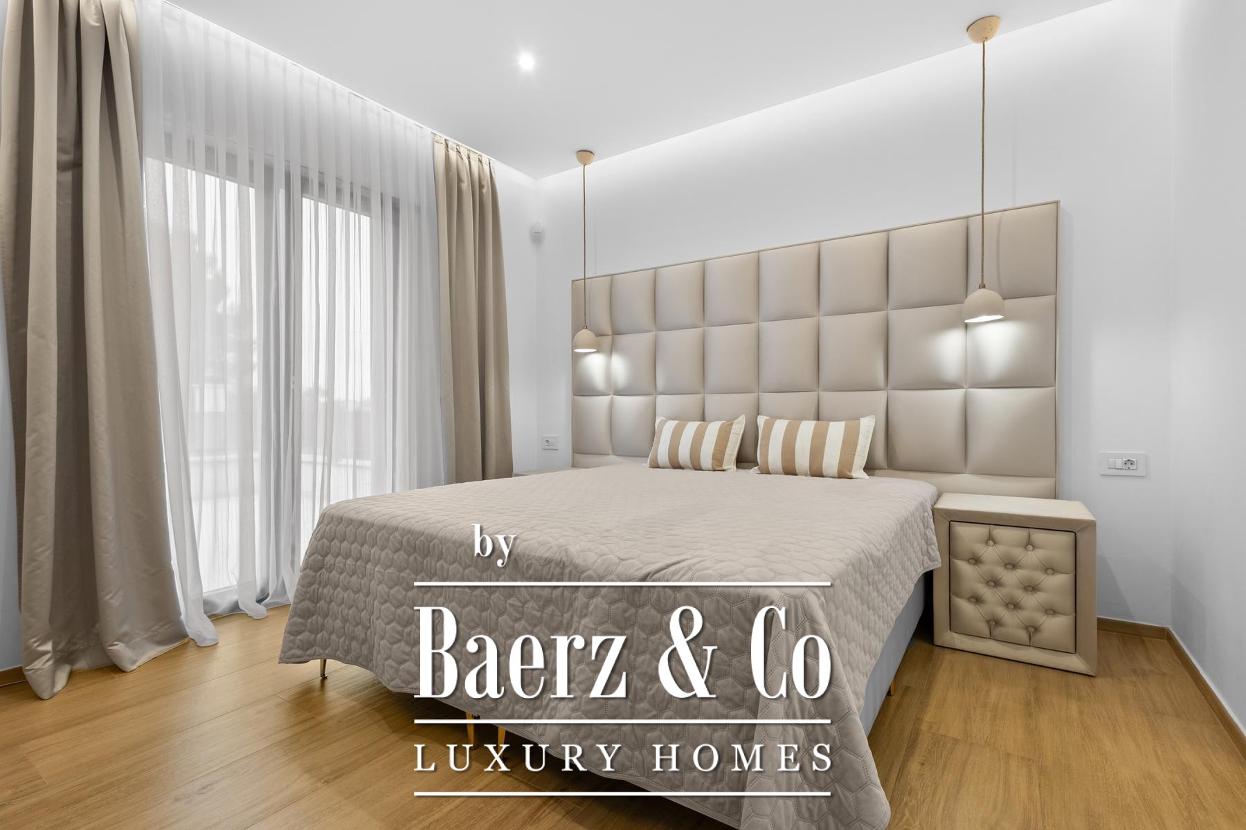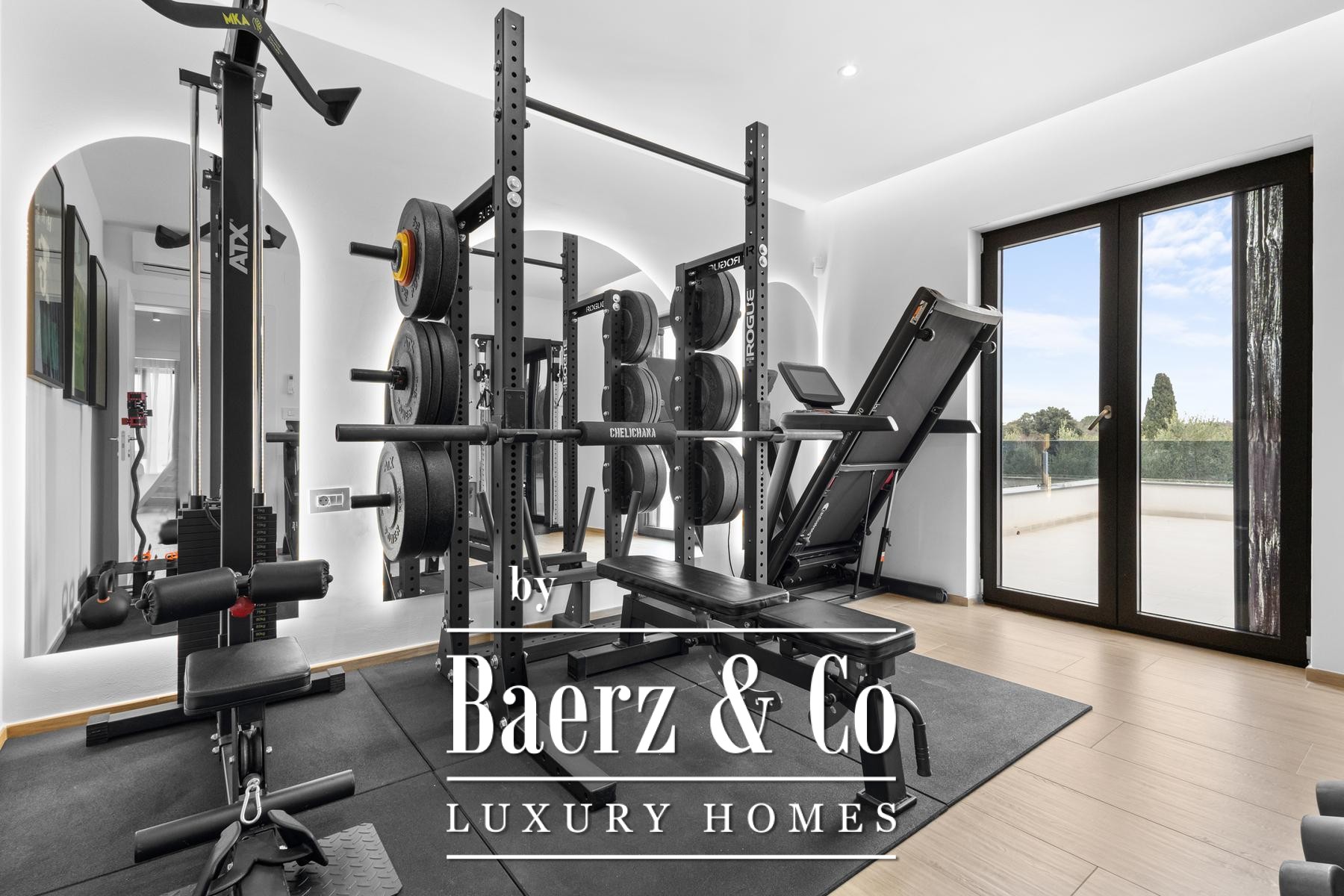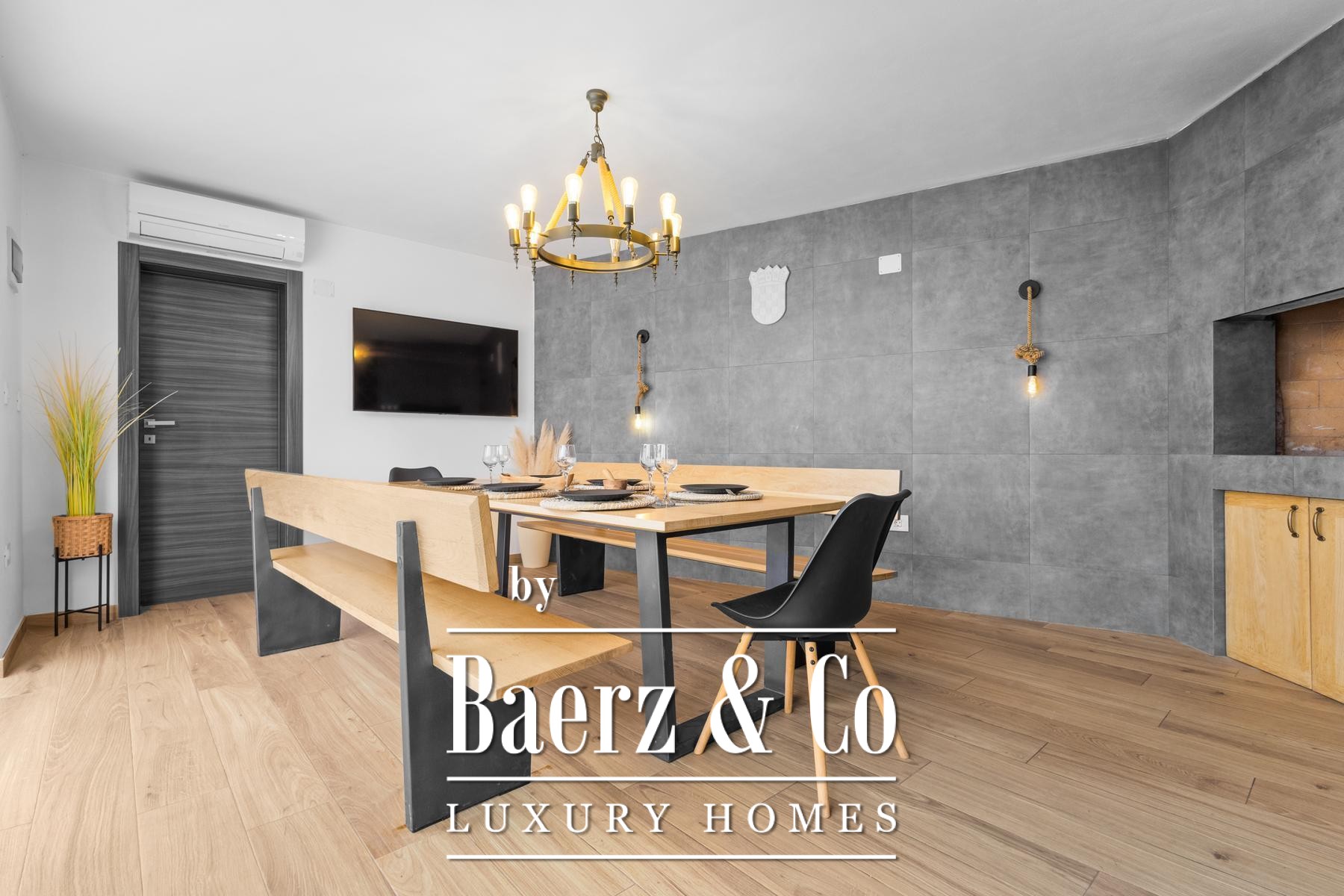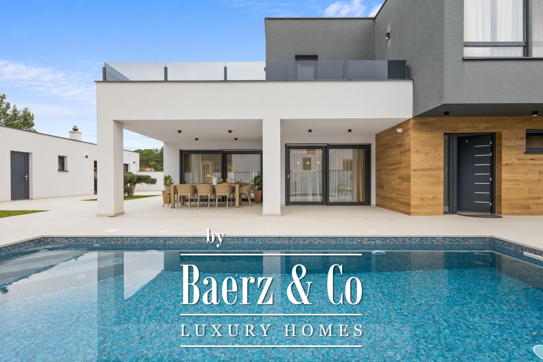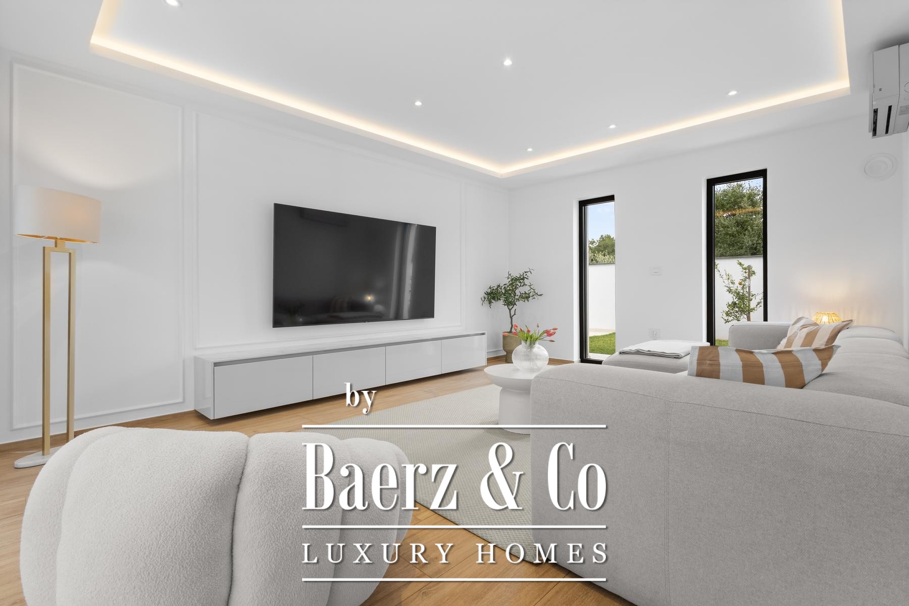 Outdoors, a heated 32 m² pool with saltwater system sits alongside a landscaped sun terrace and a 25 m² tavern with fireplace, creating a private domain for reflection or quiet gatherings. Further ease is ensured by a 35 m² garage, three additional parking spaces, video surveillance, and alarm. Technical precision is seen in underfloor heating, air conditioning throughout, and bespoke furnishings. This luxury villa for sale in Pula distills contemporary design and true comfort within its tranquil setting.