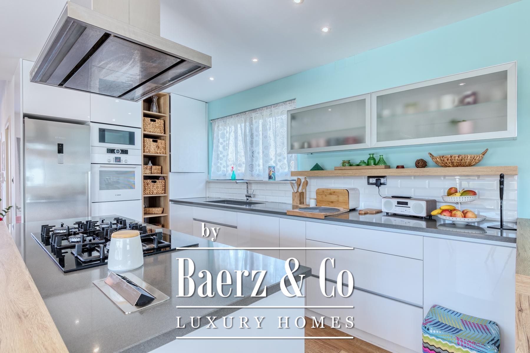 The ground floor's layout is defined by an inviting entrance hall that unfolds to an open-plan living area, modern kitchen, and dining space, each with access to a covered terrace. A bedroom with an en-suite bathroom on this level offers versatility for guests or private retreat. Outdoors, the Mediterranean mood is amplified by a swimming pool, sun deck, and a covered summer kitchen with a fireplace and grill. The surrounding garden is thoughtfully landscaped, enhancing the refuge and subtle exclusivity of the property.