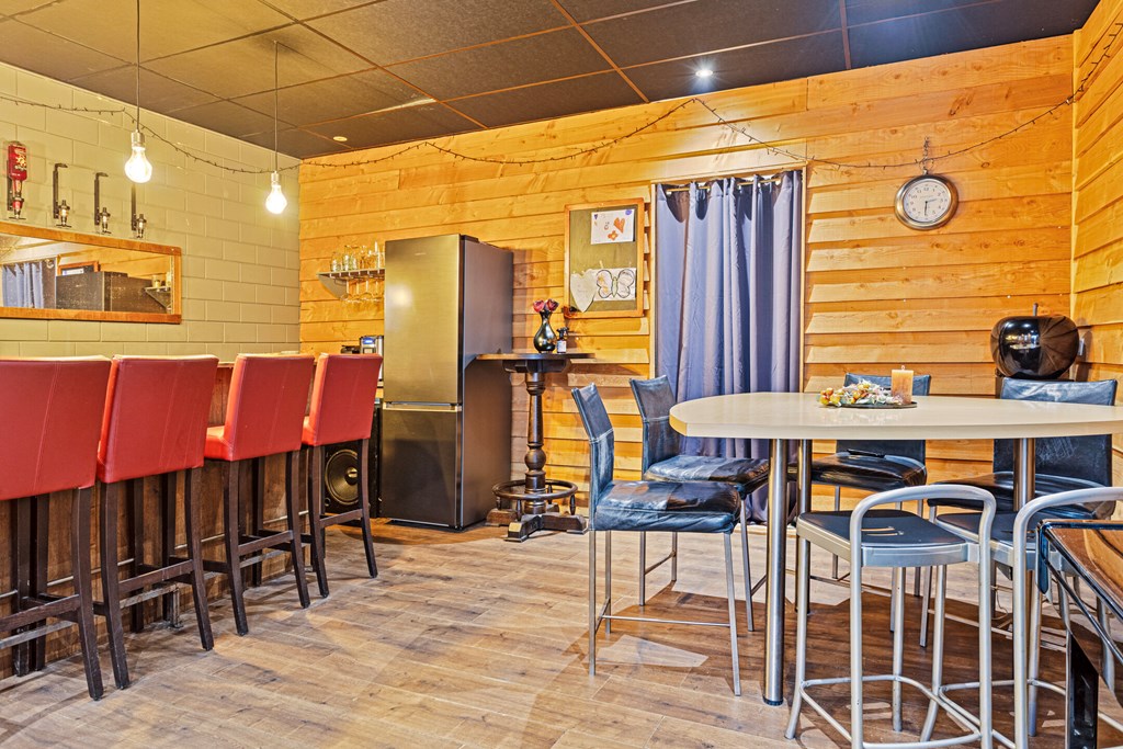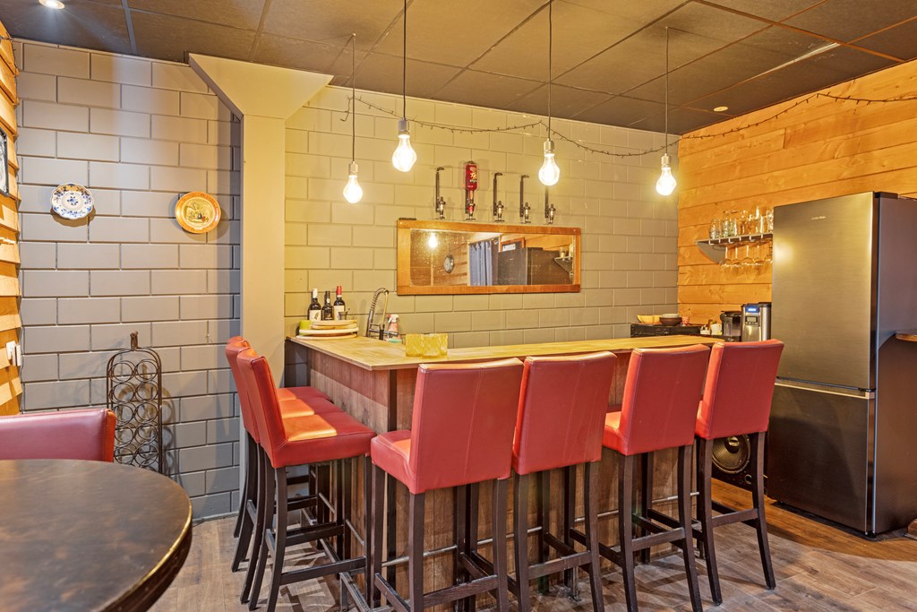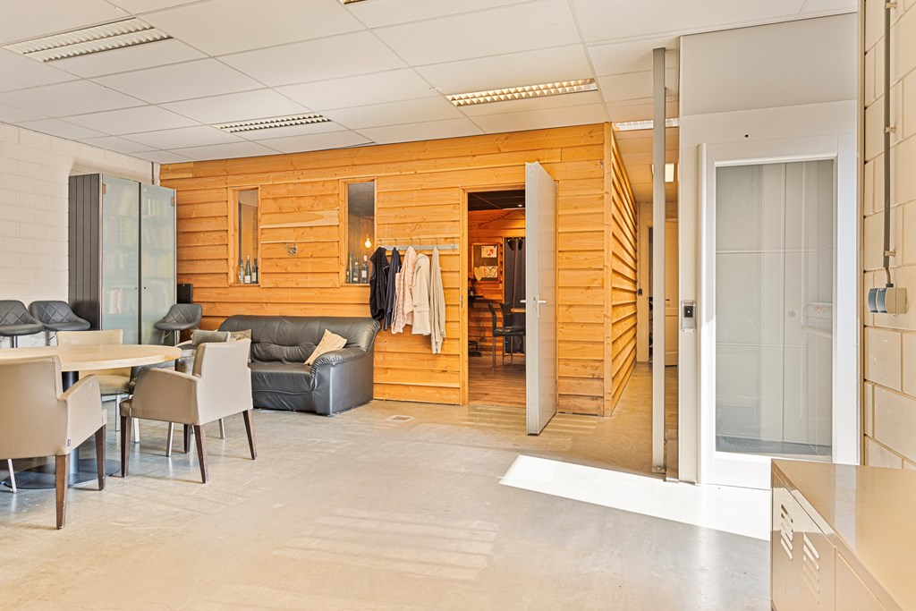 Adjacent is the spacious garage, accessible via an electric overhead door, with room for multiple cars. At the rear of the garage you’ll find a practical kitchenette and a toilet with washbasin.