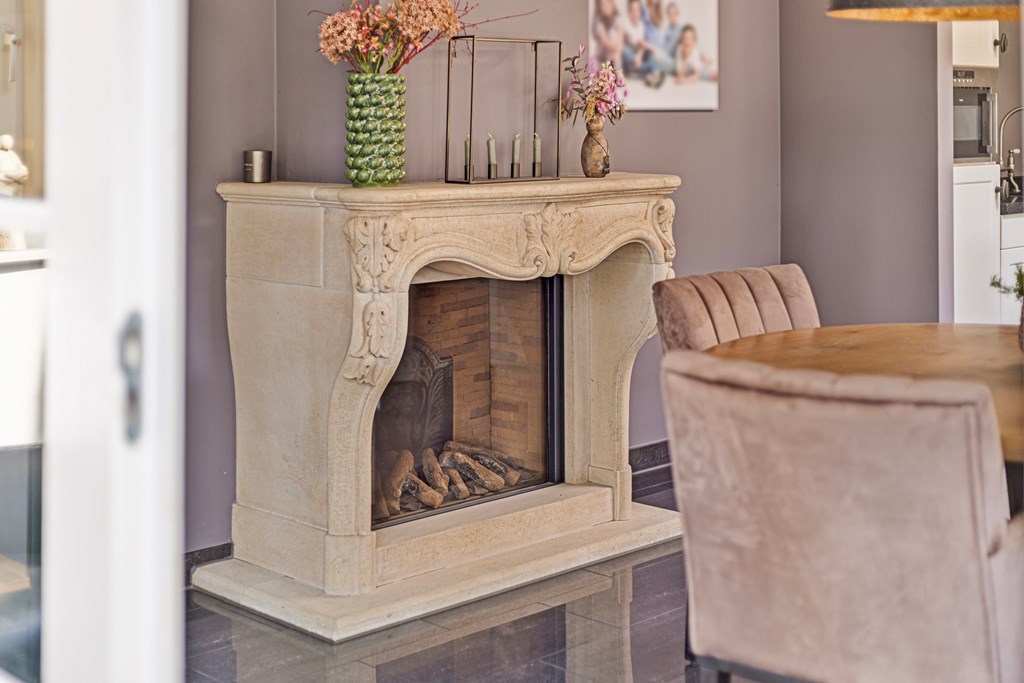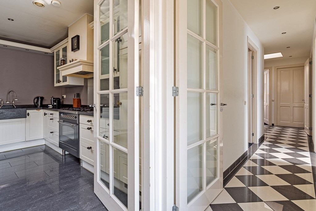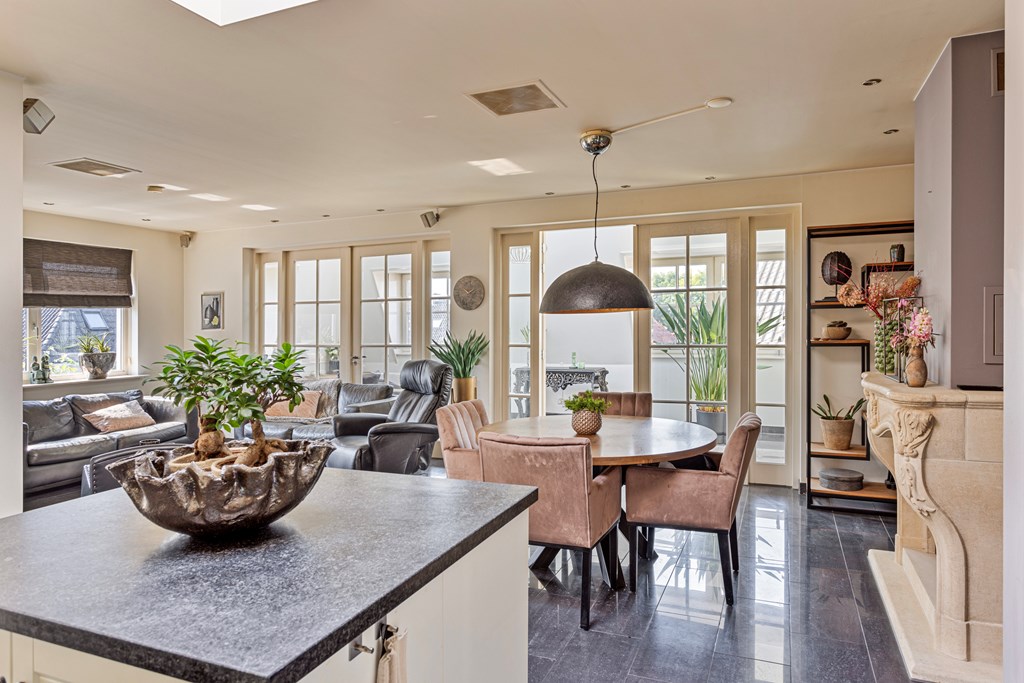 On the first floor, you reach the hall via the stairs or the lift. From the hall, you enter the generous living area with open kitchen, finished with a stylish natural stone floor. The kitchen island offers more than enough workspace and a lovely outlook over the dining area. The open-plan kitchen features a modern island and is fitted with luxury appliances, including a Boretti gas range.