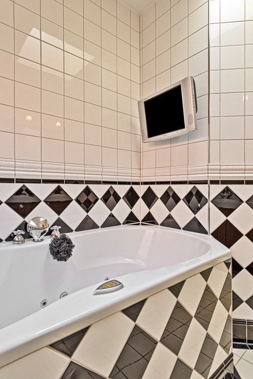 The spacious bathroom provides multiple facilities for complete relaxation. There is a generous rain shower and a comfortable whirlpool bath in which to unwind after a long day. The vanity unit features a double washbasin, giving you plenty of space to start the day together.
