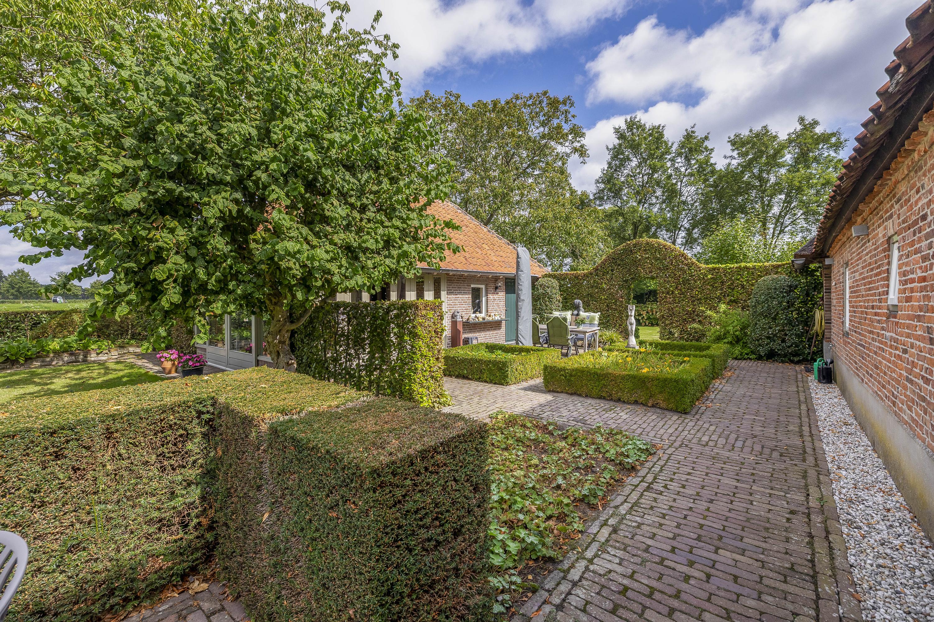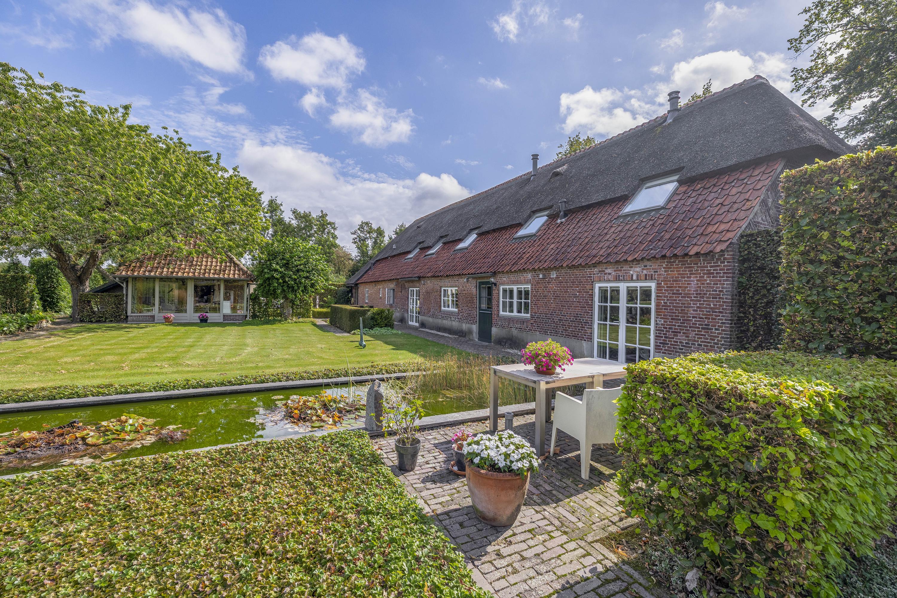 Behind the house and on the sides is a beautifully landscaped garden. On the left side is a nice, spacious area with a lawn, plant borders, old baked clinker paving, and various beech hedges. At the rear, you can enjoy a beautiful view, a large pond (with biological filter), a spacious lawn, plant borders, and mature vegetation. The garden is well laid out and well maintained. There is a double driveway on the right side of the property. The garden even offers the possibility of keeping small animals. There is also a section of the garden with a “lovers' lane.” To the left of the house is a landscaped jeu-de-boules court.