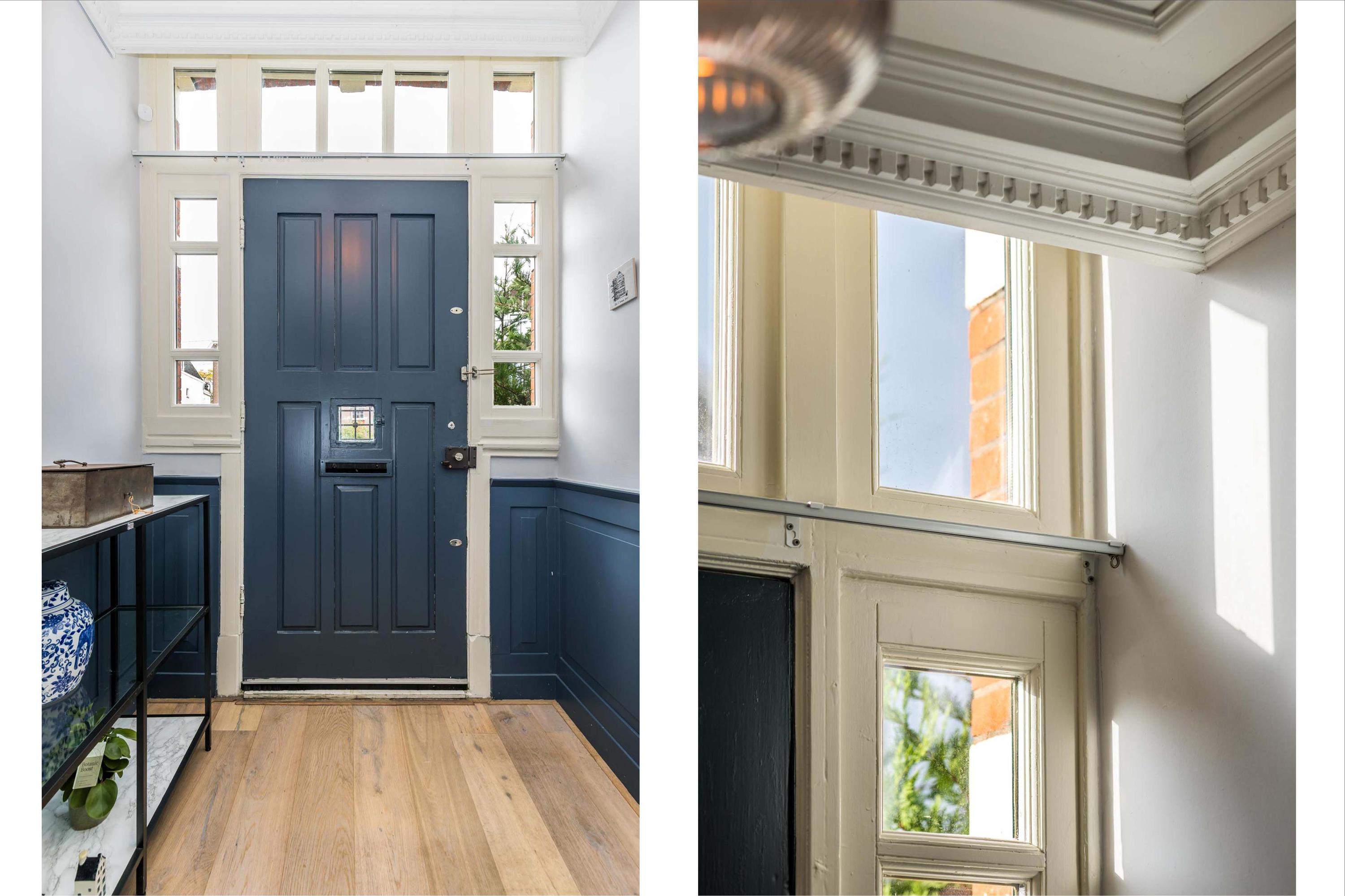 Presentative entrance with high ceilings and original details. From the hall, access leads to the modern toilet and the spacious living area with beautiful oak flooring.