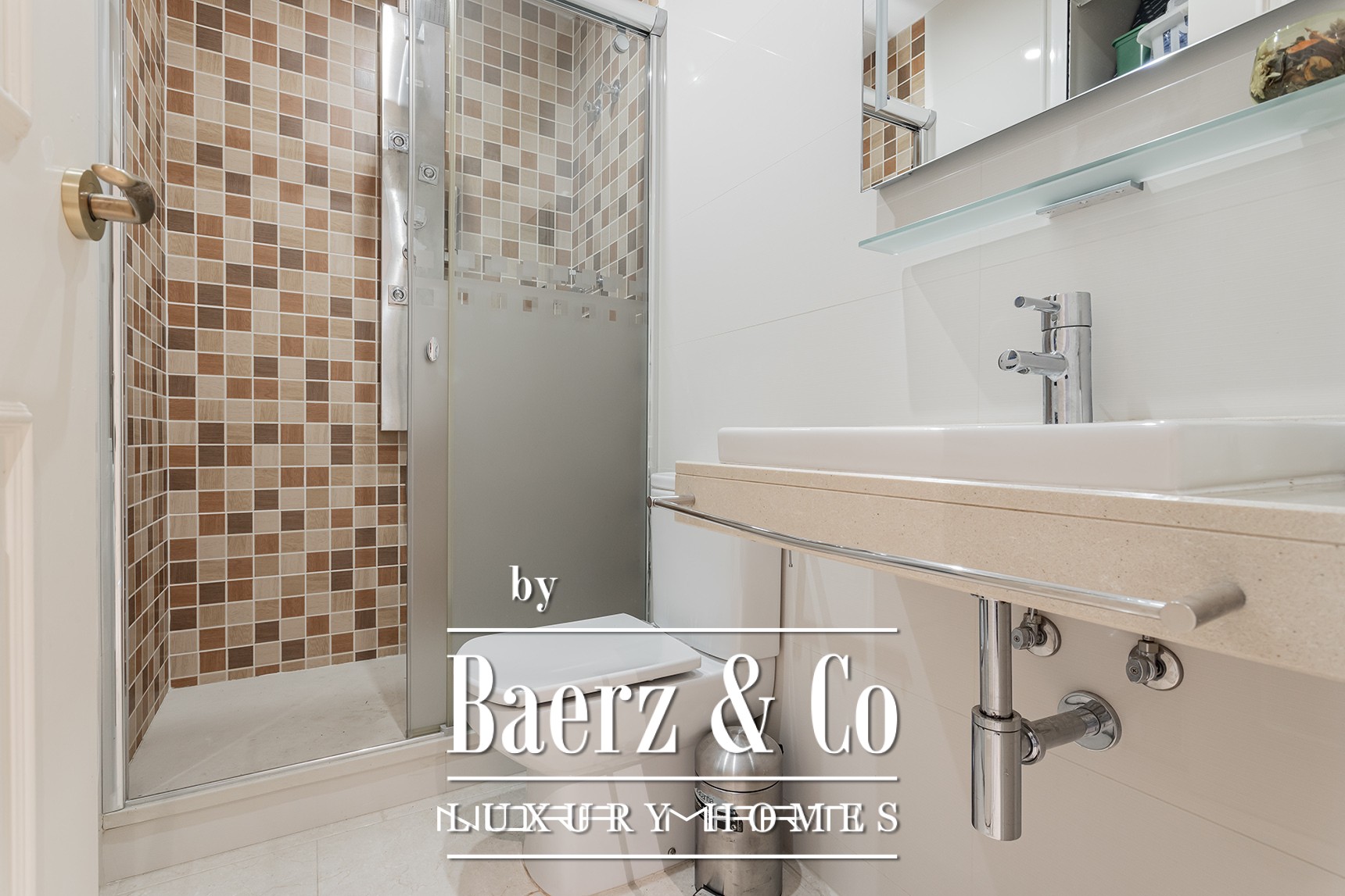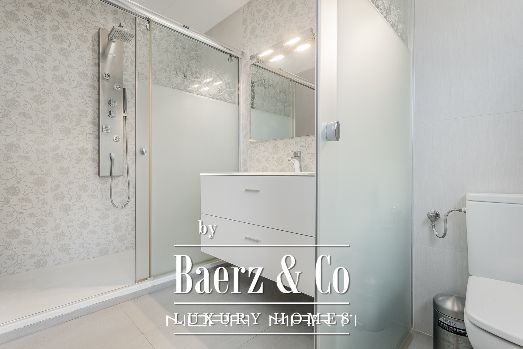 The second floor serves four bedrooms. Among them, a double bedroom features bespoke wardrobes, an ensuite with shower, and unobstructed sea views. Another double suite faces the street and extends onto a 16 m² balcony, while two single bedrooms look onto the garden, sharing a spacious bathroom with bathtub.